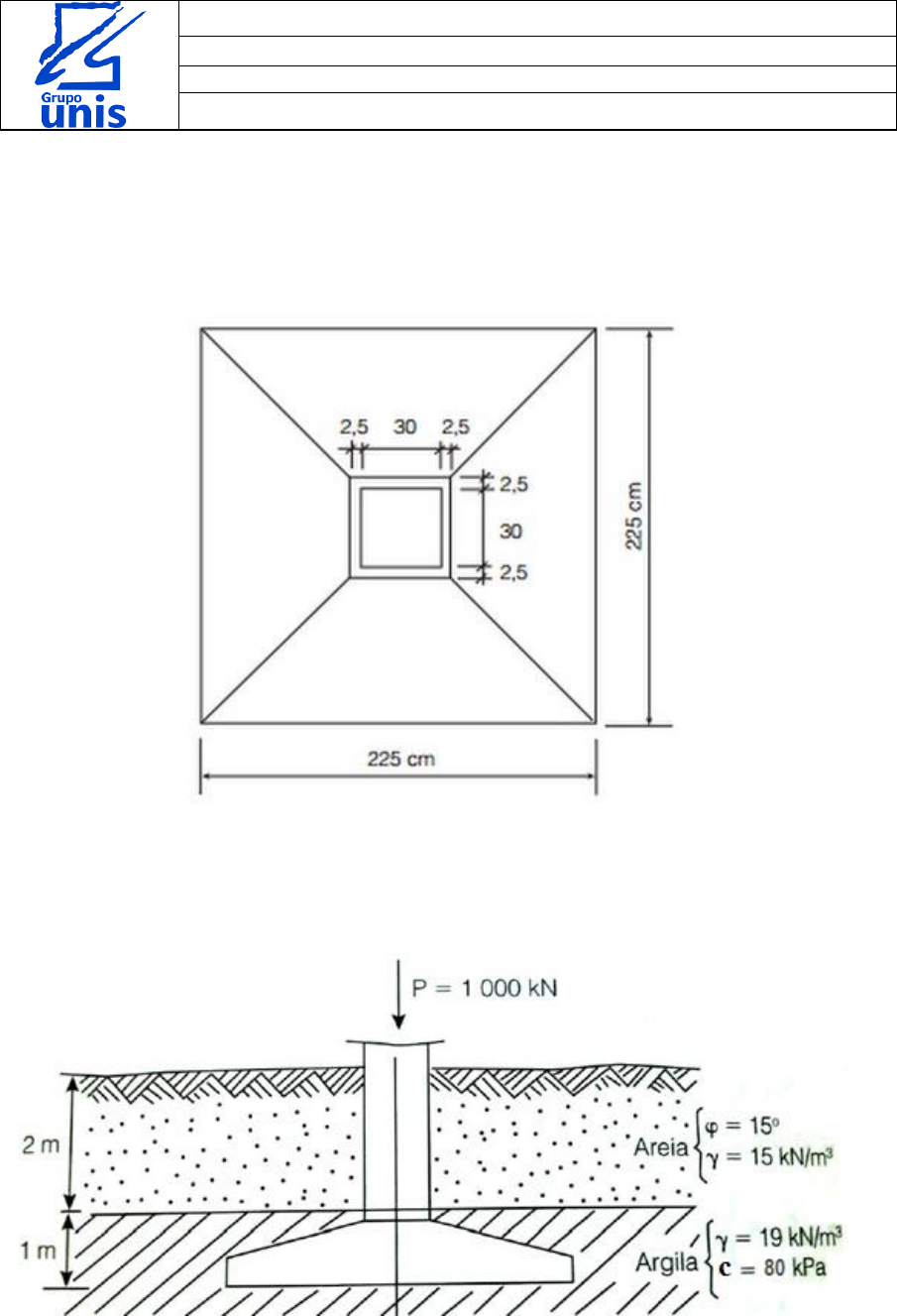 CENTRO UNIVERSITÁRIO DO SUL DE MINAS - UNIS - MG CURSO DE PÓS-GRADUAÇÃO EM ENGENHARIA DE ESTRUTURAS PROFESSOR: M.e JOÃO MARCOS GUIMARÃES RABELO 1ª LISTA DE EXERCÍCIOS – Valor 3,0 pontos 1) Para a sapata da figura abaixo, determinar a capacidade de carga utilizando os métodos de Terzagui; Bowles e Meyerhof ou Skemptom; Albiero e Cintra; Meyerhof; Tabela NBR ampliada por Berberian; considerando a sondagem de referência em anexo. Considerar a cota de assentamento da fundação a 2,0 m de profundidade. 2) Calcular as dimensões da base de uma sapata quadrada assentada no perfil de solo indicado na figura abaixo, pela teoria proposta por Terzaghi. Considera que todo o bulbo de tensões está situado na camada de Argila. Lembre-se que . Boletim de sondagem para o exercício 01. 3) Com base no perfil geotécnico indicado a seguir e usando a teoria de Terzaghi com Fator de Segurança FS = 3, pede-se verificar se é possível utilizar fundações rasas apoiadas na cota -3,00m. Comente o resultado. Adotar como carga média nos pilares 3000 kN. 4) Estimar a capacidade de carga de uma sapata quadrada com dimensões B = L = 3,00m assentada a cota - 1,50m, conforme boletim de sondagem SPT fornecido a seguir. Orientação: Dimensionar segundo a teoria de Terzaghi, apontando o tipo de ruptura do terreno e verificando se não haverá ruptura das duas camadas consideradas, levando em conta o Fator de Segurança e a tensão atuante média nas camadas.