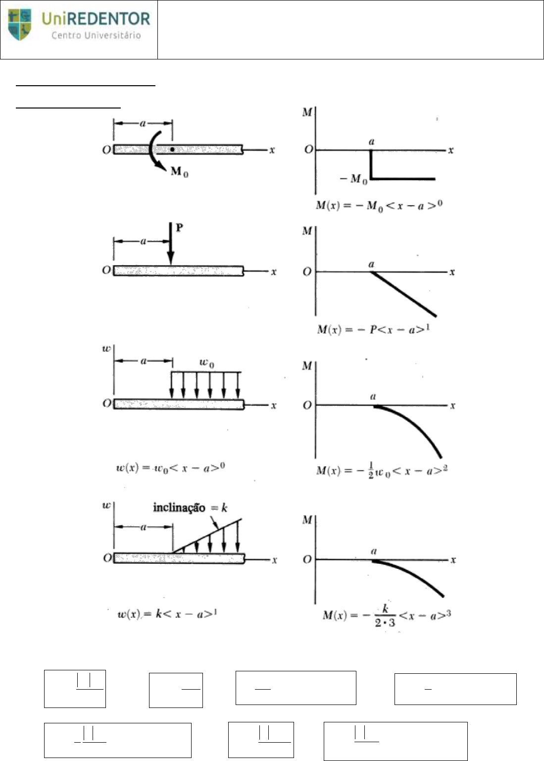 FORMULÁRIO PARA V1: Funções Singulares 1/ = M(x)/EI y’’ = M(x)/EI y’ = tg (x) adm máx mín M W máx mín y I W )tan( 12 3 gularseçãore bh I )tan( 2 gularseçãore h Ymáx )tan( 2 3 gularseçãore A V máx máx tI QV máx máx . )arg( aslperfisabas A V alma máx máx CENTRO UNIVERSITÁRIO REDENTOR CURSOS DE GRADUAÇÃO EM ENGENHARIA CIVIL E MECÂNICA RESISTÊNCIA DOS MATERIAIS II Os perfis de abas largas (norma americana) são nomeados pela letra W (“wide”) seguida da altura nominal em milímetros e da massa (peso) em kg (em kgf) por metro de comprimento.