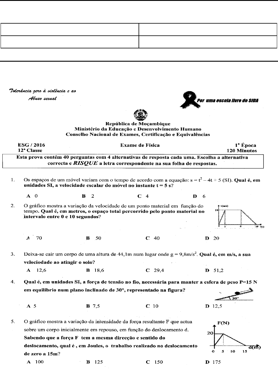 1 PROBLEMAS RESOLVIDOS DO EXAME DE FÍSICA 12ª Classe 2016/1ª ÉPOCA Luís Manuel Andrade Contacto telefónico: +258 847849507 E-mail: andradeluis708@gmail.com Beira, Agosto de 2018. [Problemas] 2 Problemas Resolvidos do Exame de Física 2016/1ª época Luís Manuel Andrade 3 Problemas Resolvidos do Exame de Física 2016/1ª época Luís Manuel Andrade 4 Problemas Resolvidos do Exame de Física 2016/1ª época Luís Manuel Andrade 5 Problemas Resolvidos do Exame de Física 2016/1ª época Luís Manuel Andrade 6 Problemas Resolvidos do Exame de Física 2016/1ª época Luís Manuel Andrade 7 Luís Manuel Andrade PROBLEMAS RESOLVIDOS DO EXAME DE FÍSICA 12ª Classe 2016/1ª ÉPOCA [Resolução] 1. Dados: s = t2 − 4t + 5 (SI); v =? t = 5s Resolução: Comparando a equação do espaço para o MRUV s = so + vot + a 2 t2 Com a equação dada temos que: xo = 5 m; vo = −4m/s; a = 2m/s 2 v(t) = vo + a. t → v(t) = −4 + 2. t ↔ v(5) = −4 + 2.5 = −4 + 10 = 6m/s∎ Opção: D 2. Dados: St =? St = área do trapézio = (B + b) 2 × h St = (10 + 4) 2 × 10 St = 14 2 × 10 = 70 m∎ Opção: A 3. Dados: h = 44,1 m; v =? g = 9,8 m/𝑠2 h = g × t2 2 → t = √ 2 × h g = √ 2 × 44,1 9,8 = √9 = 3s v = g. t = 9,8 × 3 = 29,4 m/s∎ Opção: C 8 Problemas Resolvidos do Exame de Física 2016/1ª época Luís Manuel Andrade 4. Dados: P = 15 N; T =? Sen 30° = Px P → Px = P. Sen 30° T − Px = 0 T − P. Sen 30° = 0 T = P. Sen 30° T = 15 × 1 2 = 7,5 N∎ Opção: B 5. O trabalho realizado pela força variável F é numericamente igual à área sob a curva do gráfico da força F em função do deslocamento d. Calculando o valor desse trabalho para o deslocamento da origem até o ponto d = 15 m, temos: W = Área do triângulo = b × h 2 W = 15 × 20 2 = 300 2 = 150 J∎ Opção: C 6. Dados: : m = 3Kg; v =? x = 10m; Resolução: Essa questão pode ser resolvida mediante o teorema de energia cinética, em que trabalho = variação da energia cinética: W = ∆EC → W = mv2 2 − mvo 2 2 9 Problemas Resolvidos do Exame de Física 2016/1ª época Luís Manuel Andrade Primeiro deve determinar-se o trabalho que é igual a área da figura: W = Área do triângulo = b × h 2 W = 10 × 30 2 = 300 2 = 150 J W = mv2 2 → v = √ 2 × W m = √ 2 × 150 3 v = √100 = 10 m/s∎ Opção: B 7. Dados: k = 40 N/m; x = 8cm = 8. 10−2m; EPel =? Resolução: A energia potencial elástica é dada por: EPel = kx2 2 EPel = kx2 2 = 40 .(8.10−2)2 2 = 0,128 J∎ Opção: A 8. Dados: m = 0,50 Kg; a = 0,30 m/s2; Q =? Resolução Neste exercício pode se aplicar o teorema do impulso: I = Q ↔ F.∆t = Q → Q = m. a. ∆t = 0,5 × 0,3 × 8 = 1,2 kg. m s ∎𝐎𝐩çã𝐨: 𝐁 9. Dados: VN = 20 V; E0 = 20 N/C ; d = ? Resolução: Com base na expressão do potencial e campo eléctrico, temos: 10 Problemas Resolvidos do Exame de Física 2016/1ª época Luís Manuel Andrade V = K Q d d V d/2 2V d/3 3V 2d V/2 3d V/3 E = K |Q| d2 d E d/2 4E d/3 9E 2d E/4 3d E/9 Com base nestes conceitos de V e E, tem-se que: EN = 4. EO = 4.20 = 80 N C ; pois a distância reduz − se a metade E = K |Q| d2 = K Q d × 1 d 80 = 20 × 1 d ↔ 80d = 20 → d = 20 80 = 2 8 d = 1 4 ∎ 𝐎𝐩çã𝐨: 𝐂 10. Dados: 1kWh = 3 Mt; E =? (Mt); P = 100W = 0,1kW; U = 220 V; ∆t = 60 h Resolução E = P. ∆t = 0,1kW × 60 h = 6kWh 1 kWh → 3 Mt 6 kWh → x Mt ↔ x = 6×3 1 ↔ x = 18 Mt∎ 𝐎𝐩çã𝐨: 𝐂 11. Dados: P = 440 W; U = 220 V; R =? Resolução: P = U2 R → R = U2 P ↔ R = 2202 440 = 110 Ω∎ 𝐎𝐩çã𝐨: 𝐃 12. Dados: v = 107m/s; R=4 m; q/m=108 C/kg →m/q=10−8 kg/C; B=? Resolução: 11 Problemas Resolvidos do Exame de Física 2016/1ª época Luís Manuel Andrade R = mv qB → B = mv qR ↔ B = 10−8 × 107 4 = 25 × 10−3T∎ 𝐎𝐩çã𝐨: 𝐀 13. Dados: Q=3000 cal; m=150 g; ∆T = 20℃; c=? Resolução: Q = mc∆T → c = Q m∆T = 3000 150 × 20 = 1 cal/g℃∎ 𝐎𝐩çã𝐨: 𝐂 14. Dados: λ1 λ2 =? T1 = 2100 K; T2 = 4200 K Resolução: Usando-se a equação de Wien: λmáx = b T λ1 = b T1 ; λ2 = b T2 λ1 λ2 = b T1 b T2 = T2 T1 = 4200 2100 = 2∎ 𝐎𝐩çã𝐨: 𝐂 15. Dados: f =? ; b = 2,88. 10−3 m.K Resolução: Da figura, observa-se que: T = 1200K = 1,2. 103K λmáx = b T c = λf → λ = c f c f = b T → f = cT b = 3.108 × 1,2. 103 2,88. 10−3 = 3,6. 1011 2,88. 10−3 = 1,25.1014 Hz∎ 𝐎𝐩çã𝐨: 𝐁 16. Com base no espectro óptico, as cores que compõem a luz visível estão ordenadas de acordo com o comprimento de onda, seguindo a ordem: UV < Violeta < Azul < Verde < Amarela < Laranja < Vermelha < IV ∎ 𝐎𝐩çã𝐨: 𝐃 12 Problemas Resolvidos do Exame de Física 2016/1ª época Luís Manuel Andrade 17. Dados: f =? h = 4,14. 10−15 eV.s Resolução: ∆E = |Ef − Ei|=|−1,5 − (−13,6)| = 12,1 eV ∆E = hf → f = ∆E h = 12,1 4,14. 10−15 = 2,92. 1015Hz∎ 𝐎𝐩çã𝐨: 𝐁 18. Dado: ϕ = 2,28 eV; fo =? h = 6,625. 10 −34 J. s = 4,14. 10−15 eV.s Resolução: ϕ = hfo → fo = ϕ h = 2,28 4,14. 10−15 = 0,55.1015 = 5,5. 1014Hz∎ 𝐎𝐩çã𝐨: 𝐃 19. Com base no tubo de Raios-X, III representa Raios catódicos ou electrões∎ 𝐎𝐩çã𝐨: 𝐂 20. Quando a transição ocorrer de um nível mais baixo para um nível mais alto de energia, ocorre a absorção de energia. 𝐎𝐩çã𝐨: 𝐁 21. Dados: λ =? (nm); U = 20 kV = 20. 103V; h = 6,625.10−34 J. s; c = 3. 108m/s; e = 1,6.10−19C Resolução: eU = hc λmin → λmin = hc eU = 6,625.10−34 × 3. 108 1,6.10−19 × 2. 104 = 19,875. 10−26 3,2. 10−15 = 6,2. 10−11 m 1nm → 10−9m x → 6,2.10−11 m ↔ x = 6,2. 10−2nm = 0,062 nm∎ 𝐎𝐩çã𝐨: 𝐀 22. Dados: ϕ = 2,3 eV ; Ecmáx =? ∶ λ = 200 nm = 200. 10 −9 = 2. 10−7m; h = 4,14. 10−15 eV.s; c = 3. 108m/s; Resolução E = Ecmáx + ϕ → Ecmáx = E − ϕ 13 Problemas Resolvidos do Exame de Física 2016/1ª época Luís Manuel Andrade Ecmáx = hc λ − ϕ = 4,14. 10−15 × 3. 108 2. 10−7 − 2