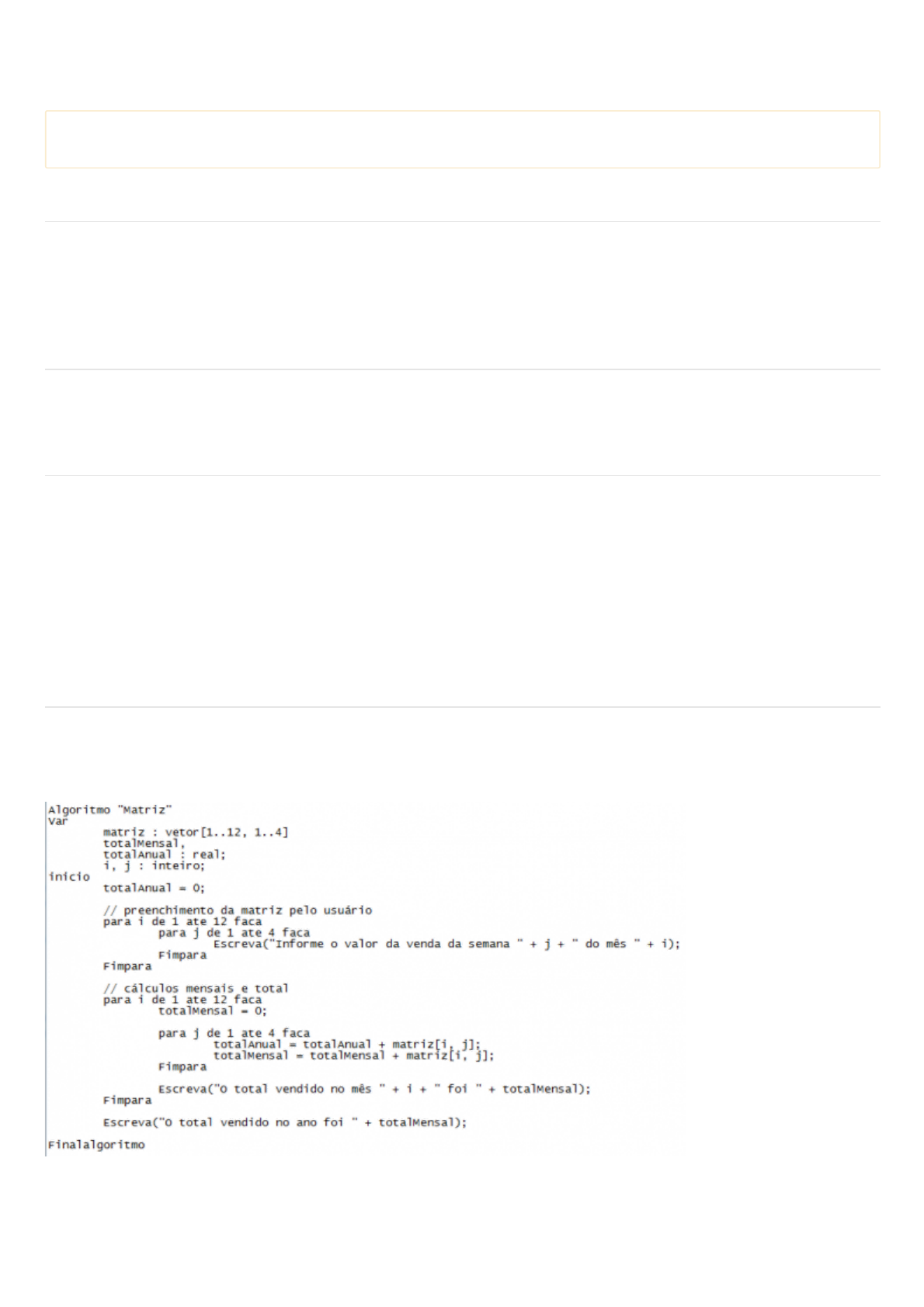 29/08/2018 UNIASSELVI - Centro Universitário Leonardo Da Vinci - Portal do Aluno - Portal do Aluno - Grupo UNIASSELVI https://portaldoalunoead.uniasselvi.com.br/ava/avaliacao/avaliacao_lista.php 1/1 3. Avaliação Final (Discursiva) - Individual e sem Consulta (421088) - Lógica e Técnicas de Programação (ADS05) Prova: 7059394 QUESTÃO: 1. Os algoritmos são utilizados para as mais variadas finalidades. Podem ser utilizados algoritmos para editar textos e planilhas, compartilhar informações em redes sociais, ler e enviar e-mails e até mesmo operações bancárias, como depósitos e saques de valores monetários. Disserte sobre a definição de algoritmos para a área de programação de computadores. RESPOSTA ESPERADA: Os algoritmos são uma sequência finita de passos encadeados e lógicos para resolver um dado problema, os quais levam à execução de uma tarefa. QUESTÃO: 2. As matrizes são conhecidas como estruturas de dados homogêneas multidimensionais, em que a utilização mais comum é a de duas dimensões, por ser análoga a uma tabela. Crie um algoritmo que leia dados do usuário preenchendo uma matriz de duas dimensões 12 x 4 com os valores semanais de venda de uma loja em que cada linha represente um mês do ano e cada coluna represente uma semana do mês. Para fins de simplificação, considere que todos os meses têm apenas 4 semanas. Ao final, seu algoritmo deve calcular e imprimir: a) O total vendido em cada mês do ano. b) O total vendido no ano. RESPOSTA ESPERADA: O acadêmico deve desenvolver um algoritmo conforme a resposta esperada (imagem anexa), definindo a funcionalidade para inserção dos valores e cálculos solicitados, além de respeitar a endentação e o uso correto dos comandos de entrada e saída, possibilitando que ao final sejam impressos os resultados solicitados.