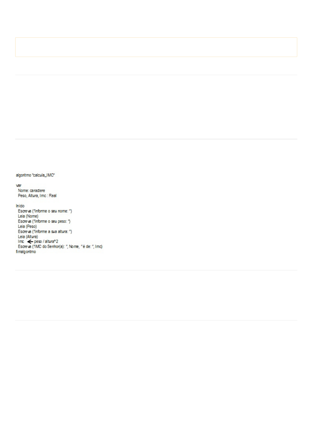 29/08/2018 UNIASSELVI - Centro Universitário Leonardo Da Vinci - Portal do Aluno - Portal do Aluno - Grupo UNIASSELVI https://portaldoalunoead.uniasselvi.com.br/ava/avaliacao/avaliacao_lista.php 1/2 3. Avaliação Final (Discursiva) - Individual e sem Consulta (401223) - Lógica e Técnicas de Programação (ADS05) Prova: 6095432 QUESTÃO: 1. Na construção de um algoritmo, uma das suas principais fases é o processamento dos dados informados pelo usuário, em que poderão ser realizadas diversas operações aritméticas sobre as variáveis declaradas ou valores previamente especificados, a fim de obter o resultado final desejado. Neste sentido, desenvolva um algoritmo que possibilite ao usuário informar o seu nome, peso e altura e posteriormente calcular o seu IMC (índice de massa corporal), o qual é calculado utilizando a seguinte fórmula: (peso / altura elevado ao quadrado). Ao final, exiba uma mensagem ao usuário com o seu nome e IMC calculado. RESPOSTA ESPERADA: O acadêmico desenvolveu o algoritmo conforme a resposta esperada (imagem a seguir), definindo corretamente o nome do algoritmo, as variáveis e o cálculo para obtenção do IMC, além de respeitar a endentação e o uso correto dos comandos de entrada e saída, possibilitando que ao final seja impressa a mensagem. QUESTÃO: 2. A partir da construção de um algoritmo, podem ser desenvolvidos programas que executam as mais variadas operações matemáticas através dos operadores aritméticos e lógicos. Diante disso, desenvolva um algoritmo que possibilite a leitura do nome de um advogado, valor da causa e percentual que será cobrado a título de honorários sobre o valor da causa. Ao final, deverá ser impressa uma mensagem informando o nome do advogado e o valor dos honorários ao qual este faz jus. RESPOSTA ESPERADA: O acadêmico desenvolveu o algoritmo conforme a resposta esperada (imagem a seguir), definindo corretamente o nome do algoritmo, as variáveis e o cálculo para a obtenção dos honorários, além de respeitar a endentação e o uso correto dos comandos de entrada e saída, possibilitando que ao final seja impressa a mensagem. 29/08/2018 UNIASSELVI - Centro Universitário Leonardo Da Vinci - Portal do Aluno - Portal do Aluno - Grupo UNIASSELVI https://portaldoalunoead.uniasselvi.com.br/ava/avaliacao/avaliacao_lista.php 2/2