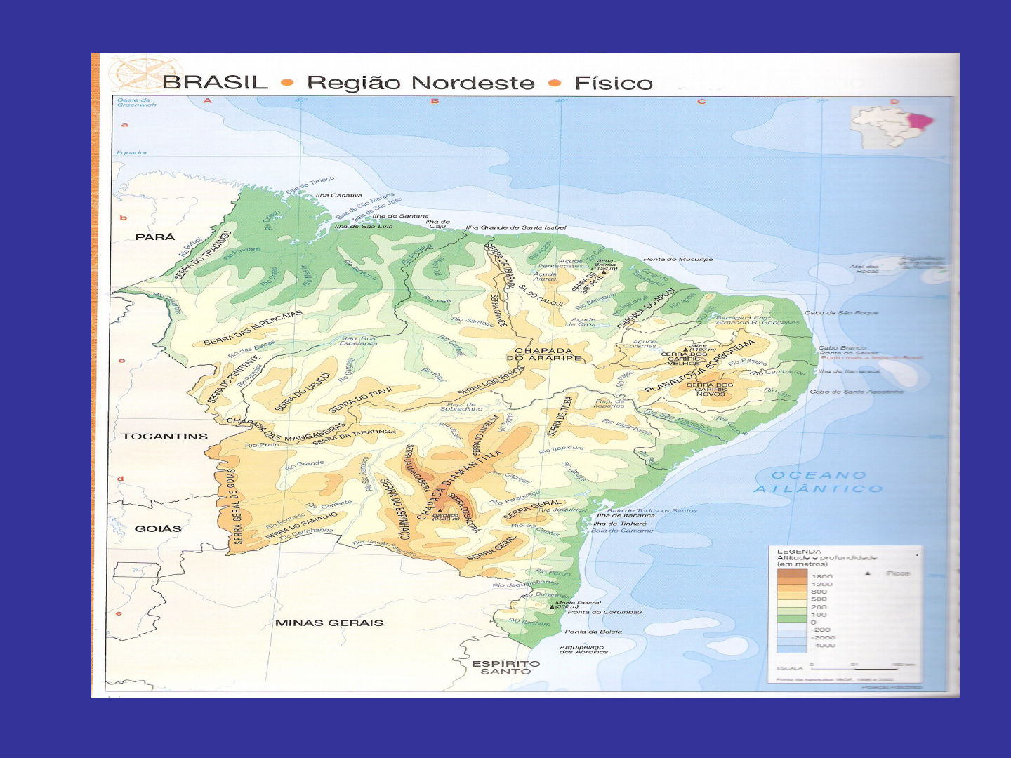 • 01.Planaltos e Chapadas da Bacia do Parnaíba - constituem-se também de terrenos de uma bacia sedimentar, estendendo-se das áreas centrais do país (GO-TO), até as proximidades do litoral, onde se alargam, na faixa entre Pará e Piauí, sendo cortados de norte a sul, pelas águas do rio Parnaíba. Aí encontramos a predominância das formas tabulares, conhecidas como chapadas. • 02.Planalto da Borborema - corresponde a uma área de terrenos formados de rochas pré cambrianos e sedimentares antigas, aparecendo na porção oriental no nordeste brasileiro, a leste do estado de Pernambuco, como um grande núcleo cristalino e isolado, atingindo altitudes em torno de 1.000 m. • 03.Depressão Sertaneja e do São Francisco - ocupam uma extensa faixa de terras que se alonga desde as proximidades do litoral do Ceará e Rio Grande do Norte, até o interior de Minas Gerais, acompanhando quase todo o curso do rio São Francisco. Apresentam variedade de formas e de estruturas geológicas, porém destaca-se a presença do relevo tabular, as chapadas, como as do Araripe (PE-CE) e do Apodi (RN). • 04.Planícies e Tabuleiros Litorâneos - correspondem a inúmeras porções do litoral brasileiro e quase sempre ocupam áreas muito pequenas. Geralmente localizam se na foz de rios que deságuam no mar, especialmente daqueles de menor porte. Apresentam-se muito largas no litoral norte e quase desaparecem no litoral sudeste. E em trechos do litoral nordestino, essas pequenas planícies apresentam-se intercaladas com áreas de maior elevação as barreiras-, também de origem sedimentar. • Espinhaço • Faz parte de um conjunto de terras elevadas e se estende desde os arredores de Juazeiro na Bahia até a parte central de Minas Gerais. Abrange na Região, a Serra Geral do centro-norte de Minas e Bahia até os arredores do Pico das Almas e a Chapada Diamantina. • Grandes depressões • Os maiores destaques são a Depressão Sanfranciscana, a Cearense e a do Meio Norte. A Sanfranciscana situa- se ao longo do percurso do Rio São Francisco, especialmente na Bahia e em Pernambuco. A Cearense limita-se ao sul pela Chapada do Araripe, a leste pela Borborema e a oeste pela frente da "cuesta" da Ibiapaba. • Existe nesta depressão uma série de maciços "inselbergue", destacando-se dentre eles o de Baturité e a da Meruoca. A do Meio-Norte, localizada no Nordeste ocidental, teve a sua superfície retrabalhada pela erosão fluvial, originando uma série de vales encaixados. • Chapadões e chapadas • Compreendem a porção meridional dos Estados do Maranhão e do Piauí e as "cuestas", delimitando quase toda a bacia sedimentar do Nordeste ocidental. É possível também encontrar testemunhos sedimentares na porção oriental da Região, a exemplo da Chapada do Araripe, compreendida entre os Estados do Piauí, Ceará e Pernambuco, e a do Apodi, no Rio grande do Norte. Massas de ar • 1.Massa Equatorial Contineltal (mEc) • É uma massa quente e instável originada na Amazônia Ocidental, que atua sobre todas as regiões do país. Apesar de continental é uma massa úmida, em razão da presença de rios caudalosos e da intensa transpiração da massa vegetal da Amazônia, região em que provoca chuvas abundantes e quase diárias, principalmente no verão e no outono. No verão, avança para o interior do país provocando as “chuvas de verão”. • 2.Massa Equatorial Atlântica (mEa) É quente, úmida e originária do Atlântico Norte (próximo à Ilha de Açores). Atua nas regiões litorânes do Norte do Nordeste, principalmente no verão e na primavera, sendo também formadoras dos ventos alísios de nordeste. • 3.Massa Tropical Atlântica (mTa) Origina-se no Oceano Atlântico e atua na faixa litorânea do Nordeste ao Sul do país. Quente e úmida, provoca as chuvas frontais de inverno na região Nordeste a partir do seu enconttro com a Massa Polar Atlântica e as chuvas de relevo nos litorais sul e sudeste, a partir do choque com a Serra do Mar. Também é formadora dos ventos alísios de sudeste. • 4.Massa Polar Atlântica (mPa) Forma-se no Oceano Atlântico sul (próximo à Patagônia), sendo fria e úmida e atuando subretudo no inverno no litoral nordestino (causa chuvas frontais), nos estados sulinos (causa queda de temperatura e geadas) e na Amazônia Ocidental (causa fenômeno da friagem, queda brusca na temperatura). • 1.O clima Tropical Semi-Árido • Caracteriza-se pela escassez e pela irregularidade de chuvas. O índice de chuvas é inferior a 800 mm/ano, as temperaturas médias em torno de 27º C e a amplitude térmica por volta de 5º C. • O clima é controlados por massas de ar equatoriais e tropicais. • Irregularidade de chuvas, com chuvas concentradas no verão e outono(janeiro-maio). A “quadra chuvosa”. • 2.Clima Tropical Atlântico ou Litorâneo Úmido • Manifesta-se no litoral do Nordeste e do Sudeste, sendo controlado pela Massa Tropical Atlântica, que causa no verão as chamadas chuvas orográficas ou de relevo, ao chocar-se com as serras do Planalto Atlântico (Chapada da Borborema, Serras do Mar, da Mantiqueira, etc.). No litoral nordestino, há concentração de chuvas no outono e no inverno, em razão do choque da Massa Polar Atlântica (mais intensa nesta época) com a Tropical Atlântica. • 3.Tropical de Altitude no Nordeste. • É caracterizado por ter verões amenos e chuvosos, e invernos frios a muito frios, e secos. No Nordeste ocorre em áreas com o período de chuva inverso ao que ocorre no sudeste brasileiro, com um período seco no verão e chuvoso no inverno, sendo assim , um clima parecido com o mediterrâneo e que ocorre nas regiões altas no agreste nordestino em cidade como: Em Rio de Contas, Morro do Chapéu, Piatã na BA, excetuando-se Vitória da Conquista, cidade, em que o clima é úmido o ano inteiro portanto, ocorrendo:Em Triunfo e Garanhuns no PE. e em Ubajara e Guaramiranga no CE. • Equatorial úmido e Equatorial Sub-ú