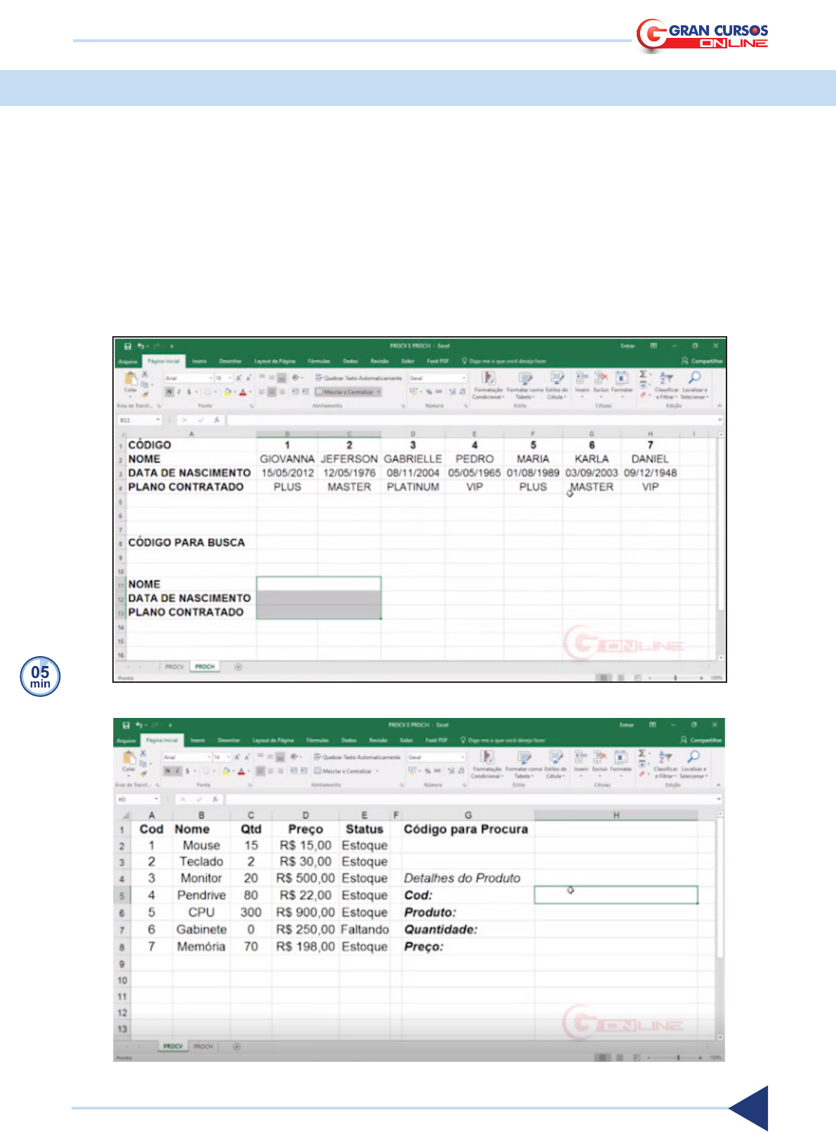 1 Excel 2016 – PROCV e PROCH INFORMÁTICA www.grancursosonline.com.br Produção: Equipe Pedagógica Gran Cursos Online EXCEL 2016 – PROCV E PROCH O PROCV faz uma procura na vertical. =PROCV(CB;INT;COLUNA;0OU1) O PROCH tem praticamente a mesma sintaxe: =PROCH(CB;INT;LINHA;0OU1) 2 Excel 2016 – PROCV e PROCH INFORMÁTICA www.grancursosonline.com.br AN O TA Ç Õ ES Produção: Equipe Pedagógica Gran Cursos Online A aplicação: 3 Excel 2016 – PROCV e PROCH INFORMÁTICA www.grancursosonline.com.br AN O TAÇ Õ ES Produção: Equipe Pedagógica Gran Cursos Online O 1 é para verdadeiro e 0 é para falso. Colocando o 0, aparece o erro. 4 Excel 2016 – PROCV e PROCH INFORMÁTICA www.grancursosonline.com.br AN O TA Ç Õ ES Produção: Equipe Pedagógica Gran Cursos Online Ao digitar um código que não existe, o erro persiste. Outro PROCV: 5 Excel 2016 – PROCV e PROCH INFORMÁTICA www.grancursosonline.com.br AN O TAÇ Õ ES Produção: Equipe Pedagógica Gran Cursos Online Aplicando o código 2: Aplicando o código 5: 6 Excel 2016 – PROCV e PROCH INFORMÁTICA www.grancursosonline.com.br AN O TA Ç Õ ES Produção: Equipe Pedagógica Gran Cursos Online Aplicando o código 3: Quando é aplicado um índice que não existe, aparece o valor mais próximo dele. 7 Excel 2016 – PROCV e PROCH INFORMÁTICA www.grancursosonline.com.br Produção: Equipe Pedagógica Gran Cursos Online Exemplo de PROCH (procura na horizontal): Atenção! No PROCV, o índice é a coluna, o retorno do resultado é por linha. No PROCH, o índice é da linha, o retorno é por coluna. Exercícios 1. (2013/IADES/SUDAM) A figura a seguir é parte de uma planilha do Microsoft Excel 2003, versão em português, e apresenta os seis principais produtores mundiais de frutas no ano de 2006. 8 Excel 2016 – PROCV e PROCH INFORMÁTICA www.grancursosonline.com.br AN O TA Ç Õ ES Produção: Equipe Pedagógica Gran Cursos Online Em uma célula formatada apropriadamente, foi atribuída a fórmula =PROCV(B4;B2:C7;2). Com base nessas informações, assinale a alternativa que contém o valor correto retornado por essa fórmula: a. 3. b. Brasil. c. 39.851. d. #N/D. e. 28.940. Comentário B4 é Brasil. A coluna B é a 1, e a C é a 2. A coluna A está fora da busca. O índice da coluna é o 2. 2. (2013/IADES/SUDAM) A figura a seguir é parte de uma planilha do Microsoft Excel 2003, versão em português. Em uma célula formatada apropriadamente, foi atribuída a fórmula =PROCV(A3;A2:C6;3;FALSO). Com base nessas informações, assinale a alternativa que contêm o valor correto retornado por essa fórmula: a. Financeiro. b. M-0032011. c. João Costa. d. #REF!. e. Madalena Santos. 9 Excel 2016 – PROCV e PROCH INFORMÁTICA www.grancursosonline.com.br AN O TAÇ Õ ES Produção: Equipe Pedagógica Gran Cursos Online Comentário O código da busca é A3. O retorno é para “financeiro”. 3. (2017/FUNDAÇÃO LA SALLE/SUSEPE/RS) A figura abaixo mostra parte de uma planilha de Excel 365 contendo telefones de alguns Departamentos da SUSEPE/RS. Nesta planilha, foi adicionado um campo código, para facilitar a pesquisa a números de telefone. Considere esta planilha para responder a questão. O funcionamento desta planilha considera que ao informar um código de de- partamento válido, na célula C8, o telefone do respectivo departamento será apresentado na célula C9. Para que o resultado seja o correto, é necessário utilizar a função PROCV do Excel, incluindo o seguinte código na célula C9: a. =PROCV(C9;A2:C6;3;FALSO). b. =PROCV(C9;C2:C6;3; FALSO). c. =PROCV(C8;A2:C6;3; FALSO). d. =PROCV(C8;C2:C6;3; FALSO). e. =PROCV(C8:C9;C2:C6;3; FALSO). Comentário D4 se refere ao número de telefone. O índice da busca se dá em C8. O intervalo da busca vai de A2 até C6. 10 Excel 2016 – PROCV e PROCH INFORMÁTICA www.grancursosonline.com.br AN O TA Ç Õ ES Produção: Equipe Pedagógica Gran Cursos Online 4. (2012/CONSULPLAN/PREFEITURA DE PORTO VELHO) Com base na uti- lização da função PROCV do Microsoft Excel (2003/2007 – configuração pa- drão), analise o fragmento de planilha. Ao ser aplicada à célula D2 a fórmula =PROCV (C2;A4:F18;5;FALSO), ob- tém-se como resultado da pesquisa: a. Computadores SA. b. 19-07-1996. c. Rio de Janeiro. d. Brasil. e. Erro #N/D. Comentário FALSO significa que não pode ser um valor aproximado. 5. (2013/FEPESE/CELESC) A diferença entre as funções PROCV e PROCH do MS Excel 2010 em português é: a. PROCH procura na vertical enquanto PROCV realiza buscas na horizontal. b. PROCH retorna um valor da mesma linha onde o valor a encontrar é en- contrado, enquanto PROCV retorna um valor da mesma coluna. 11 Excel 2016 – PROCV e PROCH INFORMÁTICA www.grancursosonline.com.br AN O TAÇ Õ ES Produção: Equipe Pedagógica Gran Cursos Online c. PROCV retorna um valor da mesma linha onde o valor a encontrar é en- contrado, enquanto PROCH retorna um valor da mesma coluna. d. PROCV é uma evolução de PROCH e foi introduzida no MS Excel 2010 para substituir PROCH, mais antiga e em desuso. e. PROCV retorna o valor encontrado enquanto PROCH retorna somente uma referência à coluna do valor encontrado. Comentário PROCH procura na horizontal, e PROCV realiza buscas na vertical. 6. (2015/FCC/DPE/RR) Considere a planilha abaixo, criada no LibreOffice Calc 4.1, em português. Na célula B7 foi digitada uma fórmula que faz com que, ao se digitar na célula A7 a sigla de um dos Tribunais constantes nas células A2, A3 ou A4, o nome do Tribunal correspondente apareça na célula B7. A fórmula usada para essa finalidade foi: a. =PROCH(A7;A2:B4;2) b. =PROCV(A7;A2:A4;2) c. =PROC(A7;A2:B4;2) d. =PROC(A7;A2:A4;2) e. =PROCV(A7;A2:B4;2) 12 Excel 2016 – PROCV e PROCH INFORMÁTICA www.grancursosonline.com.br AN O TA Ç Õ ES Produção: Equipe Pedagógica Gran Cursos Online Comentário Trata-se de PROCV. 7. (2015/VUNESP/SAEG) Considere a planilha do MS-Excel 2010, na sua con- figuração padrão, exposta na fi