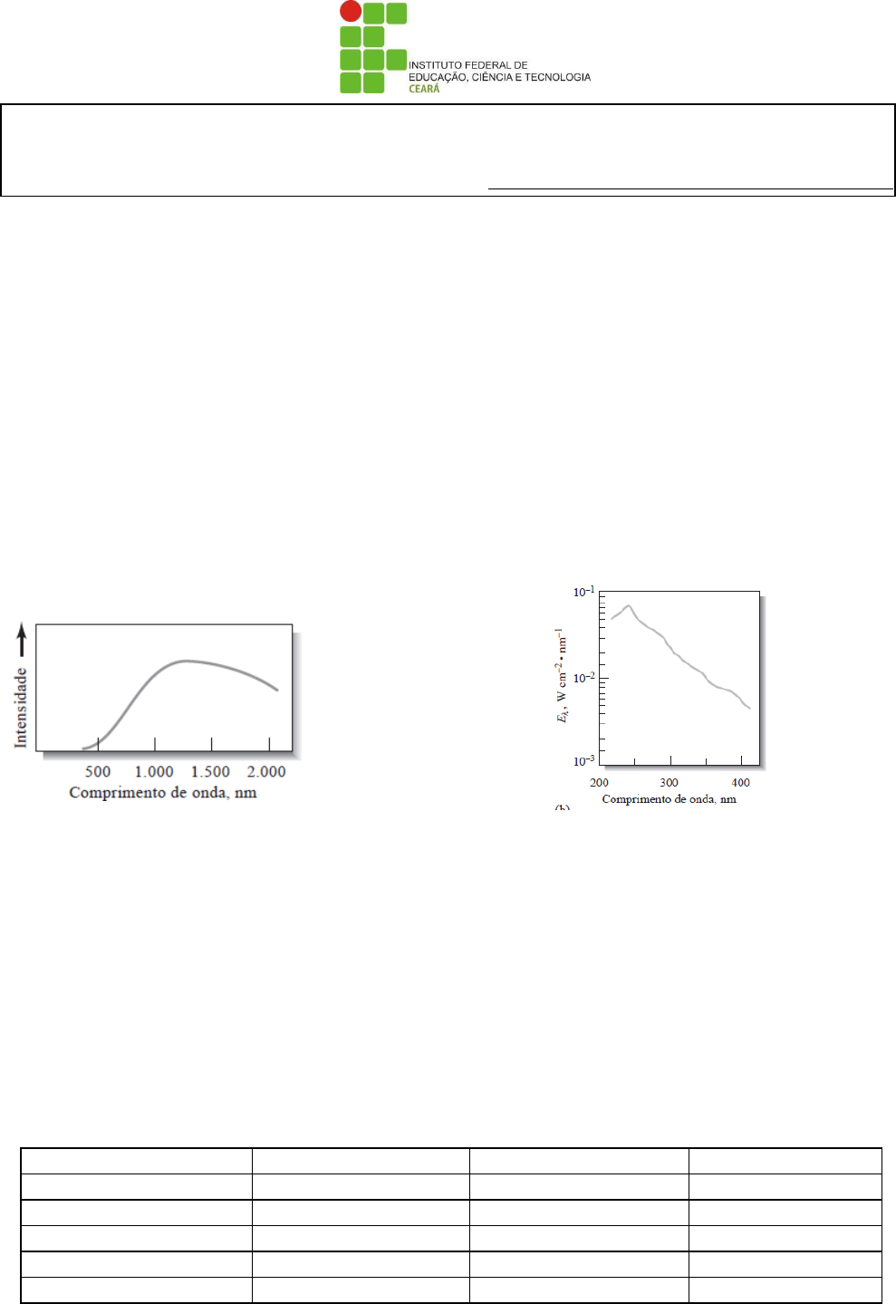 Professor: Wellington Viana Aluno(a): Semestre: 6º Curso: Técnico integrado em Petroquímica Disciplina: Noções de Química Analítica Instrumental Lista de Exercícios 1 – Espectrofotometria de absorção molecular na Região do UV- Visível Desenhe um esquema com a sequência correta dos componentes de um espectrofotômetro UV-Vis. (Nomeie cada parte do equipamento) Cite duas características que a fonte de radiação de um espectrofotômetro deve possuir. Quais são os tipos de fonte de radiação mais comuns na espectrofotometria Uv-Vis? Informe em qual faixa do espectro eletromagnético elas são utilizadas. Observe os gráficos abaixo da intensidade de radiação versus comprimento de onda para uma lâmpada de tungstênio (a) e para uma lâmpada de Hidrogênio (b). Qual informação útil podemos tirar de cada gráfico com relação ao uso dessas lâmpadas na Espectrofotometria UV-VIS? Justifique sua afirmação. (a) Lâmpada de tungstênio (b) Lâmpada de hidrogênio Qual a vantagem que a lâmpada de Tungstênio-Halogênio possui sobre a lâmpada somente de tungstênio? Justifique. Os seletores de comprimento de onda mais comuns são os monocromadores que podem ser do tipo rede de difração ou prisma. Explique como ocorre a seleção do comprimento de onda numa rede de difração. Ao incidir um feixe de radiação sobre uma solução absorvente, podemos relacionar a radiação transmitida (não absorvida) com a radiação incidente (inicial). Essa relação é conhecida como transmitância. Quando expressamos a transmitância na escala logarítmica temos a absorbância. Nesse sentido, preencha a seguinte Tabela: (T=P/P0; A= - logT) Luz absorvida Luz transmitida Transmitância Absorbância 100% 25% 60% 0,3 2,0 Uma solução colocada dentro de um espectrofotômetro UV-visível apresenta uma absorbância de 0,91 em um comprimento de onda de 560nm. Qual a porcentagem de radiação que está sendo transmitida? Qual porcentagem está sendo absorvida? (Petrobrás 2011- Téc. Química) Para a determinação da concentração de Cu2+, um excesso de um ligante foi adicionado para complexar todo o Cu2+ e produzir um derivado do analito com maior absortividade molar. Sabendo-se que a inclinação (sensibilidade) da curva de calibração (obtida com medições em cubeta de 1 cm de caminho óptico) foi 5 x 102 L mol−1 e que a absorbância medida na solução de amostra foi 1,000, a concentração, em mol/L, de Cu2+ nessa solução é: a) 1 x 10−3 b) 2 x 10−3 c) 5 x 10−3 d) 1 x 10−2 e) 2 x 10−2 (Petrobrás 2010- Téc. Química) As fachadas dos edifícios devem ser protegidas contra os efeitos da radiação solar que aceleram sua degradação, a partir do uso de tintas e vernizes contendo uma determinada concentração de aditivo fotoprotetor, que absorve fortemente radiações na faixa do UVA (320 nm – 400 nm). Considere um determinado aditivo que tenha massa molar = 500 g mol–1; absortividade molar (ε) = 10.000 L mol–1cm–1 para λMAX = 350 nm. A concentração do aditivo na tinta, em mg L–1, de tal forma que aproximadamente 90% da radiação UVA incidente seja absorvida por uma camada de 0,5 mm de espessura, é a) 1,0 x 10-1 b) 1,0 x 100 c) 1,0 x 101 d) 1,0 x 102 e) 1,0 x 103 (Univasf 2014-Téc. Lab) A Colorimetria e a Espectrofotometria podem ser conceituadas como um procedimento analítico através do qual se determina a concentração de espécies químicas mediante a absorção de energia radiante (luz). Uma das principais e mais usuais aplicações dessas técnicas é para determinar a concentração de glicose (C6H12O6) na urina através do valor médio da intensidade da cor resultante da reação desse açúcar com ácido 3,5-dinitrosalicílico. A tabela abaixo mostra a relação entre a concentração de glicose em solução aquosa e a intensidade da cor resultante Qual é a concentração, em gramas por litro, de uma solução de glicose que, após a reação, apresenta intensidade de cor igual a 0,80? a) 2 b) 4 c) 6 d) 8 e) 10 (EMBRAPA-Téc. Lab.) Segundo a Lei de Lambert-Beer, A=εbc. Assinale a alternativa INCORRETA: Ao traçarmos um gráfico de absorvância por concentração, encontraremos uma reta até certo ponto. “b” corresponde ao caminho que a luz passa pela amostra analisada. “ε” é dependente do comprimento de onda. “A” é adimensional, ou seja, não possui unidade. Essa lei é aplicável quando a amostra possui fluorescência. Uma solução contendo 8,75 ppm de KMnO4 apresenta uma transmitância de 0,743 em uma célula de 1,00 cm a 520 nm. Calcular a absortividade molar do KMnO4. Um composto X deve ser determinado por espectrofotometria UV/visível. Uma curva de calibração é construída a partir de soluções padrão de X com os seguintes resultados: 0,50 ppm, A = 0,24; 1,5 ppm, A = 0,36; 2,5 ppm, A = 0,44; 3,5 ppm, A = 0,59; 4,5 ppm, A= 0,70. Uma amostra de X forneceu uma absorbância igual a 0,50 nas mesmas condições de medida dos padrões. Encontre a inclinação da curva de calibração e a concentração da amostra de X. (ENEM 2014) Alguns sistemas de segurança incluem detectores de movimento. Nesses sensores, existe uma substância que se polariza na presença de radiação eletromagnética de certa região de frequência, gerando uma tensão que pode ser amplificada e empregada para efeito de controle. Quando uma pessoa se aproxima do sistema, a radiação emitida por seu corpo é detectada por esse tipo de sensor. A radiação captada por esse detector encontra-se na região de frequência: a) da luz visível b) do ultravioleta c) do infravermelho d) das micro-ondas e) das ondas longas de rádio (ENEM 2017) A figura mostra como é a emissão de radiação eletromagnética para cinco tipos de lâmpada: haleto metálico, tungstênio, mercúrio, xênon e LED (diodo emissor de luz). As áreas marcadas em cinza são proporcionais à intensidade da energia liberada pela lâmpada. As linhas pontilhadas mostram a sensibilida