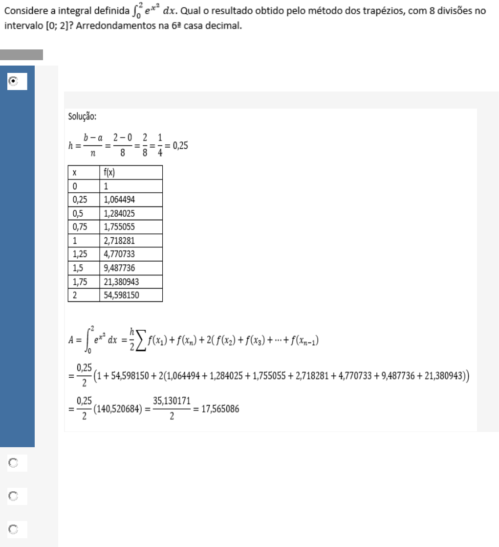 APOL’S 01,02,03,04 e 05 – Métodos Numéricos Aplicado. Questão 1/5 - Métodos Numéricos Aplicados . Nota: 20.0 A 17,565086 Você acertou! B 30,244423 C 49,029708 D 24,514851 Questão 2/5 - Métodos Numéricos Aplicados Sabendo que o valor exato para algum cálculo é de 372,25 e foi obtido por algum método numérico o valor de 371,73, determine o erro absoluto e o erro relativo Nota: 20.0 A 0,52 e 1,4% B -0,52 e 0,00014% C 0,52 e 0,14% Você acertou! D -0,52 e 1,4% Questão 3/5 - Métodos Numéricos Aplicados Colunas de adsorção são utilizadas em muitas indústrias quando o objetivo é separar componentes de uma mistura ou purificar substâncias gasosas. Fonte: http://www.envirochemie-br.com/typo3temp/pics/12cd40eedb.jpg Em um estudo realizado acerca do tempo necessário para que uma coluna atinja o ponto máximo de saturação, chegou-se, numericamente, ao valor de 7,12 horas. No entanto, o valor exato corresponde a 7,36 horas. Sendo assim, qual foi o erro absoluto? Nota: 20.0 A EAx=0,12 B EAx=0,14 C EAx=0,24 Você acertou! EAx=|x-x*| EAx=|7,36-7,12| EAx=|0,24| EAx=0,24 D EAx=0,28 Questão 4/5 - Métodos Numéricos Aplicados Quais as condições para a regra 3/8 de Simpson ser utilizada? Nota: 20.0 A h= constante e n= par B h= constante e n= qualquer C h= constante e n= múltiplo de 3 Você acertou! D h= variável e n= qualquer Questão 5/5 - Métodos Numéricos Aplicados . Nota: 20.0 A B C D Você acertou! Questão 1/5 - Métodos Numéricos Aplicados Considere o sistema não linear abaixo. Qual a matriz Jacobiana deste sistema? Nota: 20.0 A B Você acertou! C D Questão 2/5 - Métodos Numéricos Aplicados Considere o sistema abaixo. Como seriam as matrizes L e U escritas utilizando frações, para a fatoração L.U.? Nota: 20.0 A B C D Você acertou! Questão 3/5 - Métodos Numéricos Aplicados Em relação aos sistemas abaixo, quais seriam resolvíveis pela fatoração L.U. considerando a vantagem de empregabilidade do processo? Nota: 20.0 A Sistemas I) e II) B Sistemas I) e III) Você acertou! A fatoração L.U. é recomendável em sistemas com matriz dos coeficientes iguais. Logo sistema I) e III). C Sistemas II) e III) D Não é possível empregar a fatoração L.U. a nenhum dos sistemas. Questão 4/5 - Métodos Numéricos Aplicados Qual dos sistemas de equações pode ser resolvido pelo método de Gauss- Jacobi e de Gauss-Seidel. Nota: 20.0 A Somente I) Você acertou! B Somente II) C Os dois sistemas de equações. D Nenhum dos sistemas de equações. Questão 5/5 - Métodos Numéricos Aplicados Em relação aos métodos numéricos para integração, quais deles podem ser utilizados com passo variável. Nota: 20.0 A Regra 1/3 de Simpson B Regra 3/8 de Simpson C Somente o Método dos Trapézios D Método dos Trapézios e dos Retângulos. Você acertou! Somente as Regras de Simpson tem condição de passo constante. Questão 1/5 - Métodos Numéricos Aplicados Considerando a tabela de dados, quais os valores obtidos pela interpolação de Newton para os coeficientes de diferenças divididas em Nota: 20.0 A B C D Você acertou! Questão 2/5 - Métodos Numéricos Aplicados Considerando os métodos de interpolação pode-se afirmar: Nota: 20.0 A A interpolação linear é a mais utilizada por ser uma técnica que utiliza todos os pontos da tabela de valores, sendo a maior precisão de resultados. B As regressões ou ajuste de curvas somente podem ser utilizadas para dados sem erros inerentes. C As formas de interpolação de Lagrange e de Newton resultam no mesmo polinômio interpolador que aquela obtida por interpolação polinomial. Você acertou! D Extrapolação somente pode ser usada para dados fora da tabela. Questão 3/5 - Métodos Numéricos Aplicados Qual o erro relativo ocorrido para a estimativa por interpolação linear (com os dados da tabela abaixo) para x=2,7, se o valor exato for de y=0,993251. Nota: 20.0 A 3,14% B -1,87% C 2,15% D 1,64% Você acertou! Questão 4/5 - Métodos Numéricos Aplicados Considere a interpolação polinomial. Se o polinômio obtido com todos os pontos da tabela for de grau 5, quantos pontos (x,y) existem na tabela de valores. Nota: 20.0 A 6 pontos Você acertou! n+1 = 6 (quantidade de pontos) n=5 B 5 pontos C 4 pontos D 3 pontos Questão 5/5 - Métodos Numéricos Aplicados Em casos de ajuste de curvas (ou regressão), se o polinômio de ajuste for de grau 3, quantos pontos podem haver na tabela de dados? Nota: 20.0 A 3 pontos ou menos B 4 pontos ou mais Você acertou! O grau de 1 polinômio de ajuste aos dados de 1 tabela, pode ir de 1 até m-1. Onde, m é a quantidade de pontos da tabela. C 3 pontos D 2 pontos ou menos Questão 1/5 - Métodos Numéricos Aplicados Das afirmativas abaixo, indique quais são as corretas: I) O polinômio interpolador para uma tabela de 5 pontos, será de grau 4. II) Um polinômio de ajuste para uma tabela de 7 pontos será de grau até7. III) A melhor função de ajuste pode ser escolhida dentre várias funções mediante a determinação do menor resíduo. Nota: 20.0 A I e III Você acertou! B I e II C I; II e III D II e III Questão 2/5 - Métodos Numéricos Aplicados Quais testes podem ser usados para examinar a convergência de séries de valores alternados? Nota: 20.0 A Teste da Razão B Teste de Integral C Teste da Raiz D Teste de Séries Alternadas Você acertou! Solução: Somente o teste de séries Alternadas é aplicado a séries de termos com sinais alternados. Questão 3/5 - Métodos Numéricos Aplicados Considere os dados da tabela abaixo. Faça ajuste para uma função exponencial e determine o valor para x=2,5. Nota: 20.0 A 0,602 B 0,715 C 0,582 D 0,656 Você acertou! Questão 4/5 - Métodos Numéricos Aplicados Usando a Interpolação Linear, calcule a velocidade (cm/s) de propagação de uma corda que foi tensionada pela ação de pesos distintos, (conforme a tabela) e avalie para um peso de 6.850 gf. Nota: 20.0 A 1,4389 B 1,4537 C 1,4418 D 1,4658 Você acertou! Questão 5/5 - Métodos 