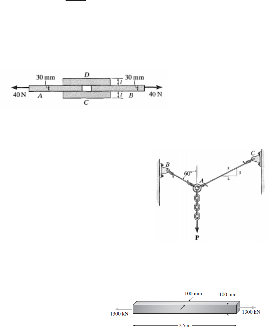 UNIASSELVI – ASSEVIM – Associação Educacional Do Vale do Itajaí Mirim Cursos de Engenharia Civil, Elétrica, Mecânica, Química e Produção Disciplina: Resistência dos Materiais Data 08/2017 Aluno(a):____________________________________________________ Critérios de avaliação. Os cálculos devem ser apresentados para que a questão tenha validade. Os valores finais das respostas devem estar a caneta e com as unidades corretas. Lista de exercício 1 - Avaliação parcial 1 - tensão e cisalhamento 1. As tiras A e B devem ser coladas com a utilização das duas tiras C e D. determine a espessura exigida t par C e D de modo que todas as tiras falhem simultaneamente. A largura (w) das tiras A e B é 1,5 vez a das tiras C e D. 2. Os dois cabos de aço AB e AC são usados para suportar a carga. Se ambos tiverem uma tensão de tração admissível σadm = 200 MPa, determine o diâmetro exigido para cada cabo se a carga aplicada for P = 5 kN. Arredonde para 2 casas. 3. Determine a tensão de tração provocada na barra quadrada de 100 mm que está sendo submetida a uma força de 1300kN. 4. O parafuso de olhal é usado para sustentar a carga de 25 kN. Determine seu diâmetro d e a espessura exigida h do suporte de modo que a arruela não penetre ou cisalhe o suporte. A tensão normal admissível para o parafuso é σ adm = 150 MPa e a tensão de cisalhamento admissível para o material do suporte é τa adm = 35MPa. 5. A chaveta é usada para manter as duas hastes juntas. Determine a menor espessura t da chaveta e o menor diâmetro d das hastes. Todas as partes são feitas de aço com tensão de ruptura por tração σr = 500 MPa e tensão de ruptura por cisalhamento τa =375 MPa. Use um fator de segurança (FS)t = 2,5 em tração e (FS)c = 1,75 em cisalhamento. 6. O acoplamento de gancho e haste está sujeito a uma força de tração de 5 kN. Determine a tensão normal média em cada haste e a tensão de cisalhamento média no pino A entre os elementos. 7. Dois elementos de madeira de 70 x 110 mm de seção transversal retangular uniforme são unidos por uma junta colada, como mostra a figura. Sabendo que a tensão de cisalhamento admissível na junta colada é de 500 kPa, determine a maior carga axial P possível de ser aplicada com segurança de 1,5. 40 mm 30 mm 5 kN 25 mm 40 mm t 10 mm 30 kN 25 kN 25 mm d h 30 kN 5 kN 8. Com relação as tensões suportadas pelos materiais utilizados na engenharia assinale como verdadeira ou falsa. Nas alternativas que vc escolher falsa reescreva de forma que fique verdadeira. Utilize o verso da folha para isso. a. ( ) A tensão normal é a tensão provocada por uma força que atua perpendicularmente a área do plano da secção transversal do elemento. b. ( ) O fator de segurança deve ser utilizado para elevar a carga que se pode aplicar em uma estrutura que está sendo dimensionada. c. ( ) O esforço de cisalhamento é quando uma força é aplicada ortogonalmente a área da secção transversal do elemento. d. ( ) Materiais com características frágeis são aqueles que possuem deformação elástica e deformação plástica antes de falhar. e. ( ) Um elemento de segurança para proteção de outros elementos deve ser projetado com um fator de segurança alto afim de não falhar. 9. Com relação aos esforços encontrados nas estruturas de engenharia assinale como verdadeira ou falsa. Nas alternativas que vc escolher falsa reescreva de forma que fique verdadeira. Utilize o verso da folha para isso. a. ( ) O esforço de compressão pode ser encontrado em uma coluna longa e fina com carga concentrada perpendicular a sua secção. b. ( ) O esforço de torção é um esforção que utilizo o conceito de momento (força x distância) sempre tendendo a provocar giro. c. ( ) O esforço de tração é um esforço muito encontrado nos cálculos de engenharia e utilizado no ensaio de tração para definir parâmetros de todos os materiais. d. ( ) O esforço de cisalhamento tende a provocar corte do elemento em questão que pode ser simples ou duplo. e. ( ) O esforço de flexão tende a provocar a deformação lateral de uma viga quando as forças são aplicadas perpendicularmente ao plano de secção da viga. 10. Uma luminária com peso de 850 N está sendo suportada por dois cabos. O diâmetro do cabo AB é de 4,76 mm e do cabo BC é de 6,35 mm. O ângulo α é de 37° e o ângulo β é 53°. Calcule a tensão de tração nos cabos AB e BC? 11. Uma coluna curta cilíndrica tubular está sendo solicitada a compressão com uma carga P aplicada na extremidade superior de valor 35kN, possui as dimensões d2 = 55 mm e d1 = 38 mm. Determine (a) a tensão de contato entre a coluna e a base, (b) a espessura da base para que não ocorra cisalhamento da mesma, considerando que esta base possui tensão cisalhante admissível de 50 MPa. 12. A viga da estrutura abaixo está suportando uma carga P de 4600N. Sabendo que as medidas H = 60 cm, L1 = 80 cm e L2 = 20 cm, determine o diâmetro mínimo do cabo sendo que a tensão admissível deste material é de 95 MPa. 13. Calcule o diâmetro dos rebites para suportar com segurança de 1,5 uma carga P de 60 kN, sabendo que o material dos rebites possuem tensão de cisalhamento de 180 MPa. Cabo Viga 14. Uma placa de aço de 25,8 kN deve ser suportada por um cabo conectado a esta placa por dois rebites. Sabendo que a tensão de cisalhamento do rebite é de 220 MPa e a segurança utilizada deve ser de 1,8 determine o diâmetro dos rebites. 15. Uma estrutura metálica foi parafusada e foram utilizados, com segurança de 1,5, dois parafusos ∅ 10 mm da classe 10.9. (a) Calcule o diâmetro dos novos parafusos para suportar a mesma carga, sabendo que os parafusos substitutos serão da classe 8.8; (b) determine tesão de cisalhamento dos parafusos se o diâmetro não puder ser maior que 8 mm. (Considere τa = σr x 0,65) 16. Na montagem de uma estrutura metálica dos terminais com a placa de apoio deve ser utilizado três parafuso