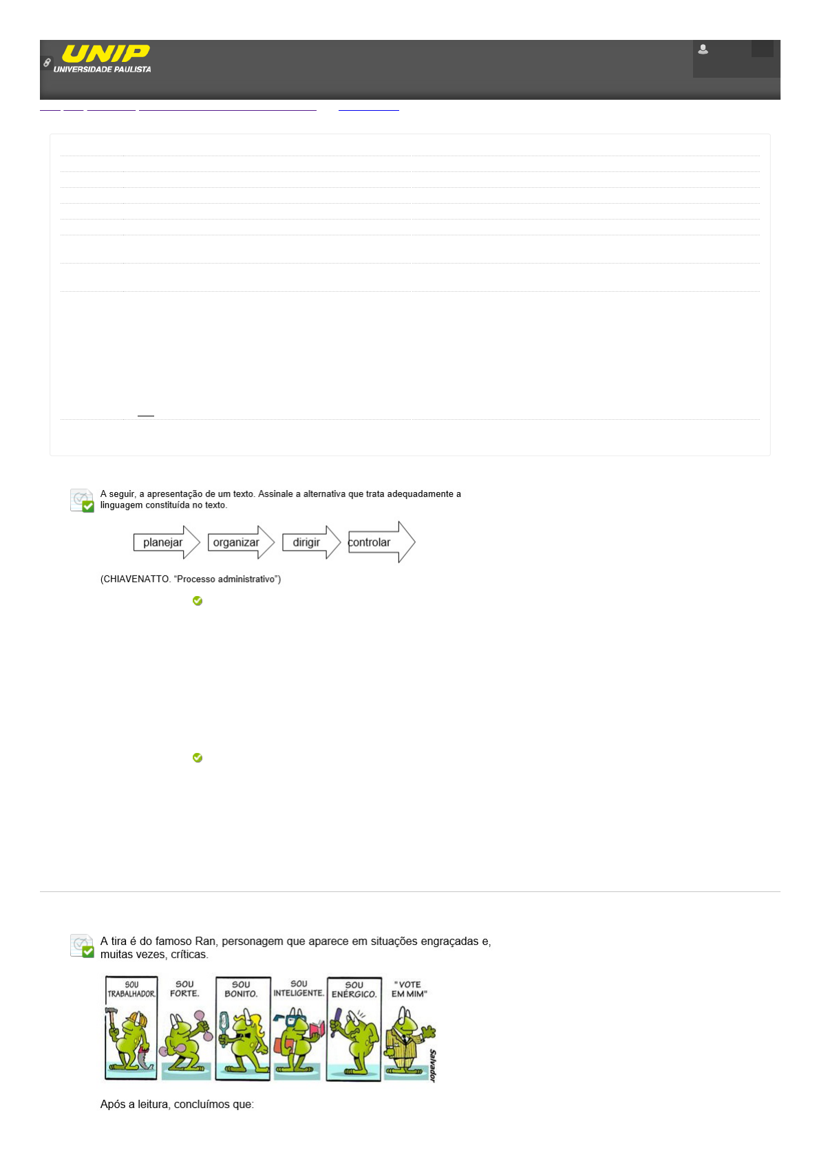 02/04/2018 Revisar envio do teste: QUESTIONÁRIO UNIDADE I – 5366-40... Interpretação e Produção de Textos 5366-40_59101_R_20181 CONTEÚDO Revisar envio do teste: QUESTIONÁRIO UNIDADE I Revisar envio do teste: QUESTIONÁRIO UNIDADE I Usuário Curso Interpretação e Produção de Textos Teste QUESTIONÁRIO UNIDADE I Iniciado 02/04/18 14:02 Enviado 02/04/18 14:29 Status Completada Resultado da tentativa 5 em 5 pontos Tempo decorrido 26 minutos Instruções Resultados exibidos Todas as respostas, Respostas enviadas, Respostas corretas, Comentários, Perguntas respondidas incorretamente ATENÇÃO: a avaliação a seguir possui as seguintes configurações: - Possui número de tentativas limitadas a 3 (três); - Valida a sua nota e/ou frequência na disciplina em questão – a não realização pode prejudicar sua nota de participação AVA, bem como gerar uma reprovação por frequência; - Apresenta as justificativas das questões para auxílio em seus estudos – porém, aconselhamos que as consulte como último recurso; - Não considera “tentativa em andamento” (tentativas iniciadas e não concluídas/enviadas) – porém, uma vez acessada, é considerada como uma de suas 3 (três) tentativas permitidas e precisa ser editada e enviada para ser devidamente considerada; - Possui um prazo limite para envio (acompanhe seu calendário acadêmico), sendo impossível o seu acesso após esse prazo, então sugerimos o armazenamento e/ou impressão para futuros estudos; - A não realização prevê nota 0 (zero). Pergunta 1 Resposta Selecionada: e. Respostas: a. b. c. d. e. Feedback da resposta: As palavras do texto não estão soltas, porque as flechas as organizam. Assim, palavras e flechas formam um texto verbal e não verbal concomitantemente. O texto é constituído unicamente da linguagem verbal devido à recorrência da língua portuguesa. Apesar da presença de palavras, o texto é não verbal; afinal, as palavras são aleatórias e não formam frase. As flechas empregadas no texto indicam as etapas administrativas e formam, portanto, a linguagem verbal. O texto é unicamente formado pela linguagem não verbal. As palavras do texto não estão soltas, porque as flechas as organizam. Assim, palavras e flechas formam um texto verbal e não verbal concomitantemente. Resposta correta: E Comentário: no texto anterior, o emprego de palavra (ou seja, da língua) constitui a linguagem verbal e o emprego de flechas marca a linguagem não verbal (outro código que não seja a língua). A interação entre as palavras e as flechas forma um texto coerente, indicador de um tema (processo administrativo) e não permite que as palavras, mesmo não formadoras de um texto tradicional (com frases, parágrafos), tornem-se aleatórias. Pergunta 2 UNIP EAD CONTEÚDOS ACADÊMICO BIBLIOTECAS MURAL DO ALUNO TUTORIAIS 0,5 em 0,5 pontos 0,5 em 0,5 pontos 02/04/2018 Revisar envio do teste: QUESTIONÁRIO UNIDADE I – 5366-40... https://ava.ead.unip.br/webapps/assessment/review/review.jsp?attempt_id=_2124308_1&course_id=_3205_1&content_id=_34003_1&return_content=1&step= Resposta Selecionada: d. Respostas: a. b. c. d. e. Feedback da resposta: Ran é um candidato e usa as descrições de si mesmo como argumento para adesão de votos. É uma tira de humor, mas sem sentido, uma vez que não há relação entre os primeiros quadrinhos e o último. É uma tira teatral, porque Ran está representando várias personagens como se estivesse em um palco. A tira forma um texto descritivo devido às características: trabalhador, forte, bonito, inteligente, enérgico. Ran é um candidato e usa as descrições de si mesmo como argumento para adesão de votos. A tira causa ambiguidade, porque há duas histórias, sendo a primeira a descrição de Ran e a segunda, a candidatura da personagem. Resposta correta: D Comentário: essa tira é interessante, porque à primeira vista (leitura) parece ser um texto descritivo. Afinal, apenas o último quadrinho não trata de caracterizar Ran. Na verdade, é um texto argumentativo, que usa as descrições para convencer o eleitorado a votar na personagem. Pergunta 3 Resposta Selecionada: c. Respostas: a. b. c. d. e. Feedback da resposta: Dados os trechos I, II e III, indique a alternativa correta quanto ao tipo de texto: I. “A administração é processo ou atividade dinâmica, que consiste em tomar decisões sobre objetivos e recursos.” (A. Maximiano) II. “A empresa somente poderá crescer e progredir se conseguir ajustar-se à conjuntura, e o Planejamento Estratégico é uma técnica comprovada para que tais ajustes sejam feitos com inteligência.” (Hernan Alday) III. “Nos anos 80, as grandes empresas cresceram de forma desordenada através da diversificação para novos negócios. Criaram estruturas gigantescas para competir numa era em que a velocidade e a flexibilidade são os dois requisitos-chave. Por isso, nos anos 90 foram forçadas a reestruturar-se, um processo designado downsizing.” (R. Tomasko) I – descritivo; II - argumentativo; III - narrativo. I – narrativo; II - descritivo; III - argumentativo. I – argumentativo; II - narrativo; III - descritivo. I – descritivo; II - argumentativo; III - narrativo. I – descritivo; II - argumentativo; III - argumentativo. I – descritivo; II - narrativo; III - narrativo. Resposta correta: C Comentário: um texto pode ser inteiro de um tipo apenas – narrativo, descritivo ou argumentativo – e pode também apresentar trechos de outros tipos. Por exemplo, um texto dissertativo-argumentativo pode ter trecho narrativo. Os trechos I, II e III fazem parte de textos argumentativos, mas nestes há momentos narrativos, quando o autor apresenta a história da administração (trecho III), bem como há momento descritivo, quando o autor dá a definição de administração. Pergunta 4 Resposta Selecionada: d. Respostas: a. b. c. d. e. Feedback da resposta: Imaginemos um recém-graduado, nascido e criado em centro urba