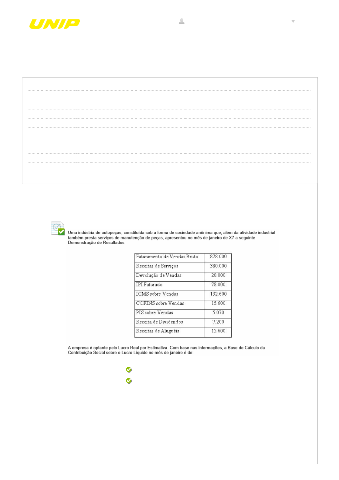 03/09/2018 Revisar envio do teste: QUESTIONÁRIO UNIDADE III – 6243-... https://ava.ead.unip.br/webapps/assessment/review/review.jsp?attempt_id=_6821049_1&course_id=_21470_1&content_id=_333858_1&return_c… 1/8 Revisar envio do teste: QUESTIONÁRIO UNIDADE III Planejamento Contábil Tributário 6243-60_59801_R_20182 CONTEÚDO Usuário cicero.nascimento1 @unipinterativa.edu.br Curso Planejamento Contábil Tributário Teste QUESTIONÁRIO UNIDADE III Iniciado 29/08/18 09:56 Enviado 03/09/18 12:25 Status Completada Resultado da tentativa 4 em 4 pontos Tempo decorrido 122 horas, 29 minutos Resultados exibidos Todas as respostas, Respostas enviadas, Respostas corretas, Comentários, Perguntas respondidas incorretamente Pergunta 1 Resposta Selecionada: a. Respostas: a. b. c. d. e. Feedback da resposta: $ 230.800. $ 230.800. $ 199.600. $ 242.560. $ 215.200. $ 154.800. CONTEÚDOS ACADÊMICOS BIBLIOTECAS MURAL DO ALUNO TUTORIAISUNIP EAD 0,4 em 0,4 pontos cicero.nascimento1 @unipinterativa.ed... 5 03/09/2018 Revisar envio do teste: QUESTIONÁRIO UNIDADE III – 6243-... https://ava.ead.unip.br/webapps/assessment/review/review.jsp?attempt_id=_6821049_1&course_id=_21470_1&content_id=_333858_1&return_c… 2/8 A empresa pode fazer a opção pelo recolhimento tanto do imposto de renda como da contribuição social sobre o lucro líquido, utilizando os percentuais aplicáveis sobre as receitas tributáveis e fazendo o ajuste por ocasião do levantamento do Balanço Patrimonial Anual. Os percentuais aplicáveis para determinação da base de cálculo são os mesmos utilizados pelas empresas tributadas pelo lucro presumido. Pergunta 2 Resposta Selecionada: e. Respostas: a. b. c. d. e. Feedback da resposta: $ 524.000. $ 192.000. $ 444.000. $ 252.000. $ 440.000. $ 524.000. 0,4 em 0,4 pontos 03/09/2018 Revisar envio do teste: QUESTIONÁRIO UNIDADE III – 6243-... https://ava.ead.unip.br/webapps/assessment/review/review.jsp?attempt_id=_6821049_1&course_id=_21470_1&content_id=_333858_1&return_c… 3/8 Pergunta 3 Resposta Selecionada: b. Respostas: a. b. c. d. e. Feedback da resposta: Considere as seguintes informações, em 30.06.X1 de uma empresa tributada pela apuração Trimestral do Lucro Real: Lucro Líquido antes do Imposto de Renda: $ 200.000 Resultado Positivo de Equivalência Patrimonial: $ 20.000 Provisões para Ajustes a Valores de Mercado: $ 50.000 Despesas de Depreciação de imóveis alugados: $ 80.000 A Base de Cálculo do IR, ao �nal do trimestre, com base nos dados acima será: $ 310.000,00 $ 200.000,00 $ 310.000,00 $ 217.000,00 $ 230.000,00 $ 161.000,00 Pergunta 4 Considere que uma empresa tenha optado pela apuração do Imposto de Renda e da Contribuição Social sobre o Lucro Líquido pelo Lucro Real anual com recolhimentos mensais por estimativa. Ao �nal de cada exercício, a empresa deve: I - fazer a apuração do lucro real no Livro de Apuração do Lucro Real, no qual procederá às adições e exclusões ao lucro ou prejuízo contábil, bem como as compensações de prejuízos �scais anteriores, respeitado o limite de 30%. II - calcular e contabilizar o valor do Imposto de Renda e Contribuição Social sobre o Lucro Líquido, observado as alíquotas vigentes para cada tributo. Para o Imposto de Renda de 15% mais Adicional de 10% que ultrapassar $ 240.000,00 no ano ou $ 20.000,00 mensais. III - compensar o valor do Imposto de Renda e Contribuição Social sobre o Lucro pago por 0,4 em 0,4 pontos 0,4 em 0,4 pontos 03/09/2018 Revisar envio do teste: QUESTIONÁRIO UNIDADE III – 6243-... https://ava.ead.unip.br/webapps/assessment/review/review.jsp?attempt_id=_6821049_1&course_id=_21470_1&content_id=_333858_1&return_c… 4/8 Resposta Selecionada: d. Respostas: a. b. c. d. e. Feedback da resposta: pago mensalmente com base nos balancetes mensais. (Estimativa Monitorada)l. Está correto o a�rmado em I, II e III. I, somente. I e II. II e III. I, II e III. I e III. Resposta: D Comentário: Todas as a�rmativas estão corretas. Quando a empresa faz a escolha da tributação com base no Balanço Patrimonial levantado anualmente, procederá todas as adições e exclusões ocorridas nos meses de janeiro a dezembro, momento que recolhia os impostos com base nos balancetes mensais (estimativa monitorada). Determinado o Lucro Real Anual, a empresa calculará o IRPJ a razão de 15% e o adicional de 10% sobre o valor que exceder o Lucro Real em $ 240.000, 00. Compensando as antecipações feitas ou pagas por estimativas dos meses de janeiro a novembro. Pergunta 5 Lucro Líquido do exercício: $ 70.000 Dentre as despesas estão escriturados os seguintes valores: Provisão para Contingências (enchentes que poderão ocorrer no mês de março de exercício seguinte); $ 18.000. Perdas decorrentes de créditos com clientes não liquidados que excederam aos permitidos por Lei: $ 8.000. Dividendos de participações societárias: $ 30.000 O valor de Prejuízos Fiscais compensáveis alcança a importância de $ 40.000 A empresa AMÉRICA S.A. tributada pelo Imposto de Renda e Contribuição Social sobre o Lucro Líquido pelo Lucro Real Trimestral. No último trimestre obteve-se as seguintes informações: Depreciação de imóveis alugados: $ 2.000 0,4 em 0,4 pontos 03/09/2018 Revisar envio do teste: QUESTIONÁRIO UNIDADE III – 6243-... https://ava.ead.unip.br/webapps/assessment/review/review.jsp?attempt_id=_6821049_1&course_id=_21470_1&content_id=_333858_1&return_c… 5/8 Resposta Selecionada: e. Respostas: a. b. c. d. e. Feedback da resposta: De acordo com as informações, o IR sobre o lucro Líquido a Pagar, será: $ 6.300 $ 5.040 $ 3.690 $ 3.528 $ 5.880 $ 6.300 Pergunta 6 Resposta Selecionada: c. Respostas: a. b. c. d. e. Feedback da resposta: Assinale a alternativa incorreta. O Livro de Apuração do Lucro Real (LALUR) é de escrituração facultativa, desde que a pessoa jurídica opte ou esteja obrigada à tributação com base no Lucro Real. O Livro de Apuração do Lucro Real (LALUR) é co