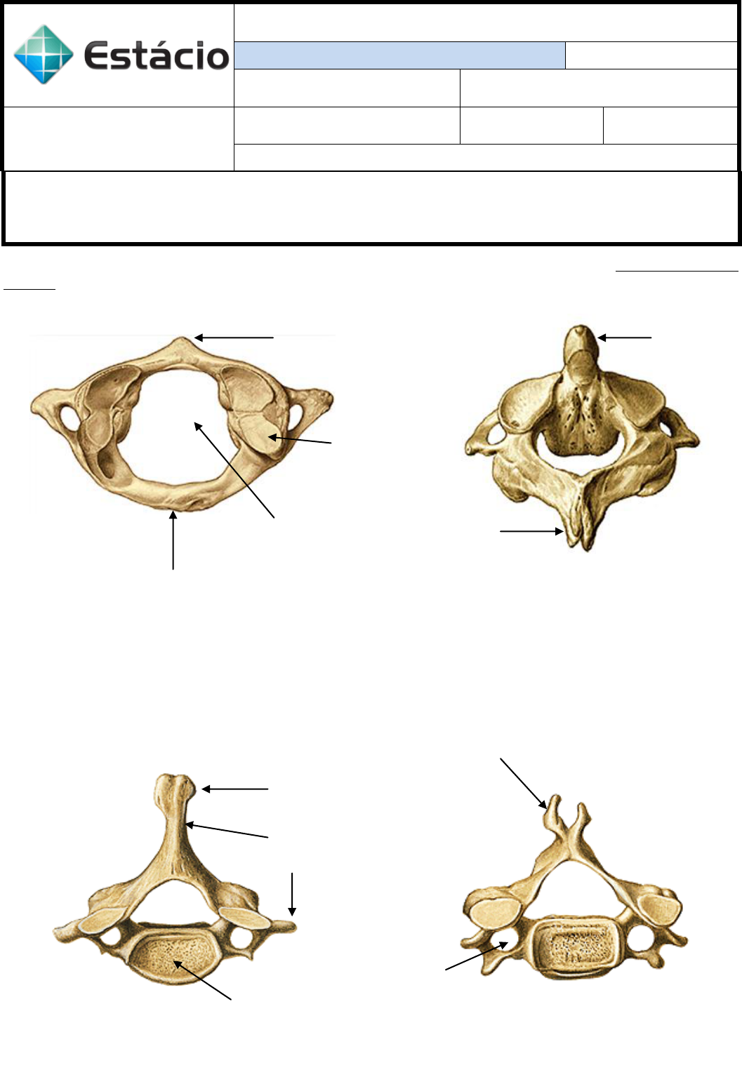 Nome do (a) Aluno (a) RELATÓRIO DE AULA PRÁTICA - 5 Data Disciplina SDE 0022 Curso OSSOS DA COLUNA VERTEBRAL Campus Período Turma Professor Ricardo Salviano ATENÇÃO O exercício é mais um instrumento de estudo, não substituindo os livros didáticos e nem a dedicação ao anatômico. A leitura de artigos científicos e outros títulos relevantes fazem parte da rotina de um acadêmico. As questões relacionadas abaixo não serão necessariamente indicadas nas avaliações regulares. 1. Identifique os ossos da coluna vertebral e seus acidentes ossos. (Original: Sobotta. Atlas de Anatomia Humana, Ed. Guanabara Koogan). Nome do osso:...................................... Nome do osso:...................................... Nome do osso:...................................... Nome do osso:...................................... Nome do osso: .......................................... Nome do osso: ............................................. Nome do osso: .......................................... Nome do osso: .......................................... 2. Diferencie morfologicamente as vértebras indicadas na tabela. Atlas (C1) Áxis (C2) Proeminente (C7) VC típica (C3 - C6) VT (T1 - T12) VL (L1 – L5) CORPO FORAME VERTEBRAL PROCESSO TRANSVERSO PROCESSO ESPINHOSO BIBLIOGRAFIA RECOMENDADA DÂNGELO, Jose Geraldo; FATTINI, Carlo Américo. Anatomia humana sistêmica e segmentar: para o estudante de medicina. 2. ed. São Paulo: Atheneu, 2005. 671 p GARDNER, Ernest Dean; GRAY, Donald J; O'RAHILLY, Roman. Anatomia: estudo regional do corpo humano. 4. ed. Rio de Janeiro: Guanabara Koogan, 1988. 815 p. JACOB, Stanley W.; FRANCONE, Clarice Ashworth; LOSSOW, Walter J. Anatomia e fisiologia humana. 5. ed. Rio de Janeiro: Guanabara, 1990. 569 p. MCMINN, R. M. H; HUTCHINGS, R. T; LOGAN, B. M. Atlas colorido de anatomia da cabeça e do pescoço. ARTMED, 1991. 240 p. MOORE, Keith L.; DALLEY, Arthur F. Anatomia orientada para a clínica. Tradução Alexandre Lins Werneck. Rio de Janeiro: Guanabara Koogan, 2001. 1023 p. NETTER, Frank H. Atlas de anatomia humana. Tradução Jacques Vissoky. 2. ed. Porto Alegre: ARTMED, 2000. 525 p. OLSON, Todd R. A.D.A.M.: atlas de anatomia. Tradução Alexandre Lins Werneck. Rio de Janeiro: Guanabara Koogan, c1998. 489 p. SNELL, Richard S. Anatomia clínica para estudantes de medicina. Tradução Alexandre Werneck. Rio de Janeiro: Guanabara Koogan, c1999. 857 p. SOBOTTA, Johannes. Atlas de anatomia humana. Tradução Wilma Lins Werneck. Rio de Janeiro: Guanabara Koogan, 2000. 2 v., YOKOCHI, Chihiro. Anatomia fotográfica do corpo humano. 3. ed. São Paulo: Manole, 1992. 140 p. TORTORA, Gerard J. Corpo humano: fundamentos de anatomia e fisiologia. Tradução Cláudia L. Zimmer. 4. ed. Porto Alegre: ARTMED, 2004. 574 p.