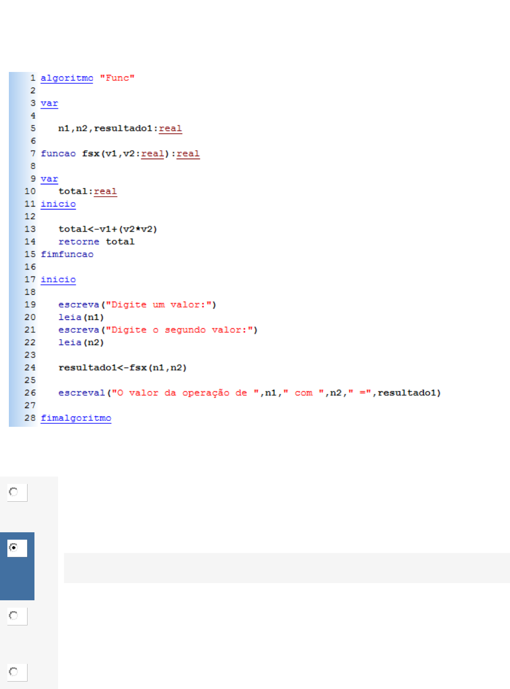 Questão 1/5 - Lógica de Programação e Algoritmos Na Aula 9 trabalhamos com o conceito de Funções. Funções servem como um artifício de modularização do seu código. O algoritmo acima mostra um psedocódigo que contém uma função. Assinale a alternativa que descreve o funcionamento desta função. Nota: 20.0 A A função calcula a soma dos quadrados dos valores. B A função calcula a soma do primeiro valor com o quadrado do segundo valor. Você acertou! Conteúdo abordado nas aulas 7, 8, 9 e 10. C A função calcula a soma do quadrado do primeiro valor pelo segundo valor. D A função calcula o quadrado das somas dos valores. E A função calcula a razao dos quadrados dos valores. Questão 2/5 - Lógica de Programação e Algoritmos A partir da Aula 5 trabalhamos com lógica iterativa. Na Aula 6 iniciamos os estudos com vetores. Acerca destes assuntos, observe as linhas de código abaixo. Nela temos uma matriz chamada preço recebendo diversos valores em diferentes posições. Avalie este bloco de código e selecione a alternativa que melhor se adequa para substituí-lo. Nota: 20.0 A n<-8 para i de 1 ate n faca leia(preco(i)) fimpara B n<-8 para i de 1 ate n faca leia(preco[i]) fimpara Você acertou! Assunto das aulas 7, 8, 9 e 10 C para i de 1 ate n faca leia(preco(k)) fimpara D para i de 1 ate n faca leia(preco) fimpara E para j de 1 ate n faca leia(preco) fimpara Questão 3/5 - Lógica de Programação e Algoritmos Na AULA 9 trabalhamos com o conceito de procedimentos e funções. Acerca deste assunto, responda: procedimentos e funções tem a mesma finalidade em um algoritmo? Nota: 20.0 A Não. Função obrigatoriamente retorna um valor, já um procedimento não retorna um valor, apenas executa uma ação. Você acertou! Conteúdo abordado nas aulas 09 e 10. B Sim. Possuem a mesma finalidade e ambos retornam um valor. C Não, pois a Função executa uma única ação e procedimento executa uma ação e retorna um valor. D Sim, Funções e procedimentos são apenas sub-rotinas. E Sim. Possuem a mesma finalidade e ambos não apresentam retorno. Questão 4/5 - Lógica de Programação e Algoritmos Observe o recorte de código abaixo. Este código realiza o cadastro de diversos dados de pessoas: nome, idade, sexo e cargo em uma determinada empresa. Agora, assuma que você precisa fazer este cadastro dentro de uma FUNÇÃO. Assinale a alternativa que contém a sintaxe correta da função criada para este caso específico. Nota: 0.0 A B C D E Correta! Questão 5/5 - Lógica de Programação e Algoritmos Nas Aulas 9 e 10 trabalhamos com funções e procedimentos. Observe o código abaixo que aborda este tema. Assinale a alternativa que contém a saída impressa na tela caso o valor lido na variável x seja 5. Nota: 0.0 A Sou inteligente. Mas sem praticar, não vou passar! Sou inteligente. B Mas sem praticar, não vou passar! Sou inteligente. C Sou inteligente. Mas sem praticar, não vou passar! D Sou inteligente. E Mas sem praticar, não vou passar!