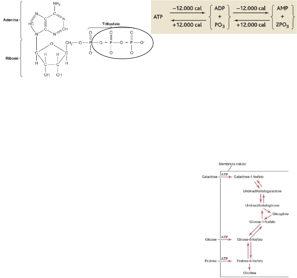 Metabolismo e Termorregulação Metabolismo Envolve processos químicos celulares. Liberação de energia livre dos alimentos. Os animais obtêm energia através da oxidação dos alimentos. A energia é ingerida com o alimento, é metabolizável e se transforma em ATP e em calor. Ela pode ser usada para crescimento, metabolismo basal, digestão e armazenamento, atividade muscular, secreção glandular, manutenção do potencial de membrana e condução de impulsos nervosos. Alimentos energéticos como carboidratos, lipídeos e proteínas sofrem oxidação e liberam grande quantidade de energia usada para fazer ATP. ADP mais fosfato são gerados quando o ATP é quebrado e há utilização de energia. ATP É uma moeda de energia do corpo. O elo essencial entre as funções que utilizam energia e as que a produzem. É obtido e consumido rapidamente. A remoção de cada grupo fosfato libera 12000 calorias de energia. Todos os mecanismos fisiológicos que requerem energia a obtém do ATP (ou similares, como o GTP). Uso de carboidratos para a obtenção de energia (ATP) O principal carboidrato é a glicose, um monossacarídeo que, após a ingestão no fígado, grande parte da frutose e quase toda a galactose são transformadas em glicose. Glicose é a via final comum dos carboidratos. No fígado, há interconversão de monossacarídeos e quando esses voltam para o sangue, 95% é glicose. Transporte de monossacarídeos para a célula Ocorre por difusão facilitada. Proteínas carreadoras - GLUT Especificidade tecidual GLUT 1 para eritrócitos e encéfalo; GLUT 2 para fígado, rins e células beta do pâncreas; GLUT-3 para neurônios; GLUT 4 para tecido adiposo e músculo esquelético; GLUT 5 para intestino delgado e testículos. Funções especializadas Captação de glicose a partir do sangue pelos GLUT 1, 3 e 4 e transporte nos dois sentidos pelo GLUT 2. Papel da insulina Controle da utilização de carboidratos na maioria das células. A insulina é a chave para desbloquear o canal de glicose para que a glicose possa entrar na célula. Por isso, ela permite o aumento do transporte de glicose e outros monossacarídeos em tecidos insulino-dependentes (fígado e cérebro). Glicose dentro das células A fosforilação da glicose é uma reação irreversível com exceção do fígado, túbulos renais e intestino pois estes possuem a enzima glicose-6-fosfatase. Nessa reação, a glicose é transformada em glicose-6-fosfato pelas enzimas hexoquinase e glicoquinase com gasto de um ATP (que vira ADP). A glicose-6-fosfato pode se transformar em glicogênio, ir para a glicólise, neoglicogênese ou via das pentoses. Glicogênio Um excesso de combustível da dieta alimenta reservas de gordura, proteínas e glicogênio que, quando oxidados, geram energia. É a forma de armazenamento da glicose, sem alteração da pressão osmótica intracelular. O fígado e os músculos tem a maior reserva de glicogênio. Glicogenólise é a reação de degradação ou quebra do glicogênio para gerar glicose e obter energia. Essa quebra se dá por fosforilação. É regulada pela enzima glicogênio fosforilase através do glucagon e da adrenalina com aumento de AMPc. Glicogênese é síntese de glicogênio pela conversão de um monossacarídeo em um polissacarídeo. Sua regulação hormonal é feita pela ativação da enzima glicogênio sintase pela insulina. O alimento aumenta a taxa de glicose, inibe a célula alfa e estimula a célula beta que transporta insulina do pâncreas para o fígado. O fígado absorve glicose e armazena na forma de glicogênio. A baixa taxa de glicose inibe a célula beta e ativa a célula alfa que transporta glucagon do pâncreas para o fígado. O fígado quebra o glicogênio e libera glicose. Glicólise A via glicolítica possui duas fases, uma preparatória que consome 2 ATP e uma de pagamento que forma 4 ATP e 2 NADH. Uma glicose origina 2 piruvatos. Via glicolítica Tem pouca energia livre liberada por formar apenas 2 ATP em seu rendimento líquido. Cada ATP é formado quando a energia liberada é superior a 12000 cal. Os produtos finais oxidados são a maneira mais importante de liberar energia da glicose. O piruvato formado é transformado em 4 CO2 e 4 H2O. Destino aeróbio do piruvato Na via aeróbia, a energia é liberada em pequenas quantidades gerando 38 mols de ATP para cada mol de glicose. Isso ocorre na mitocôndria. Destino anaeróbio do piruvato Fermentação lática é a produção de ácido lático pela enzima desidrogenase lática a partir de ácido pirúvico, NADH e H+ quando o oxigênio está indisponível ou insuficiente. Essa reação tem rendimento de 2 ATP na via glicolítica. As hemácias obtém energia pela glicólise anaeróbia por serem anucleadas. Ocorre no IAM por obstrução de um vaso do coração. Além disso, em condições normais, o coração transforma lactato em piruvato e o usa para produzir energia gerando acetilCoA. Conversão do piruvato em acetilCoA A coenzima A é derivada da vitamina do ácido pantotênico. Não forma ATP diretamente mas até 3 ATPs podem ser formados a partir de cada NADH formado. Ciclo de Krebs É o próximo estágio da degradação aeróbica da glicose. Gera 2 CO2, FADH2, 3 NADH e 1 GTP. Ocorre na matriz mitocondrial. Uma glicose forma 2 GTP nessa fase. NADH É um carreador de H formado durante a catálise feita por enzimas desidrogenases. É formado na via glicolítica (2), na transformação de piruvato em AcetilCoA (2) e no ciclo de Krebs (6) pela oxidação de 1 mol de glicose. FADH2 É formado na oxidação de 1 mol de glicose que ocorre no ciclo de Krebs (2). Cadeia transportadora de elétrons e fosforilação oxidativa Há formação de grandes quantidades de ATP. Apesar da complexidade da Glicólise, Ciclo de Krebs, desidrogenações e descarboxilações, quantidades muito pequenas de ATP são formadas. 90% do ATP gerado no metabolismo da glicose é formado pela oxidação dos átomos de hidrogênio presentes no NADH e