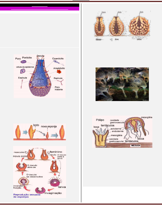 ZOOLOGIA HUBERTT LIMA VERDE DOS SANTOS – huberttlima@gmail.com PROFº: HUBERTT GRÜN. Página 1 ZZOOOOLLOOGGIIAA EXERCÍCIOS: PORÍFEROS E CELENTERADOS PROFº: HUBERTT LIMA VERDE – huberttgrun@hotmail.it Resumo: As esponjas ou poríferos não possuem tecidos bem definidos nem órgãos estabelecidos. Sua organização é muito simples. Realizam digestão intracelular. A respiração e a excreção ocorrem por difusão direta entre as células e a água circulante através dos canais do corpo. A parede do corpo é formada pela epiderme (revestimento externo), pelo mesênquima e pelo revestimento interno de células flageladas com colarinho transparente, chamadas coanócitos. No mesênquima, encontram - se os amebócitos. Existem poros inalantes (óstios) e um poro exalante (ósculo), por onde a água entra e sai, respectivamente, do corpo do porífero. A cavidade central forrada de coanócitos é o átrio ou espongiocele. Imagem retirada da página e modificada: http://www.sobiologia.com.br/figuras/Reinos2/poriferos.jpg No mesênquima, podem ser encontradas espículas calcárias ou silicosas, que fazem a sustentação do corpo do animal. Há, contudo, esponjas sem espículas (esponjas córneas). Reprodução assexuada, por brotamento, ou sexuada, por meio de fecundação cruzada e interna. Do ovo resulta uma larva que é eliminada pelo ósculo, nada e vai fixar-se às rochas, originando outra esponja. Reprodução Assexuada por Brotamento. Imagem retirada da página e modificada: http://www.cognoscere.hpg.ig.com.br/images/reprod1.gif Imagem retirada da página e modificada: http://www.cognoscere.hpg.ig.com.br/images/reprod2.gif De acordo com a complexidade estrutural, os poríferos se dividem em três variedades ou grupos: áscon, sícon e lêucon. Imagem retirada da página: http://www.cognoscere.hpg.ig.com.br/images/porife2.gif Os celenterados ou cnidários são mais evoluídos que as esponjas. Possuem tecidos e alguma evidenciação de órgãos. Embora façam a digestão intracelular, promove muito mais intensamente a digestão extracelular. Possuem gônadas, onde são formados os gametas. Têm um rudimento de sistema nervoso difuso. Revelam movimentos ativos notáveis graças a células epitélio-musculares. Podem mostrar- se na forma de pólipos ou de medusas. Imagem retirada da página: http://ipt.olhares.com/data/big/183/1836498.jpg O corpo possui duas camadas: a epiderme e a gastroderme. Entre elas, há uma camada gelatinosa — a mesogléia. A cavidade central e interior do corpo é a cavidade gastrovascular. Imagem retirada da página e modificada: http://4.bp.blogspot.com/_SUEfVUC4GRY/Rv7TNLvHz9I/AAAAAAAAAGM/rlLTFVQwTMo/s 320/cnidarios.jpg Alguns reproduzem-se por metagênese: as medusas reproduzem-se sexuadamente dando pólipos, e estes reproduzem-se assexuadamente dando novas medusas. Outros celenterados reproduzem - se apenas sexuadamente. E há, também, os que se reproduzem assexuadamente por brotamento ou por fragmentação do corpo. A parede do corpo possui cnidoblastos, células especializadas para a defesa, contendo nematocistos (cápsulas com filamento extensível inoculador de toxina). Os celenterados dividem-se em três classes: Hydrozoa, Scyphozoa e Anthozoa. Questões Para Discutir: 1. Explique o mecanismo e as finalidades da circulação de água na estrutura do corpo de um porífero. 2. Diferencie esponjas calcárias, esponjas silicosas e esponjas córneas. ZOOLOGIA HUBERTT LIMA VERDE DOS SANTOS – huberttlima@gmail.com PROFº: HUBERTT GRÜN. Página 2 3. Justifique a posição mais elevada dos celenterados em relação aos poríferos na escala filogenética animal. 4. Que são nematocistos e para que servem? 5. Descreva a metagênese da Aurelia sp. Testes e Questões de Vestibulares: 1. (UFPR - PR). Relacione as colunas e assinale a alternativa correta: (1) coanócitos (2) células nervosas (3) átrio (4) mesênquima (5) cnidoblastos ( ) cavidade central das esponjas ( ) células de defesa dos celenterados ( ) mesogléia, abaixo da epiderme ( ) digestão intracelular dos poríferos ( ) camada média da estrutura corporal dos poríferos a) 3 – 2 – 5 - 1 – 4 b) 5 – 3 – 2 – 1 - 4 c) 5 – 2- 3 – 1 – 4 d) 3 – 5 - 2- -4 – 1 e) 3 – 5 - 2 – 1 – 4 2. (UFMG - MG). Quais dos organismos abaixo realizam ao mesmo tempo digestão intracelular e digestão extracelular? a) celenterados b) protozoários c) poríferos d) vertebrados e) todos os invertebrados 3. (FUVEST-SP). A ―Grande Barreira de Recifes‖ se estende por mais de 2.000 km ao longo da costa nordeste da Austrália e é considerada uma das maiores estruturas construídas por seres vivos. Quais são esses organismos e como eles formam esses recifes? a) esponjas — às custas de secreções calcárias b) celenterados — às custas de espículas calcárias e silicosas do seu corpo c) pólipos de Anthozoa — às custas de secreções calcárias d) poríferos — às custas de material calcário do terreno e) cnidários — às custas do material calcário do solo, como a gipsita 4. (UNIRIO-RJ). Qual das alternativas abaixo justifica a classificação das esponjas no sub - reino Parazoa? a) ausência de epiderme b) ocorrência de fase larval c) inexistência de órgãos ou de tecidos bem definidos d) habitat exclusivamente aquático e) reprodução unicamente assexuada 5. (UFUb - MG). Complete a frase abaixo: ―Os Poríferos são animais __________ (diblásticos, triblásticos) portanto __________ (possuem, não possuem) órgãos, sendo conhecidos como animais de estrutura __________ (orgânica, tissular precária)‖. a) triblásticos, não possuem, tissular precária b) diblásticos, possuem, orgânica c) diblásticos, não possuem, tissular precária d) triblásticos, possuem, orgânica e) diblásticos, possuem, tissular precária 6. (PUC - RS). ―O pólipo dá origem a ovos, os quais formam plânulas das quais se formam novos pólipos que apresentam sexualidade, não havendo neste