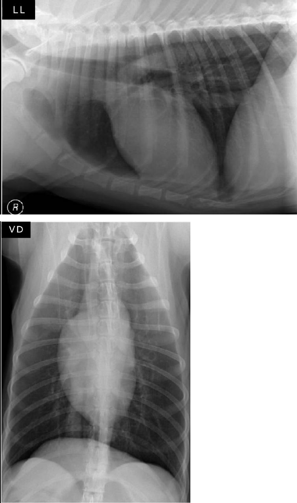 DIAGNÓSTICO RADIOGRÁFICO DAS DOENÇAS PULMONARES EM PEQUENOS ANIMAIS TÓRAX PULMÃO • Parênquima pulmonar → Espaços preenchidos por ar (alvéolos) → Estruturas de suporte intersticial (parede dos brônquios, vasos sanguíneos, septo alveolar, septo lobar, tecido linfático e nervos) ESTRUTURAS VISIBILIZADAS NO RX AVALIAÇÃO RADIOGRÁFICA • Vasculatura pulmonar: estruturas mais proeminentes • Variação do contraste radiográfico: enfermidade, idade, posição, ciclo respiratório, técnica radiográfica • Identificação dos lobos não é possível nos animais sadios PRODUÇÃO DE RADIOGRAFIAS DIAGNÓSTICAS • Pico inspiratório ➛ acentua o contraste entre as estruturas radiolucentes e radiopacas • mAs (curo tempo de exposição) ➛ diminuir interferência dos movimentos respiratórios PROJEÇÕES RADIOGRÁFICAS • LL direita e esquerda + VD ou DV • DV: Paciente dispneicos! INDICAÇÕES • Tosse • Dispneia • Respiração ofegante • Pesquisa de metástase pulmonar • Trauma torácico PULMÃO A observação da mudança na densidade radiográfica do pulmão é a base para a avaliação deste órgão CAUSAS DE AUMENTO DE OPACIDADE PULMONAR • EXPIRAÇÃO • SUBEXPOSIÇÃO DO FILME • PACIENTES GERIÁTRICOS • PACIENTES OBESOS • CUIDADO: MAMILOS, CARRAPATOS, SUJEIRA E JUNÇÕES COSTOCONDRAIS • ENFERMIDADES: PADRÕES PULMONARES PADRÕES PULMONARES • Alveolar • bronquial • Intersticial nodular • Intersticial linear (ou reticular) • Vascular* • Misto PADRÃO ALVEOLAR "Um padrão pulmonar alveolar é criado quando o ar no interior do alvéolo for substituído por um material com uma maior densidade física; consequentemente, aumentando a radiopacidade do pulmão" • Preenchimento dos alvéolos com fluido • Perda de ar dos alvéolos, causando atelectasia • Impossibilidade de visibilização das margens do coração, vasos e do diafragma • CAUSAS COMUNS: Broncopneumonia, hemorragia, atelectasia pulmonar, edema pulmonar, neoplasia • 1- Radiopacidade mal definida “Chumaço de algodão” • 2- Distribuição lobar ou sinal lobar • 3- Broncograma aéreo PADRÃO ALVEOLAR - ASPECTO DE “CHUMAÇO DE ALGODÃO” (BRONCOMPNEUMONIA) 2- Distribuição lobar ou sinal lobar BRONCOGRAMA AÉREO PADRÃO BRONQUIAL • Espessamento da parede do brônquio ➛ infiltrado de células inflamatórias ou edema, bronquite • Aumento da opacidade do brônquio ➛ paciente geriátricos, calcificação reidual secundário à bronquite crônica • Brônquios dilatados ➛ bronquiectasia BRONQUIECTASIA PADRÃO INTERSTICIAL • Preenchimento do interstício com fluido ou fibrose do interstício • O infiltrado intersticial pode ser: → Nodular (estruturado) → Linear (não estruturado) PADRÃO INTERSTICIAL NODULAR • Nódulos bem definidos de opacidade de tecido moles Distinguidos a parir de 5 mm diâmetro • Não há coalescência dos nódulos • Causas: → Neoplasia metastática → Neoplasia primária → Pneumonia micótica → Granuloma → Abcessos PADRÃO INTERSTICIAL NODULAR NEOPLASIA METASTÁTICA NEOPLASIA PRIMÁRIA PADRÃO INTERSTICIAL LINEAR • Aparência “rendilhada” • Grande vasos e brônquios atenuados • Normal: expiração, subexposição do filme, paciente geriátricos, obesidade • Pneumonia intersticial, pneumonia eosinofílica, hemorragia intersticial, fibrose pulmonar, linfoma, edema intersticial, neoplasia CONCLUSION A limitação principal de se avaliar os padrões pulmonares, é o fato de o padrão nem sempre se relacionar ao compartimento anatômico do pulmão que está anormal — por exemplo, um padrão brônquico provocado por doença intersticial peribrônquica. Além disso, há normalmente o envolvimento de mais de um compartimento pulmonar, e o padrão pulmonar somente reflete o envolvimento do compartimento mais visível – por exemplo, um padrão alveolar provocando perda da definição da borda e mascarando um padrão brônquico e/ou intersticial coexistente. Na realidade, há poucas doenças que envolvem apenas um compartimento pulmonar, e as alterações radiográficas resultante refletem um somatório das radiopacidades criadas pelos padrões combinados. CAUSAS DE DIMINUIÇÃO DA OPACIDADE PULMONAR • DIFUSA → Hiperinsuflação dos pulmões (asma felina) → Superexposição do filme → Enfisema • FOCAL → Cisto, vesícula, pneumocele ASMA • Aumento da radiolucência dos campos pulmonares e também aumento de seus tamanhos como resultado de hiperinsuflação • Campos pulmonares podem se entender além dos arcos costais • Achatamento do diafragma • Pode haver aumento de opacidade por padrão bronquial e mineralizações ASMA FELINA LESÕES CAVITÁRIAS