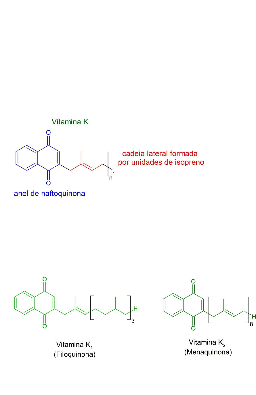 CLASSIFICAÇÃO: A vitamina K é uma vitamina do grupo lipossolúveis, ou seja, não são solúveis em água, e sim em “gorduras”. Foi descoberta no ano de 1929 por Henrik Dam um bioquímico dinamarquês, e seu nome K vem do dinamarquês koagulation, o que indica diretamente onde essa vitamina desempenha seu papel, ou seja, na coagulação sanguínea. Do ponto de vista químico a vitamina K, ou melhor, o conjunto de vitaminas K, são naftoquinonas, ou seja, são formadas por dois anéis planos, sendo um deles aromático, condensados, com dois átomos de oxigênio ligados diretamente ao anel não aromático. O anel não aromático apresenta uma cadeia lateral com unidades repetidas de isopreno, que é uma estrutura com cinco átomos de carbono, sendo um deles em ramificação. Não existe um único tipo de vitamina K, mas sim vários. A diferença básica entre uma vitamina K e outra se reside no número de unidades de isopreno presentes na estrutura. Temos por exemplo a vitamina K1, que é a filoquinona, e a vitamina K2, que é a menaquinona. A filoquinona apresenta quatro unidades de isopreno, sendo que apenas uma delas é um isopreno com insaturação (ligação dupla). As demais apresentam apenas ligações simples. A menaquinona, no entanto, apresenta oito unidades de isopreno insaturados. PROCESSO DA COAGULAÇÃO: A partir de um mecanismo complexo a vitamina K permite que a protrombina seja carboxilada (-COO-) e com isso cada sítio modificado passa a ter dois grupos carboxilato para se ligar aos íons Ca2+. A protrombina modificada passa a ser um ligante bidentado, com maior potencial de formar ligação com o íon metálico e passa a ser chamado de y-carboxiglutâmico (ácido gama carboxiglutâmico - GLA) formando a trombina e consecutivamente convertendo o fibrinogênio em fibrina, e só então cicatrizando o ferimento. PROTROMBINA (zimogênio) > TROMBINA (enzima) > FIBRINOGÊNIO (zimogênio) > FIBRINA (proteína). MANIFESTAÇÃO DE CARÊNCIA: Tendência ao sangramento. MANIFESTAÇÃO DE EXCESSO: Mesmo com elevadas quantidades de vitamina K1 e K2 ingeridas durante um período alargado de tempo, não foram observadas manifestações tóxicas. No entanto a menadiona administrada (K3, produzida artificialmente), pode causar anemia hemolítica e icterícia. FONTES DIETÉTICAS: Brócolis; Espinafre; Couve-flor; Fígado, entre outros. INGESTÃO DIÁRIA RECOMENDADA: Dose usual: 65mcg. CURIOSIDADES: Injeção única intramuscular (na coxa) em recém-nascidos na primeira hora após o nascimento prevenindo da doença hemorrágica do recém-nascido; A vitamina K age ainda como potente inibidor da calcificação vascular prevenindo a aterosclerose; A varfarina sódica é um fármaco antagonista a vitamina K e em doses reguladas é usada na prevenção de tromboses, já em altas doses é utilizada como veneno para roedores.