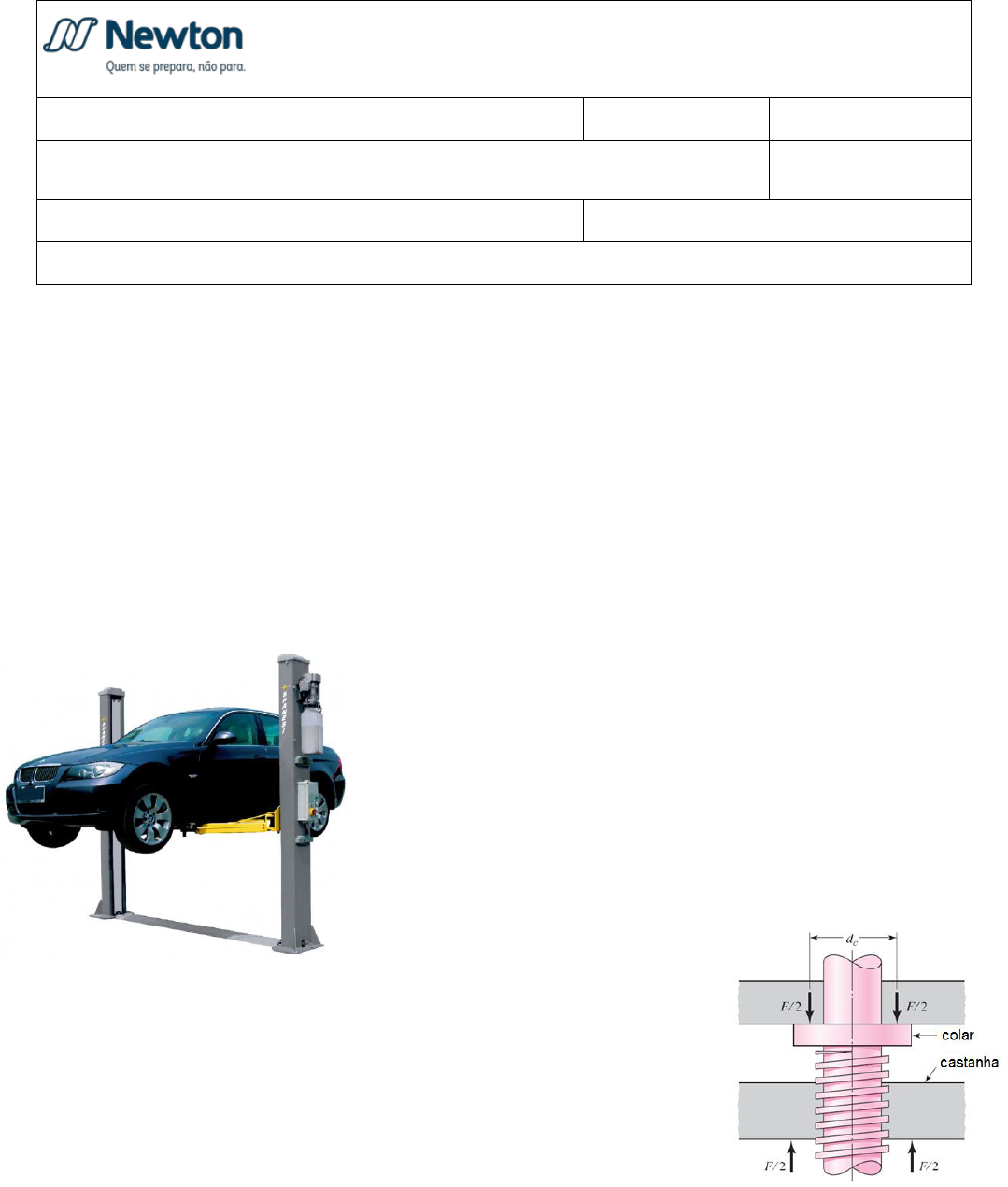 CURSO DE ENGENHARIA MECÂNICA Campus Buritis DISCIPLINA: ELEMENTOS DE MÁQUINAS II PERÍODO: 8o TURNO: NOITE ATIVIDADE: LISTA DE EXERCÍCIOS 4 Parafusos de Potência e Trens de Engrenagens VALOR: 5 pts PROFESSOR: LUIZ BRANT DATA DE ENTREGA: 26/06/2018 NOME: RA: Exercício 01 – Sobre parafusos de potência é correto afirmar: I – Convertem movimento rotativo em deslocamento linear. II – Parafusos de potência com esferas recirculantes transmitem movimento com alta eficiência. III – A vantagem de se utilizar um parafuso com 2 ou mais entradas é a de se conseguir avanço mais rápido. IV – Dentre os perfis de rosca mais utilizados para parafusos de potência estão: rosca quadrada, rosca trapezoidal e rosca redonda. a) Apenas I é verdadeira b) Apenas I e III são verdadeiras c) Apenas I, III e IV são verdadeiras d) Todas são verdadeiras e) Todas são falsas Exercício 02 – O elevador de carros de uma oficina mecânica, mostrado na imagem ao lado, é formado por duas colunas, cada qual contendo um parafuso de potência de rosca quadrada, com diâmetro médio dm = 30mm e um passo de 4mm com duas entradas. A extremidade superior dos parafusos possui um colar com diâmetro dc = 40 mm, conforme ilustrado abaixo. Assumindo que todos os atritos envolvidos no sistema tenham coeficiente f = 0,08 e que o carro a ser consertado tenha uma massa m = 1.305 kg, determine: a) O torque requerido sobre cada parafuso para levantar o veículo. b) O torque requerido sobre cada parafuso para baixar o veículo. c) A eficiência total do parafuso. d) Pergunta-se: O sistema é autobloqueante? Por quê? Exercício 03 – O chamado macaco, dispositivo utilizado para levantar o veículo no momento da troca de pneus, funciona por meio de um parafuso de potência. Este dispositivo foi projeto estruturalmente para suportar cargas de até 2 toneladas. Sabendo que o diâmetro médio dm do parafuso de rosca quadrada é de 10mm com um passo de 2mm e assumindo um coeficiente de atrito f = 0,08, determine: a) O torque Ts sobre o parafuso, necessário para levantar o veículo na condição máxima de carga. b) A eficiência e do parafuso. Exercício 04 – Com relação às afirmativas a seguir sobre engrenagens e seus tipos, marque a opção correta: I - A função de um par de engrenagens pode ser apenas alterar o sentido do movimento. II - É impossível transformar movimento de rotação em movimento de translação utilizando para tanto, um par de engrenagens. III - Engrenagens de dentes retos são comumente utilizadas em aplicações de altas rotações. IV - Engrenagens sem fim são comumente utilizadas quando são necessárias grandes reduções. a) Apenas I é verdadeira b) Apenas I e III são verdadeiras c) Apenas III e IV são verdadeiras d) Apenas I e IV são verdadeiras e) Apenas II e IV são verdadeiras Exercício 05 – Assumindo a engrenagem 1 como motora, determine as relações de transmissão de velocidades (RT) dos trens de engrenagem a seguir, a velocidade e o torque de saída (onde z é o número de dentes de cada engrenagem). Indique no desenho, o sentido de rotação da última engrenagem movida: a) z1 = 18; z2 = 114 motora = 4000 rpm Tmotora = 50 N.m b) z1 = 35; z2 = 72; z3 = 24; z4 = 40; z5 = 18; z6 = 38 motora = 5500 rpm Tmotora = 250 N.m Exercício 06 – Determine a velocidade e o sentido de rotação da engrenagem G no trem de engrenagem mostrado. O número após a letra que denomina cada engrenagem corresponde ao número de dentes. Considere que as engrenagens B e C estão no mesmo eixo, da mesma forma que as engrenagens D e E. Exercício 07 – Com relação às engrenagens e seus tipos, responda verdadeiro (V) ou falso (F): ( ) A razão entre o número de dentes nas rodas é diretamente proporcional à razão de torque e inversamente proporcional à razão das velocidades de rotação. ( ) A função de um par de engrenagem pode ser apenas alterar a direção do movimento. ( ) É impossível transformar movimento de rotação em movimento de translação, utilizando para tanto, um par de engrenagens. ( ) Engrenagens de dentes retos são comumente utilizadas em aplicações de altas rotações. ( ) É impossível utilizar engrenagens de dentes retos em montagens com eixos perpendiculares entre si. ( ) A desvantagem das engrenagens helicoidais é o alto ruído provocado durante sua operação. ( ) É possível utilizar engrenagens helicoidais em montagens com eixos perpendiculares entre si. ( ) Engrenagens sem fim são comumente utilizadas quando são necessárias grandes reduções. Exercício 08 – Assumindo a engrenagem A como motora, determine a relação de transmissão de velocidade (RT), a velocidade de rotação e o torque de saída da engrenagem F, no trem de engrenagem a seguir. A primeira imagem mostra uma vista de cima do trem enquanto a segunda imagem mostra uma vista de frente do mesmo trem. O número à frente da letra de cada engrenagem representa o número de dentes da mesma. Assuma a velocidade de rotação da engrenagem A, nA = 900 rpm com um torque de TA = 300 N.m. Indique no desenho, o sentido de rotação da engrenagem F: Exercício 09 – Com base nos dados fornecidos, determine a relação de transmissão (R.T.), a velocidade e o torque de saída para os seguintes trens de engrenagem simples. a) dmotora = 200 mm dmovida = 250 mm entrada = 1.000 rpm Tentrada = 400 N.m b) Zmotora = 45 Zmovida = 30 entrada = 2.000 rpm Tentrada = 150 N.m Exercício 10 – No trem de engrenagens ao lado, a engrenagem motora A tem módulo 2,5 mm e a engrenagem C tem módulo de 2 mm. Determinar o número de dentes em cada engrenagem se a razão de transmissão é 1/6 aproximadamente. O número de dentes em cada engrenagem é para ser um mínimo, mas não menos do que 20. Exercício 11 – Determine a velocidade angular absoluta de saída da engrenagem anelar. Dados: Engrenagem Solar Z2=62 dentes (Engrenagem Externa) Engrenagem Planetária Z3=10 dentes (Engrenagem Externa) Engrena
