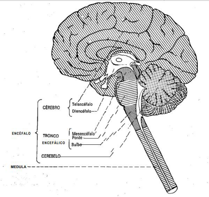 Telencéfalo Diencéfalo Tronco Encefálico Cerebelo Medula 1) O telencéfalo compreende os dois hemisférios cerebrais, direito e esquerdo, e uma pequena parte mediana situada na porção anterior do III ventriculo e já estudada a propósito desta cavidade. Os dois hemisférios cerebrais são incompletamente separados pela fissura longitudinal do cérebro, cujo assoalho é formado por uma larga faixa de fibras comissurais, o corpo caloso, principal meio de união entre os dois hemisférios. Os hemisférios cerebrais possuem cavidades, os ventrículos laterais direito e esquerdo, que comunicam com o III ventriculo pelos forames interventriculares. Cada hemisfério possui três pólos: frontal, occipital e temporal; e três faces: face superolateral, convexa; face mediai, plana, e face inferior, ou base do cérebro, muito irregular, repousando anteriormente nos andares anterior e médio da base do crânio e posteriormente na tenda do cerebelo. A superfície do cérebro do homem e de vários animais apresenta depressões denominadas sulcos, que delimitam os giros ou circunvoluções cerebrais. Em cada hemisfério cerebral, os dois sulcos mais importantes são o sulco lateral (de Sylvius) e o sulco central (de Rolando), que serão descritos a seguir: a) sulco lateral — Inicia-se na base do cérebro lateralmente à substância perfurada anterior , como uma fenda profunda que, separando o lobo frontal do lobo temporal, dirige-se para a face súpero-lateral do cérebro, onde termina dividindo-se em três ramos: ascendente, anterior e posterior . Os ramos ascendente e anterior são curtos e penetram no lobo frontal; o ramo posterior é muito mais longo, dirige-se para trás e para cima, terminando no lobo parietal. Separa o lobo temporal, situado abaixo, dos lobos frontal e parietal, situados acima; b) sulco central — É um sulco profundo e geralmente contínuo, que percorre obliquamente a face súperolateral do hemisfério, separando os lobos frontal e parietal. Inicia-se na face mediai do hemisfério, aproximadamente no meio de sua borda dorsal e a partir deste ponto dirige-se para diante e para baixo, em direção ao ramo posterior do sulco lateral, do qual é separado por uma pequena prega cortical. É ladeado por dois giros paralelos, um anterior, giro pré-central, e outro posterior, giro pôs-central. De modo geral, as áreas situadas adiante do sulco central relacionam-se com a motricidade, enquanto as situadas atrás deste sulco relacionam-se com a sensibilidade. Os sulcos cerebrais ajudam a delimitar os lobos cerebrais, como já ficou evidenciado na descrição dos sulcos lateral e central. Os lobos cerebrais recebem sua denominação de acordo com os ossos do crânio, com os quais se relacionam. Assim, temos os lobos frontal, temporal, parietal e occipital. Além destes, existe um quinto lobo, a insula, situado profundamente no sulco lateral e que não tem, por conseguinte, relação imediata com os ossos do crânio. 2) 0 diencéfalo e o Telencéfalo formam o cérebro, que corresponde, pois, ao prosencéfalo. O cérebro é a porção mais desenvolvida e mais importante do encéfalo, ocupando cerca de 80% da cavidade craniana. Os dois componentes que o formam, diencéfalo e Telencéfalo, embora intimamente unidos, apresentam características próprias e são usualmente estudados em separado. O Telencéfalo se desenvolve enormemente em sentido lateral e posterior para constituir os hemisférios cerebrais. Deste modo, encobre quase completamente o diencéfalo, que permanece em situação ímpar e mediana, podendo ser visto apenas na face inferior do cérebro. O diencéfalo compreende as seguintes partes: tálamo, hipotálamo, epitálamo e subtálamo e todas em relação com o III ventrículo. É, pois, conveniente que o estudo de cada uma destas partes seja precedido de uma descrição do III ventrículo. A cavidade do diencéfalo é uma estreita fenda ímpar e mediana denominada III ventrículo, que se comunica com o IV ventrículo pelo aqueduto cerebral e com os ventrículos laterais pelos respectivos forames interventriculares (ou de Monro). No assoalho do III ventrículo dispõe-se de diante para trás as seguintes formações, que serão estudadas nos itens seguintes: quiasma óptico, infundíbulo, túber cinéreo e corpos mamilares, pertencentes ao hipotálamo. 3) 0 tronco encefálico interpõe-se entre a medula e o diencéfalo, situando-se ventralmente ao cerebelo. Na sua constituição entram corpos de neurônios que se agrupam em núcleos e fibras nervosas, que, por sua vez, se agrupam em feixes denominados tratos, fascículos ou lemniscos. Estes elementos da estrutura interna do tronco encefálico podem estar relacionados com relevos ou depressões de sua superfície. O conhecimento dos principais acidentes da superfície do tronco encefálico, como, aliás, de todo o sistema nervoso central, é muito importante para o estudo de sua estrutura e função. Muitos dos núcleos do tronco encefálico recebem ou emitem fibras nervosas que entram na constituição dos nervos cranianos. Dos 12 pares de nervos cranianos, 10 fazem conexão no tronco encefálico. A identificação destes nervos e de sua emergência do tronco encefálico é um aspecto importante do estudo deste segmento do sistema nervoso central. Convém lembrar, entretanto, que nem sempre é possível observar todos os nervos cranianos nas peças anatômicas rotineiras, pois frequentemente alguns são arrancados durante a retirada dos encéfalos. O tronco encefálico se divide em: bulbo, situado caudalmente: mesencéfalo, situado cranialmente; e ponte, situada entre ambos. 4) 0 cerehelo, órgão do sistema nervoso supra –segmentar deriva da parte dorsal do metencéfalo e fica situado dorsalmente ao bulbo e à ponte, contribuindo para a formação do tecto do IV ventrículo. Repousa sobre a fossa cerebelar do osso occipital e está separado do lobo occipital do cérebro por uma prega da dura-máter denominada tend