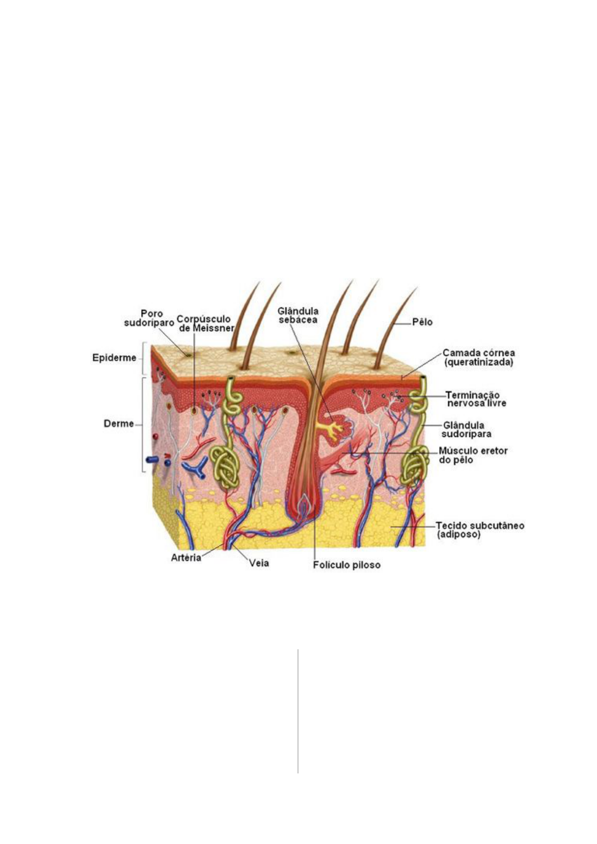 Tegumento Comum Aula 2 (14/05/2018) - Pele com seu revestimento de pelos e glândulas cutâneas, assim como regiões mais especializadas como garras, cascos e cornos Funções: 1. Proteção 2. Controle de temperatura 3. Eliminação de excreção 4. Percepção sensorial 5. Armazena nutrientes EPIDERME É um epitélio escamoso estrati�cado, não vascular e de grossura variável. Se divide em duas camadas: 1. Estrato córneo: camada superficial, dura e seca. Tem queratina (que dá origem às especializações epidérmicas como: unhas, cornos, cascos e pêlos) 2. Estrato germinativo: camada profunda, macia e úmida, que apresenta o pigmento chamado melanina (protege da radiação ultravioleta) DERME OU CÓRIO �Função de suportar e nutrir a epiderme e seus apêndices. Consiste de um arranjo de fibras colágenas e elásticas Constituída de: 1. Artérias 2. Veias 3. Capilares 4. Linfáticos 5. Glândulas cutâneas (sebáceas e sudoríparas) 6. Folículos pilosos 7. Nervos 8. Fibras musculares lisas (nos animais domésticos é bastante espessa e constitui o couro) TECIDO SUBCUTÂNEO (hipoderme) É formado de tecido conjuntivo frouxo que contém fibras elásticas Funções 1. Estocar gordura 2. Atuar como isolamento térmico 3. Suportar a derme e epiderme dando o contorno corporal. Glândulas sebáceas Ficam na derme e secretam uma substância chamada sebo, que protege contra a umidade e pode desempenhar importante papel na vida sexual dos animais. Funções da secreção sebácea: 1. Lubrifica e impermeabiliza a pele. 2. Dissemina o suor e diminui a perda de água. 3. Diminui a possível entrada de microorganismos d) serve como marcador territorial 4. Ferormônios, atrativos sexuai. Glândulas sudoríparas São glândulas exócrinas tubulosas e enoveladas. São diferenciadas em: 1. Glândulas sudoríparas apócrinas: perdem parte do seu citoplasma como parte da sua secreção, despeja no folículo piloso. 2. Glândulas sudoríparas merócrinas: apenas os produtos da secreção são eliminados, despeja diretamente na superfície da epiderme CASCO É a cobertura córnea da extremidade distal do dígito. Funções : proteção, defesa, amortecedor, tato e ferramenta para arranhar ou cavar Divido em três partes: 1. Parede: é a parte do casco que é visível quando o pé está posicionado no chão. Face externa: períoplo Face interna: lamelas córneas (epidérmicas) Divisão da parede: A) pinça B) quartos C) coroa D) talões E) borda solear 2. Sola: superfície inferior do casco, com duas faces e duas bordas. - Côncava, de forma que a sola não encosta no chão. - A junção entre a sola e a parede é conhecida como linha branca (Alba). 3. Ranilha ou cunha da úngula: Constituída por substância córnea relativamente macia (epitélio queratinizado) com 50% de água, avascular e destituída de nervos. - É a parte do coxim que entra em contato com o solo. (bomba circulatória) - Recebe nutrição através da derme (cório) * O objetivo da aparação dos cascos é tornar o formato, o ângulo do eixo e o nível da pata tão próximos do normal quanto possível. No entanto qualquer alteração radical poder provocar alterações patológicas. * A aparação e a ferração corretivas são considerações importantes no tratamento das claudicações. * Laminite: é uma in�amação das lâminas do casco, porém com uma seqüência complicada de eventos inter-relacionados que resulta em graus variáveis de patologias. - Se manifesta por uma diminuição na perfusão capilar no interior da pata, quantidades signi�cativas de desvios arteriovenosos, necrose isquêmica das lâminas e dor. - Caracterizada por claudicação intermitente ou contínua e por padrões divergentes de crescimento da parede do casco. Cornos No início do crescimento, os cornos são cobertos com pele e por um pêlo �no, que contêm vasos sanguíneos e nervos. Na seqüência o osso esponjoso nas extremidades externas é substituído por um osso compacto, enquanto os centros deles são preenchidos de tecido esponjoso e lamelar, e medula óssea. Crescimento contínuo, exceto em raças mochas. Base possui tecido córneo macio: epicera Base óssea é o processo cornual do osso frontal Mochação: jovens Descorna: adultos Chifres Estruturas não rami�cadas, permanentes e que se projetam dos ossos frontais. Compostos de um cório (derme), coberto com uma envoltura de queratina, e em algumas espécies com crescimento constante - Parte óssea sem cavidade - Recobertos por pele que nutre o osso - Os processos ósseos se desprendem quando perdem suprimento sanguíneo