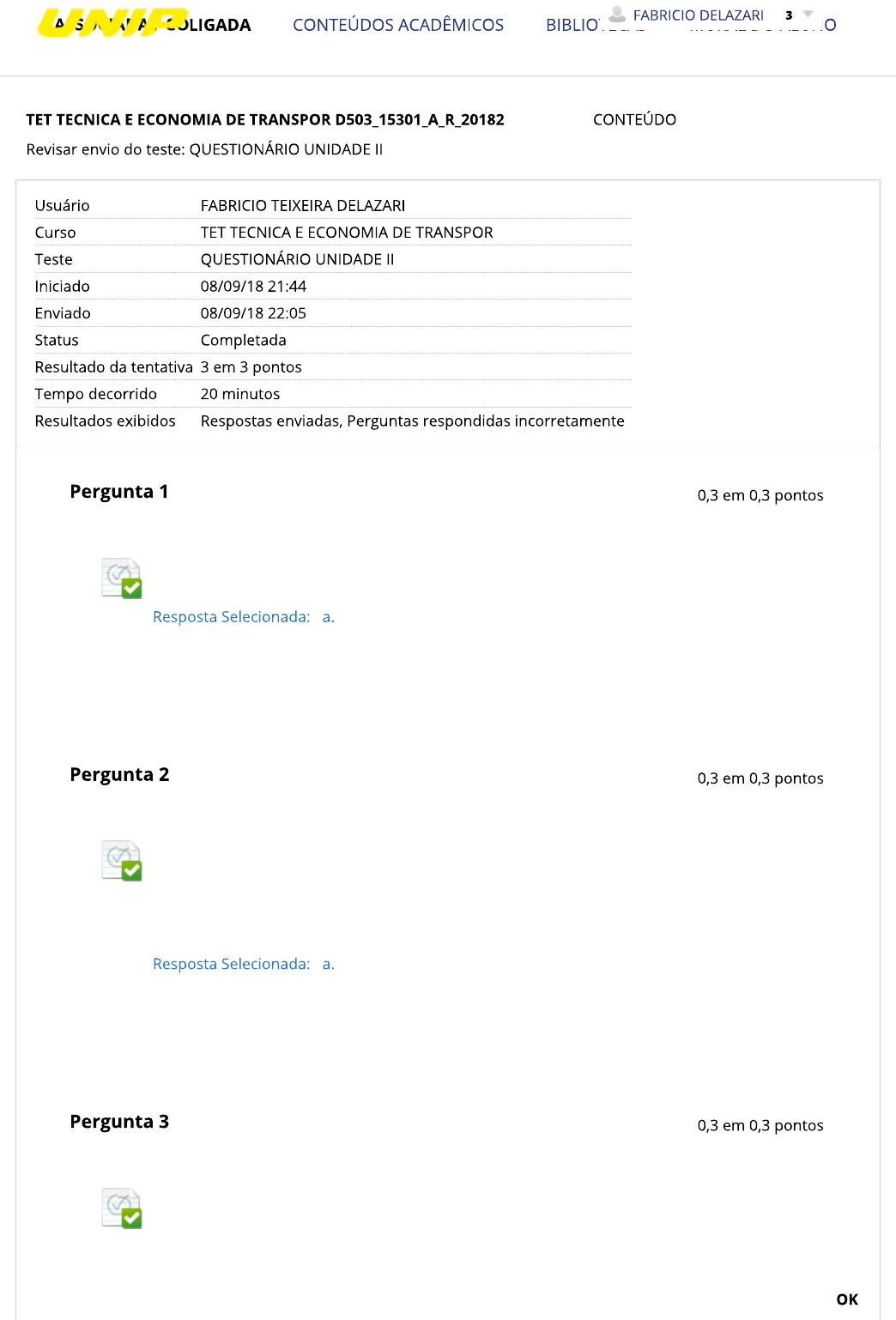 A área de marketing atendida pela Logística é composta de: Pesquisa de mercado, distribuição, vendas e comunicação. Assinale a área correta da logística empresarial que planeja, opera e controla o fluxo e as informações correspondentes ao retorno dos bens de pós-vendas e pós-consumo ao ciclo de negócios ou ao ciclo produtivo por meio de canais de distribuição reversos, agregando- lhes valor de diversas naturezas. Logística reversa. Deseja-se transportar um produto P de A para B. O preço do produto P é de R$1000,00 e as alternativas de transporte são: rodoviário (R), ferroviário (F) e aeroviário (A). Os custos de transporte (ct) de P são, respectivamente: ct(R) = R$300,00; ct(F) = R$100,00; ct(A) = R$500,00. Os tempos de transporte (tt) de P são, respectivamente: tt(R) = 3,5 dias; tt(F) = ← Revisar envio do teste: QUESTIONÁRIO UNIDADE II – D503_... https://ava.ead.unip.br/webapps/assessment/review/review.jsp?attempt... 1 of 4 08/09/2018 22:05 8,0 dias e tt(A) = 1,0 dia. O cliente acerta uma bonificação de 5% sobre o preço do produto P para cada dia de antecipação de entrega em relação ao maior tempo de entrega. Supondo que o fornecedor paga o frete, qual a sequência de melhores alternativas para ele? R, depois F e depois A. Em logística, existem dois prazos cruciais para a eficiência do processo: o prazo logístico, resultante da soma dos tempos de aquisição dos insumos, de manufatura do produto e de entrega ao cliente; e o ciclo do pedido do cliente, que é o tempo decorrido entre o pedido e o recebimento do produto pelo cliente. Considerando essa observação, avalie as seguintes asserções e a relação proposta entre elas. I. Um dos desafios da logística está em igualar o prazo logístico ao ciclo do pedido do cliente. PORQUE II. Os consumidores querem os bens e os serviços no tempo, no lugar e com a qualidade contratada. A respeito dessas asserções, assinale a opção correta. As asserções I e II são proposições verdadeiras, mas a II não é uma justificativa da I. Em relação ao tempo de ciclo, à velocidade média ou operacional, à eficiência e à ineficiência operacional, assinale a alternativa correta: Todas as alternativas são corretas. Revisar envio do teste: QUESTIONÁRIO UNIDADE II – D503_... https://ava.ead.unip.br/webapps/assessment/review/review.jsp?attempt... 2 of 4 08/09/2018 22:05 O conhecimento da variação da demanda no espaço e no tempo é fundamental para o dimensionamento adequado da oferta de uma linha de ônibus. A partir dessa afirmação, assinale a alternativa INCORRETA: Variações mensais não são usadas para cálculos tarifários, distribuição da receita entre as empresas (por meio de câmaras de compensação) e planejamento econômico-financeiro das empresas. Para programar a operação de uma linha de ônibus é necessário levantar e obter os dados e informações para a caracterização da demanda e que possibilitem o cálculo do volume e do fluxo de passageiros, da ocupação crítica e do índice de renovação. As pesquisas de apoio utilizadas para o levantamento desses dados e informações são: Pesquisa de Anotação de Catraca e Pesquisa Sobe e Desce. Para uma demanda bruta real de 1.100 passageiros/hora, já considerado o Índice de Renovação, utilizando-se de um veículo Padron cuja capacidade é de 110 passageiros, a quantidade necessária de viagens por hora será de: 10 viagens por hora. Sobre custos logísticos, considere os seguintes fatores: 1. Aumento da competição internacional. 2. Alterações populacionais. 3. Formação de blocos econômicos. 4. Escassez de recursos. Influenciam o incremento dos custos logísticos: Revisar envio do teste: QUESTIONÁRIO UNIDADE II – D503_... https://ava.ead.unip.br/webapps/assessment/review/review.jsp?attempt... 3 of 4 08/09/2018 22:05 Somente 1, 2 e 4. Verifique as afirmações a seguir referentes às pesquisas essenciais para a caracterização da demanda de passageiros de linhas de ônibus existentes: I - Pesquisa de catraca ou operacional e/ou relatório diário de bordo (registro dos horários de chegada e saída dos ônibus de uma determinada linha nos pontos inicial e final e dos contadores das catracas, conhecendo-se, assim, os tempos de parada e de percurso e a frota utilizada); II - Pesquisa de Embarque e Desembarque (E/D) ou sobe e desce (registro dos passageiros embarcados e desembarcados em cada ponto de uma linha de ônibus em uma dada viagem – serve para determinar o índice de renovação). III- Pesquisa de Origem e Destino (Pesquisa O/D). Assinale a alternativa correta: As afirmações I e II são verdadeiras. Revisar envio do teste: QUESTIONÁRIO UNIDADE II – D503_... https://ava.ead.unip.br/webapps/assessment/review/review.jsp?attempt... 4 of 4 08/09/2018 22:05