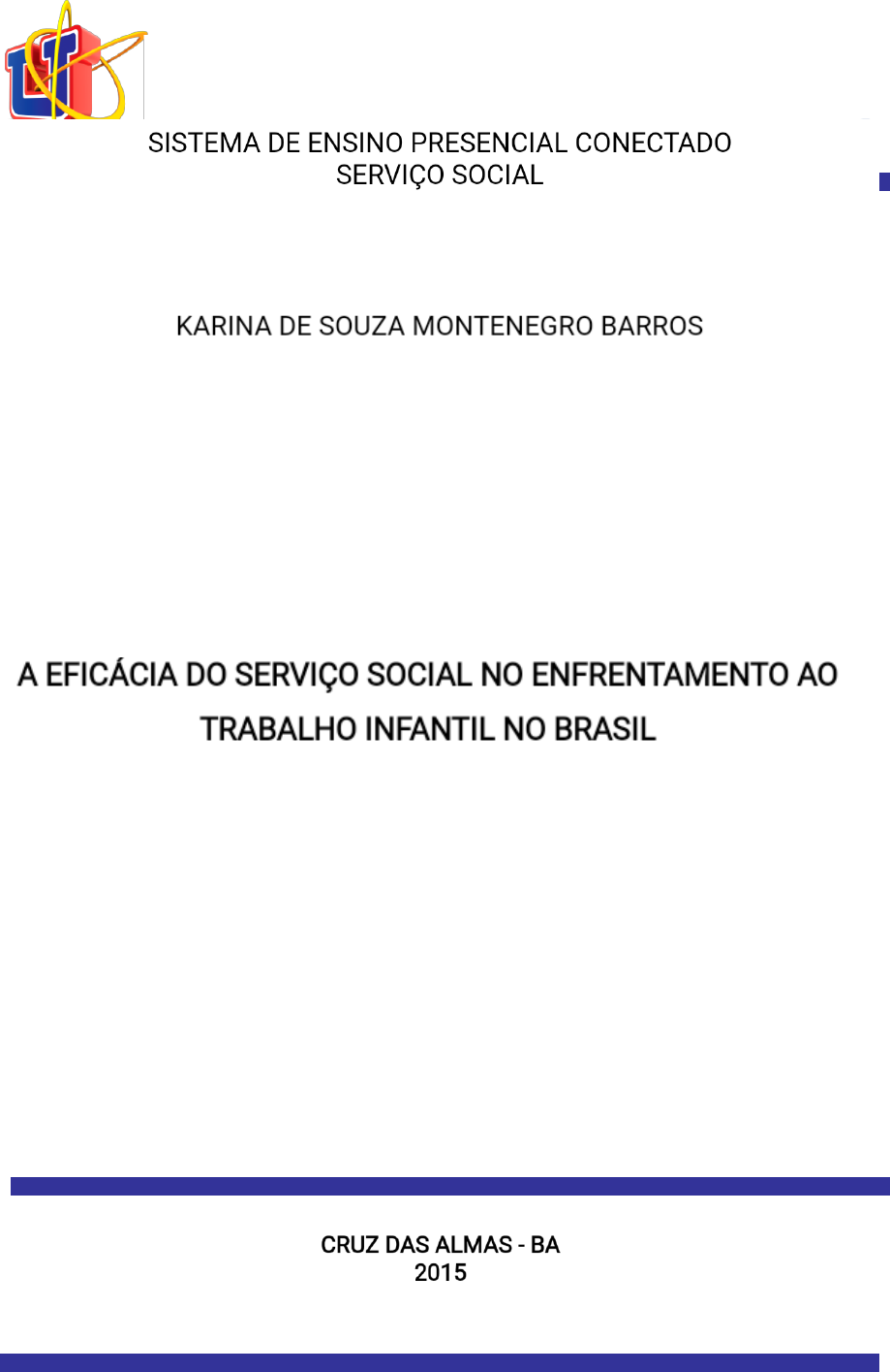 Sistema de Ensino Presencial Conectado Serviço social karina de souza Montenegro Barros A EFICÁCIA do serviço social no enfrentamento AO trabalho infantil no brasil CRUZ DAS ALMAS-BA 2015 CRUZ DAS ALMAS - BA 2015 karina de souza montenegro Barros A EFICÁCIA do serviço social no enfrentamento AO trabalho infantil no brasil Projeto de Pesquisa apresentado ao Curso Serviço Social da UNOPAR - Universidade Norte do Paraná, para as disciplinas de Instrumentalidade em Serviço Social; Movimentos Sociais; Politicas Setoriais e Oficina de Formação. Professores: Amanda Boza G. Carvalho; Maria Ângela Santini; Maria Lucimar Pereira e Rodrigo Zambon SUMÁRIO INTRODUÇÃO Neste projeto será abordado o trabalho infantil de crianças e adolescentes, dando ênfase aos direitos da infância e da juventude, como também o papel do assistente social frente a essa problemática. Esta pesquisa terá como base um assunto muito debatido na atualidade, sobre este contexto é necessário compreendermos que tal tema é complexo e para tanto, vamos analisar como os autores tem desenvolvido este tema. Portanto o objetivo dessa pesquisa e mostrar como o Brasil tem enfrentado a questão da exploração de crianças no trabalho, qual o papel do Serviço Social diante dessa questão; com base no Estatuto da Criança e do Adolescente (ECA). 2. DELIMITAÇÃO E FORMULAÇÃO DO PROBLEMA A Prática do trabalho infantil no Brasil. 3. OBJETIVOS 3.1 Objetivos geral: Avaliar a prática do assistente social no enfrentamento ao trabalho infantil. 3.2 Objetivos específicos : Promover a reflexão sobre o trabalho infantil no Brasil Identificar as causas e consequências do trabalho infantil Apontar a prática da assistência social no Brasil; 4. JUSTIFICATIVA No Brasil o trabalho infantil é um grande problema social onde milhares de crianças sofrem sequelas físicas e psicológicas graves decorrentes de trabalhos excessivos que exigem esforços além da sua condição física, milhares de ainda deixam de ir para a escola para trabalhar em lavouras e em outras atividades que ajudam no sustento da família. Os indicadores sobre a participação de crianças na força de trabalho mostram que essa participação cresce com a idade, que é maior entre os meninos do que entre meninas e que é mais elevada na área rural do que na urbana. 5. METODOLOGIA A metodologia utilizada neste projeto seguiu os princípios da pesquisa bibliográfica sobre a eficácia do assistente social no enfrentamento ao trabalho infantil, sendo ela realizada por meio de pesquisas na internet, leitura de artigos e livros relacionados ao tema também colaboraram com a construção desse trabalho. 6. REVISÃO BIBLIOGRÁFICA Conhecer a realidade do trabalho infantil implica conhecer também as condições desumanas em que ele ocorre. As crianças trabalhadoras desenvolvem atividades penosas, perigosas, e muitas vezes inadequadas também para adultos. Vários desses aspectos podem ser mais facilmente identificados no campo, na cultura da cana de açúcar, nas carvoarias, no sisal e nas pedreiras, dentre outros. Nos centros urbanos, o trabalho infantil é visível nas ruas e, especialmente, nos depósitos de lixo. Crianças e adolescentes recolhem garrafas, latas e papel para reciclagem e convivem com materiais contaminados. Nas cidades, além dos lixões e do trabalho nas ruas, outra forma de inserção, menos visível, é o emprego doméstico e em pequenos empreendimentos (lojas, fábricas e escritórios familiares ou de pequeno porte). O trabalho na infância marca, quando não destrói, a vida digna e saudável de crianças e jovens, tratados como se não tivessem direito a ter direitos, mesmo os mais fundamentais. Os direitos de crianças e adolescentes A década de 1980, foi um período de intensos movimentos sociais, que surgiram da necessidade de luta por direitos sociais e melhores condições de vida para os trabalhadores , a população e também para o atendimento de Crianças e adolescentes vitimas de descasos ,violências e trabalho infantil no Brasil. Um dos Movimento de grande importância nessa década foi o Movimento Nacional de Meninos e Meninas de Rua (MNMMR)que tinham como objetivo principal garantir o direitos dessas crianças. Esse Movimento surge como primeira resposta da primeira lei que garantia de fato dos direitos da criança e do adolescente e contribuíram para a criação do Estatuto da Criança e do Adolescente (ECA). O MNMMR passou a trabalhar com as criança e o adolescente que eram marginalizados , viviam nas ruas e não possuíam autonomia e capacidade de refletir; viviam em condições precária, alguns órfãos outros abandonados por suas família. Os direitos de crianças e adolescentes são assegurados pela Constituição Brasileira e especificados no Estatuto da Criança e do Adolescente. O Estatuto assegura a toda criança e adolescente os direitos básicos de viver, de desenvolver-se saudavelmente, de educar-se e de receber proteção. No que se refere ao trabalho de crianças e adolescentes, os artigos 60 a 69 do ECA são inteiramente dedicados ao tema. A legislação determina a idade mínima de 16 anos para o ingresso no trabalho. O trabalho da criança de zero a 14 anos permanece terminantemente proibido. Ao adolescente entre 14 e 16 anos é facultado o trabalho na condição de aprendiz. Ao ingressar em um emprego, o adolescente maior de 16 anos tem todos os direitos assegurados ao trabalhador na CLT. É diante dessa situação o que o profissional do Serviço Social deve intervir na busca da proteção, garantindo a efetivação dos direitos referentes à criança e ao adolescente. Serviço social e o trabalho infantil A ação do Serviço Social se volta no enfrentamento das condições sociais, seja ela nos mais variados campos, visando intervir sobre as situações de vulnerabilidade e risco social, contribuindo para uma abordagem global que vai além da demanda apresentada. Dentro desta perspectiva é q