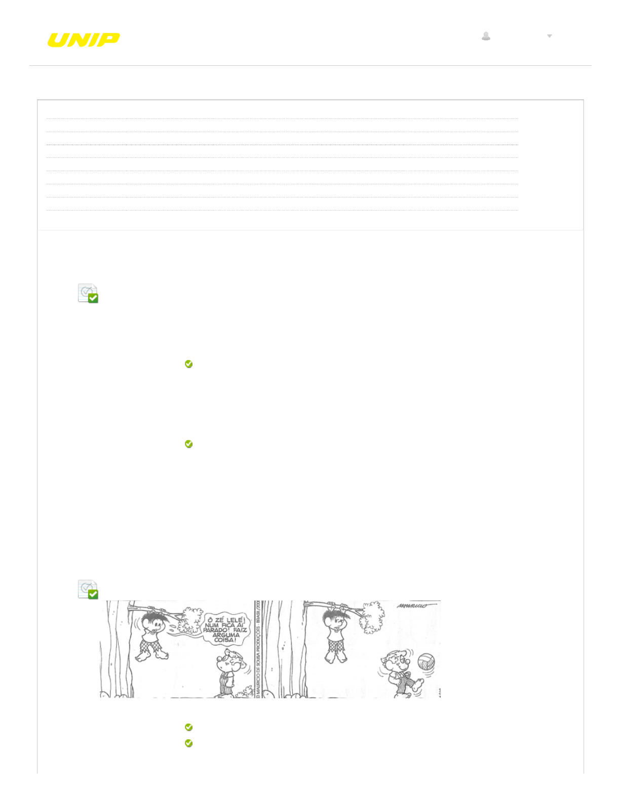 8/27/2018 Revisar envio do teste: QUESTIONÁRIO UNIDADE II – 5442-... https://ava.ead.unip.br/webapps/assessment/review/review.jsp?attempt_id=_6754992_1&course_id=_21519_1&content_id=_334542_1&return_conte… 1/5 Revisar envio do teste: QUESTIONÁRIO UNIDADE IILINGUISTICA GERAL 5442-60_59625_R_20182 CONTEÚDO Usuário Kelly fernandes da silva vieira Curso LINGUISTICA GERAL Teste QUESTIONÁRIO UNIDADE II Iniciado 27/08/18 22:17 Enviado 27/08/18 22:23 Status Completada Resultado da tentativa 3 em 3 pontos Tempo decorrido 6 minutos Resultados exibidos Todas as respostas, Respostas enviadas, Respostas corretas, Comentários, Perguntas respondidas incorretamente Pergunta 1 Resposta Selecionada: e. Respostas: a. b. c. d. e. Feedback da resposta: A Linguística é considerada uma ciência devido às propostas de estudo da língua de Ferdinand de Saussure. Consideram-se: I - As ideias de Saussure foram publicadas no famoso Curso de Linguística Geral, de 1916, pelos alunos Charles Bally e Albert Sechehaye. II - É no curso que são encontrados os conceitos fundamentais do modelo teórico estruturalista. III - Saussure enfatizou a ideia de que a língua é um sistema. Todas estão corretas. Apenas I está correta. Apenas II está correta. Apenas III está correta. II e III estão corretas. Todas estão corretas. Resposta correta: e). Durante suas aulas na Universidade em Genebra, Saussure estabeleceu os conceitos principais dos estudos da língua. Tais conceitos foram publicados em 1916, três anos após a morte deste linguista, no livro Curso de Linguística Geral, por dois discípulos. Pergunta 2 Resposta Selecionada: a. Respostas: a. b. Chico Bento pode ser considerado um típico habitante da zona rural, comumente chamado de “roceiro” ou “caipira”. Considerando a sua fala, essa tipicidade é con�rmada primordialmente: SOUZA, Maurício de. [Chico Bento]. O Globo, Rio de Janeiro, Segundo Caderno, 19 dez. 2008, p.7. pela transcrição da fala característica de áreas rurais. pela transcrição da fala característica de áreas rurais. pela redução do nome “José” para “Zé”, comum nas comunidades rurais. CONTEÚDOS ACADÊMICOS BIBLIOTECAS MURAL DO ALUNO TUTORIAISUNIP EAD 0,3 em 0,3 pontos 0,3 em 0,3 pontos Kelly vieira 8 8/27/2018 Revisar envio do teste: QUESTIONÁRIO UNIDADE II – 5442-... https://ava.ead.unip.br/webapps/assessment/review/review.jsp?attempt_id=_6754992_1&course_id=_21519_1&content_id=_334542_1&return_conte… 2/5 c. d. e. Feedback da resposta: pelo emprego de elementos que caracterizam sua linguagem como coloquial. pela escolha de palavras ligadas ao meio rural, incomuns nos meios urbanos. pela utilização da palavra “coisa”, pouco frequente nas zonas mais urbanizadas. Resposta correta: a). A língua, em um estudo sincrônico, apresenta variação. No caso da língua portuguesa no Brasil, a língua – hoje, neste momento – apresenta variação caipira, gaúcha, carioca etc. Pergunta 3 Resposta Selecionada: a. Respostas: a. b. c. d. e. Feedback da resposta: Dado que o signo linguístico é o resultado da união de conceito (signi�cado) com uma imagem acústica (signi�cante), como representado na �gura abaixo, no que concerne a arbitrariedade do signo? Na relação convencional entre o signi�cante e o signi�cado. Na relação convencional entre o signi�cante e o signi�cado. Na relação convencional entre o objeto e o nome. Na relação convencional entre o fonema e a letra. Na relação convencional entre o sentido do signo e o objeto. Na relação convencional entre os morfemas. Resposta correta: a). O signo linguístico é convencional entre suas próprias partes: signi�cado e signi�cante. A�nal, não há nada na sequência, por exemplo, dos fonemas /kaza/ que remetam ao sentido de lar, moradia. Mas, a partir do momento em que foi dado um sentido a uma sequência fonética, essa associação não é mais desfeita. Pergunta 4 Resposta Selecionada: c. Respostas: a. b. c. d. e. Feedback da resposta: Em relação à teoria dos gerativistas de Princípios e Parâmetros, qual frase não preenche o lugar do sujeito devido às especi�cidades da língua? “Viu João?” “Did you see John?” “Tu viste a Juan?” “Viu João?” “Sim, eu vi o João.” “Yes, I saw him.” Resposta correta: c). Segundo os Princípios, as línguas possuem sujeito e predicado. No caso da língua inglesa, por exemplo, o sujeito sempre é preenchido por um termo, mesmo que ele não tenha signi�cação (“it”, no caso). Ao contrário da língua inglesa, a língua portuguesa admite uma oração em que o lugar do sujeito �que vazio. Pergunta 5 0,3 em 0,3 pontos 0,3 em 0,3 pontos 0,3 em 0,3 pontos 8/27/2018 Revisar envio do teste: QUESTIONÁRIO UNIDADE II – 5442-... https://ava.ead.unip.br/webapps/assessment/review/review.jsp?attempt_id=_6754992_1&course_id=_21519_1&content_id=_334542_1&return_conte… 3/5 Resposta Selecionada: b. Respostas: a. b. c. d. e. Feedback da resposta: Foi Saussure que estabeleceu os estudos linguísticos em um nível cientí�co, mas foi outro linguista, posterior a Saussure, que relacionou tais estudos ao termo “estruturalismo”. Esse outro linguista é: Roman Jakobson. Charles Bally. Roman Jakobson. Leonard Bloom�eld. Noam Chomsky. André Martinet. Resposta correta: b). O primeiro paradigma da Linguística é nomeado de Estruturalismo. Foi Jakobson, em um congresso, o primeiro a empregar a palavra estruturalismo para designar a ideia de sistema de Saussure. Pergunta 6 Resposta Selecionada: a. Respostas: a. b. c. d. e. Feedback da resposta: Leia as assertivas, marcando, posteriormente, a alternativa correta (V – VERDADEIRA e F – FALSA) em relação a cada a�rmação. I - Para os gerativistas, a teoria estruturalista de aquisição da linguagem é inadequada por não dar conta da criatividade da linguagem humana. II - A gramática gerativo-transformacional deu-se conta de que todo falante nativo pode em