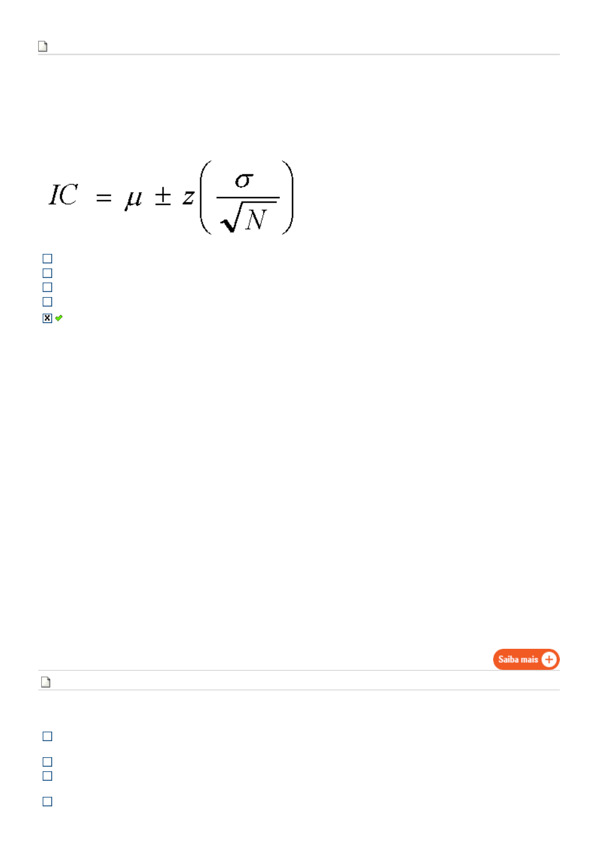 06/06/2018 Conteúdo Interativo http://estacio.webaula.com.br/Classroom/index.html?id=2021953&classId=931582&topicId=2709891&p0=03c7c0ace395d80182db07ae2c30f034&enableForum= 1a Questão Suponha que X represente a duração da vida de uma peça de equipamento. Admita-se que 256 peças sejam ensaiadas, fornecendo uma duração de vida média de 100 horas. Suponha-se que seja conhecido o desvio padrão igual a 8 horas, e que se deseje obter um intervalo de confiança de 95 % para a média (usar 1,96). Qual o intervalo de confiança? [Limite Inferior do IC = Média - 1,96 . (desvio padrão dividido pela raiz quadrada da amostra)] [Limite Superior do IC = Média + 1,96 . (desvio padrão dividido pela raiz quadrada da amostra)] 96,02 a 96,98 56,02 a 56,98 56,02 a 96,98 96,02 a 100,98 99,02 a 100,98 Explicação: 1ª passo - Cálculo do Erro Amostral: Erro Amostral = Desvio Padrão / Raiz quadrada da amostra EP = 8 / √256 EP = 8 / 16 EP = 0,5 2º passo - Verificar na Tabela de Distribuição Normal o número de Unidades de Desvio Padrão a partir da média para uma confiança de 95%: 1,96 3º passo - Calcular os limites do Intervalo de Confiança fazendo: limites = média (+ ou -) desvio padrão x Erro padrão limite inferior = 100 ¿ 1,96 x 0,5 = 99,02 limite superior = 100 + 1,96 x 0,5 = 100,98 O Intervalo de Confiança será entre 99,02 e 100,98 horas. Ref.: 201701249489 2a Questão Em um Fórum de discussão de Estatística, surgiu uma pergunta feita pelo Tutor "- Como podemos compreender o conceito de Intervalo de Confiança ?" Abaixo há as respostas. Marque a resposta correta. O Aluno C disse: "-Intervalos de Confiança são os quartis e o desvio padrão para encontrarmos um valor na tabela Z." O Aluno B disse: "-Intervalos de Confiança é a probabilidade de um evento qualquer em uma pesquisa." O Aluno E disse: "-O Desvio padrão mais a média resulta no limite do Intervalo de Confiança, sendo este o mínimo de confiabilidade." O Aluno D disse: "-Média mais a probabilidade de um evento resulta no Intervalo de Confiança." 06/06/2018 Conteúdo Interativo http://estacio.webaula.com.br/Classroom/index.html?id=2021953&classId=931582&topicId=2709891&p0=03c7c0ace395d80182db07ae2c30f034&enableForum= O Aluno A disse: "- Intervalos de confiança são usados para indicar a confiabilidade de uma estimativa. Por exemplo, um IC pode ser usado para descrever o quanto os resultados de uma pesquisa são confiáveis." Explicação: Por definição: Um intervalo de confiança (IC) é um intervalo estimado de um parâmetro de interesse de uma população. Em vez de estimar o parâmetro por um único valor, é dado um intervalo de estimativas prováveis. O quanto estas estimativas são prováveis será determinado pelo coeficiente de confiança , para . Intervalos de confiança são usados para indicar a confiabilidade de uma estimativa. Por exemplo, um IC pode ser usado para descrever o quanto os resultados de uma pesquisa são confiáveis. Sendo todas as estimativas iguais, uma pesquisa que resulte num IC pequeno é mais confiável do que uma que resulte num IC maior. Ref.: 201701645034 3a Questão Em um dado mês, uma amostra de 30 colaboradores é selecionada de um grande número de empregados de uma fábrica, teve uma média da amostra de salários de R$ 788,00, com desvio padrão da amostra de R$ 144,00. Estimamos a média dos salários para todos os empregados horistas na empresa com intervalo estimado de forma que podemos estar em 95% confiantes de que o intervalo inclui o valor médio da população. Nestas condições, o intervalo de confiança é, aproximadamente: 736,00 a 864,00 839,00 a 864,00 736,00 a 932,00 736,00 a 839,00 644,00 a 839,00 Explicação: 1ª passo - Cálculo do Erro Amostral: Erro Amostral = Desvio Padrão / Raiz quadrada da amostra EP = 144 / √30 EP = 144 / 5,48 EP = 26,28 2º passo - Verificar na Tabela de Distribuição Normal o número de Unidades de Desvio Padrão a partir da média para uma confiança de 95%: 1,96 3º passo - Calcular os limites do Intervalo de Confiança fazendo: limites = média (+ ou -) desvio padrão x Erro padrão limite inferior = 788 ¿ 1,96 x 26,28 = 736,49 limite superior = 788 + 1,96 x 26,28 = 839,51 O Intervalo de Confiança será entre 736,49 e 839,51 horas. Ref.: 201701930682 4a Questão Suponha que X represente a duração da vida de uma peça de equipamento. Admita-se que 144 peças sejam ensaiadas, fornecendo uma duração de vida média de 100 horas. Suponha-se que seja conhecido o desvio 06/06/2018 Conteúdo Interativo http://estacio.webaula.com.br/Classroom/index.html?id=2021953&classId=931582&topicId=2709891&p0=03c7c0ace395d80182db07ae2c30f034&enableForum= padrão igual a 6 horas, e que se deseje obter um intervalo de confiança de 95 % para a média (usar 1,96). Qual o intervalo de confiança? [Limite Inferior do IC = Média - 1,96 . (desvio padrão dividido pela raiz quadrada da amostra)] [Limite Superior do IC = Média + 1,96 . (desvio padrão dividido pela raiz quadrada da amostra)] 99,02 a 100,98 96,02 a 106,98 44,02 a 100,98 99,02 a 144,98 44,02 a 144,98 Explicação: 1ª passo - Cálculo do Erro Amostral: Erro Amostral = Desvio Padrão / Raiz quadrada da amostra EP = 6 / √144 EP = 6 / 12 EP = 0,5 2º passo - Verificar na Tabela de Distribuição Normal o número de Unidades de Desvio Padrão a partir da média para uma confiança de 95%: 1,96 3º passo - Calcular os limites do Intervalo de Confiança fazendo: limites = média (+ ou -) desvio padrão x Erro padrão limite inferior = 100 ¿ 1,96 x 0,5 = 99,02 limite superior = 100 + 1,96 x 0,5 = 100,98 O Intervalo de Confiança será entre 99,02 e 100,98 horas. Ref.: 201701248861 5a Questão Uma amostra de 36 estudantes foi selecionada de um grande número de estudantes de uma Universidade, e teve uma média de notas 6,0, com desvio padrão da amostra de 1,2. Determine o intervalo de confiança de forma que podemos estar em 95% confiantes de que o mesmo inclui o valor mé