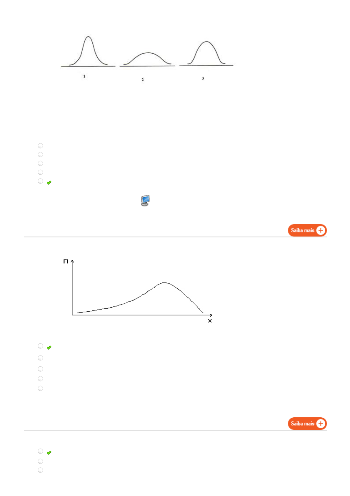 01/06/2018 Conteúdo Interativo http://estacio.webaula.com.br/Classroom/index.html?id=2021953&classId=931807&topicId=2714829&p0=03c7c0ace395d80182db07ae2c30f034&enableForum= Na figura a seguir as curvas numeradas de 1 a 3 são respec�vamente denominadas: 1) Analisando a curva abaixo marque a resposta correta As distribuições podem ser classificadas como: 1. Mesocúrtica, Leptocúrtica e Platicúrtica. Platicúrtica, Mesocúrtica e Leptocúrtica. Mesocúrtica, Platicúrtica e Leptocúrtica. Leptocúrtica, Mesocúrtica e Platicúrtica. Leptocúrtica, Platicúrtica e Mesocúrtica. Gabarito Coment. 2. a curva é assimétrica negativa a curva é assimétrica positiva ou à direita a curva é assimétrica nula a curva é simétrica a curva é simétrica positiva e a média é igual a moda 3. Distribuição Assimétrica positiva, Distribuição Assimétrica negativa e Distribuição Simétrica. Distribuição Simétrica Nula, Distribuição maior que 1 e Distribuição Assimétrica menor que 1. Distribuição Simétrica positiva, Distribuição Simétrica negativa e Distribuição Assimétrica. 01/06/2018 Conteúdo Interativo http://estacio.webaula.com.br/Classroom/index.html?id=2021953&classId=931807&topicId=2714829&p0=03c7c0ace395d80182db07ae2c30f034&enableForum= Quando a diferença entre a moda e a média é igual a zero, temos que tipo de assimetria? O número 0,263 faz parte do cálculo da(o): Relações de medidas de distribuição em que a MO < Md < Média, denomina-se: Se as medidas de posição forem idênticas teremos uma distribuição: Distribuição Normal, Curtose e Assimetria da Curva. Distribuição Normal positiva, Distribuição Normal negativa e Distribuição Normal Simétrica. Gabarito Coment. 4. Negativa ou à direita. Positiva ou à esquerda. Negativa ou à esquerda. Positiva ou à direita. Nula ou distribuição simétrica. Gabarito Coment. 5. Dispersão Assimetria Coeficiente de variação Curtose Amplitude Gabarito Coment. 6. Distribuição simétrica acondicionada. Distribuição assimétrica positiva. Distribuição simétrica condicionada. Distribuição simétrica relacional. Distribuição assimétrica de qualidade. Gabarito Coment. 7. simétrica assimétrica a direita assimétrica positiva assimétrica a esquerda 01/06/2018 Conteúdo Interativo http://estacio.webaula.com.br/Classroom/index.html?id=2021953&classId=931807&topicId=2714829&p0=03c7c0ace395d80182db07ae2c30f034&enableForum= Sobre o Coeficiente Percentílico de Curtose é correto afirmar que: assimétrica negativa 8. Se o coeficiente for maior que 0,263 temos uma distribuição leptocúrtica. Se o coeficiente for negativo temos uma distribuição mesocúrtica. Se o coeficiente for igual a 0,263 temos uma distribuição mesocúrtica. Se o coeficiente for igual a 0,263 temos uma distribuição platicúrtica. Se o coeficiente for menor que 0,263 temos uma distribuição platicúrtica.