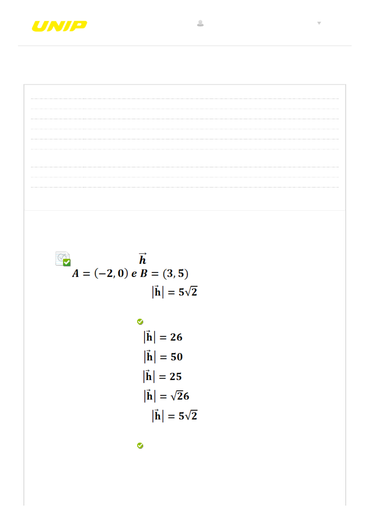 12/09/2018 Revisar envio do teste: ATIVIDADE TELEAULA III – 6655-60... https://ava.ead.unip.br/webapps/assessment/review/review.jsp?attempt_id=_7474457_1&course_id=_21685_1&content_id=_337376_1&return_c… 1/3 Revisar envio do teste: ATIVIDADE TELEAULA III MATEMÁTICA PARA COMPUTAÇÃO 6655-60_57501_R_20182 CONTEÚDO Usuário gustavo.ferreira14 @unipinterativa.edu.br Curso MATEMÁTICA PARA COMPUTAÇÃO Teste ATIVIDADE TELEAULA III Iniciado 12/09/18 10:38 Enviado 12/09/18 10:52 Status Completada Resultado da tentativa 0 em 0 pontos Tempo decorrido 14 minutos Autoteste O aluno responde e o resultado do aluno não é visível ao professor. Resultados exibidos Todas as respostas, Respostas enviadas, Respostas corretas, Comentários, Perguntas respondidas incorretamente Pergunta 1 Resposta Selecionada: e. Respostas: a. b. c. d. e. Calcule a norma do vetor , com origem no ponto A e término no ponto B: Resposta: E. Resposta: E. Pergunta 2 CONTEÚDOS ACADÊMICOS BIBLIOTECAS MURAL DO ALUNO TUTORIAISUNIP EAD 0 em 0 pontos 0 em 0 pontos gustavo.ferreira14 @unipinterativa.ed... 12/09/2018 Revisar envio do teste: ATIVIDADE TELEAULA III – 6655-60... https://ava.ead.unip.br/webapps/assessment/review/review.jsp?attempt_id=_7474457_1&course_id=_21685_1&content_id=_337376_1&return_c… 2/3 Resposta Selecionada: b. Respostas: a. b. c. d. e. Calcule o resultado da expressão e assinale a alternativa correta: Resposta: B. Pergunta 3 Resposta Selecionada: a. Respostas: a. b. c. d. e. Qual alternativa contém o determinante da matriz: 0 0 8 -12 9 7 Resposta: A. 0 em 0 pontos 12/09/2018 Revisar envio do teste: ATIVIDADE TELEAULA III – 6655-60... https://ava.ead.unip.br/webapps/assessment/review/review.jsp?attempt_id=_7474457_1&course_id=_21685_1&content_id=_337376_1&return_c… 3/3 Quarta-feira, 12 de Setembro de 2018 10h53min03s BRT Pergunta 4 Resposta Selecionada: a. Respostas: a. b. c. d. e. Uma das alternativas abaixo contém a solução correta para o sistema de equações abaixo, assinale-a: Resposta: A. ← OK 0 em 0 pontos