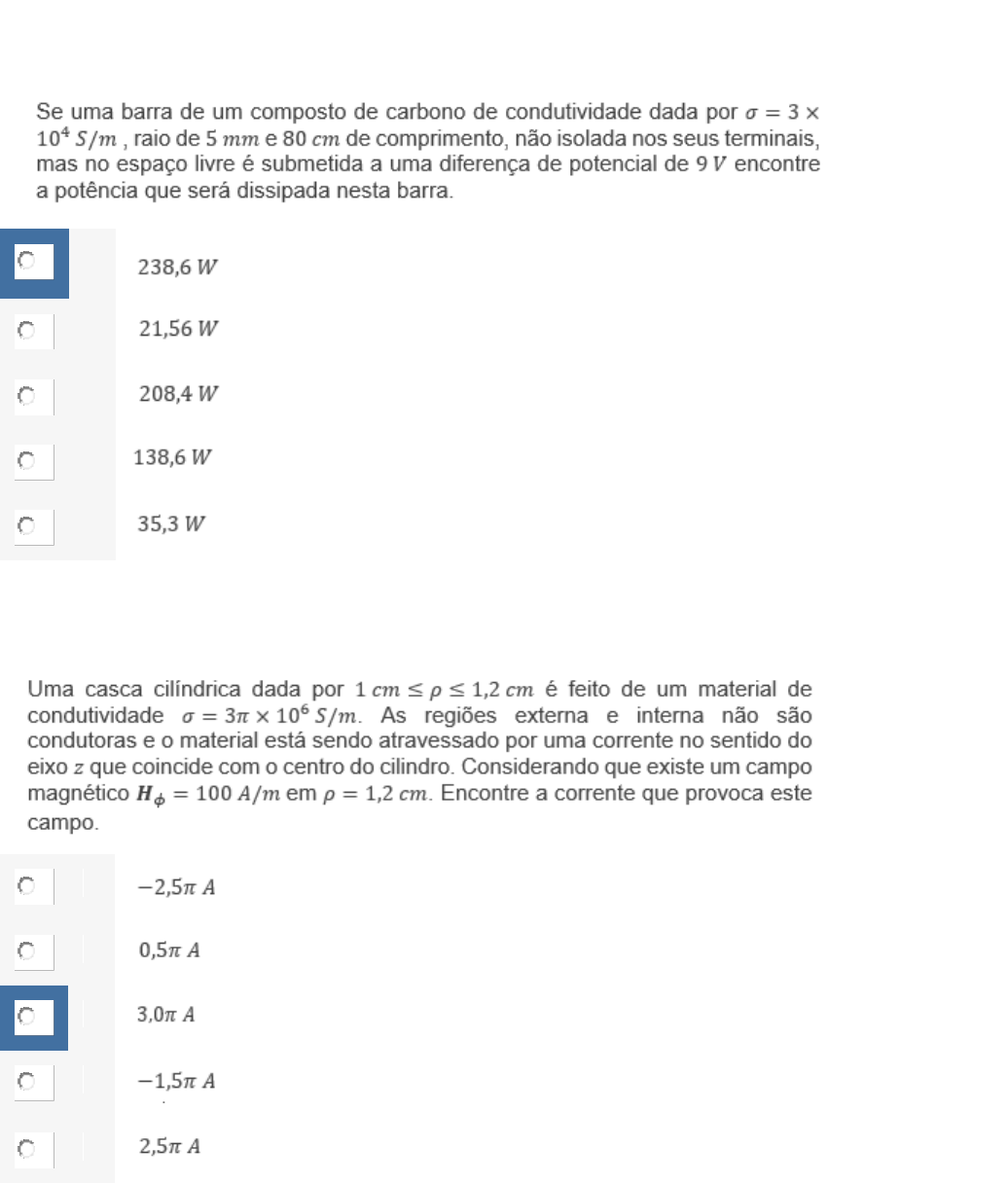 Apol 03 Eletromgnetismo Nota 100 Questão 1/5 - Eletromagnetismo Uma barra condutora, isolada no espaço livre exceto pelos seus terminais, pode ser atravessada por um campo elétrico. A B C D E Questão 2/5 - Eletromagnetismo A Lei Circuital de Ampère permite encontrar o campo elétrico provocado por uma distribuição de corrente em um condutor ou no espaço. A B C D E Questão 3/5 - Eletromagnetismo Partindo das Leis de Biot-Savart e Ampère, é possível descobrir as equações necessárias ao entendimento dos campos magnéticos provocados por distribuições geométricas de corrente. A B C D E Questão 4/5 - Eletromagnetismo Um condutor de uma liga de cobre não isolada nos seus terminais, foi moldado de forma a ter três diâmetros diferentes. A B C D E Questão 5/5 - Eletromagnetismo A densidade de corrente é, para o eletromagnetismo, tão ou mais importante que a corrente para o estudo da eletricidade. É graças ao estudo desta grandeza que podemos inferir campos magnéticos no espaço ao redor de distribuições de corrente em volumes, superfícies e comprimentos. A B C D E