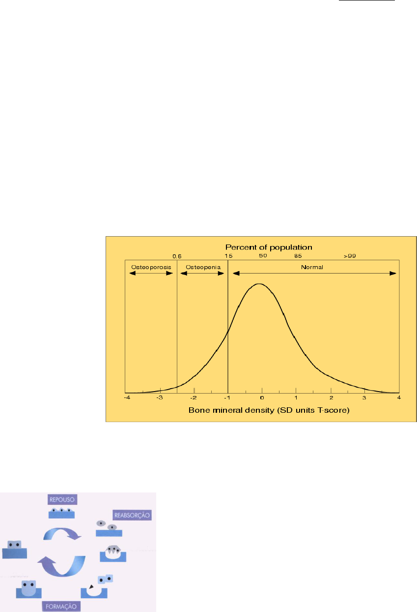 Osteoporose - No Brasil de 1950 para 2008 a taxa de crescimento caiu de 3,04% para 1,05%. - 2039: estimativa para “crescimento zero”. 2050: crescimento negativo, -0,291%. - IBGE: no ano 2010 existiam cerca de 20 milhões de idosos no Brasil (10 a 12%), 20% eram osteoporóticos (4 milhões), destes cerca de 5% tiveram fratura de colo de fêmur/ano (200 mil idosos) e foram para tto cirúrgico, a um custo de R$ 6 mil por cirurgia → 1,2 bilhões de reais/ano.* Doenças Crônico-Degenerativas: ENDÓCRINAS: diabetes melitus, doenças da tireóide, etc. VASCULARES: arterioesclerose, hipertensão arterial, doenças cardiacas, acidentes vasculares encefalicos, etc. NEUROLÓGICAS: demências, doença de Parkinson, etc. OSTEOMUSCULARES: ostedegenerativas (osteoartrose) e osteometabólicas (osteoporose).* Osteoporose 1- Apenas 10% da população tem acesso ao diagnóstico e tto. 2- O risco de fratura de colo de fêmur na mulher é ↑ ao risco de neoplasia do útero, ovário e mama juntos. 3- A probabilidade de ocorrer fratura osteoporótica após os 50 anos até o final da vida na mulher, é de 40%, e no homem de 13%. 4- Sem tto 1 em cada 2 mulheres com osteoporose, > 70 anos, terão fratura. E após os 80 anos 2 em cada 3. 5- Complicações das fraturas de fêmur em idosos: 50 % irão necessitar de ajuda para a marcha. 30% ficarão funcionalmente dependente para realização de trabalhos domésticos. 20% recuperam a funcionalidade. 30% morrem no primeiro ano.* - A osteoporose é uma doença degenerativa crônica que pode evoluir sem nenhum sintoma por anos ou até mesmo ser confundida com dores musculares pelo esforço físico ou má postura. (Revista Sociedade Brasileira de Geriatria e Gerontologia, 2005) - Doença esquelética sistêmica caracterizada por diminuição da massa óssea (quantitativa) e deterioração da microarquitetura óssea (qualitativa) , com aumento da fragilidade do osso e susceptibilidade aumentada para as fraturas (OMS, 1994). DEFINIÇÃO DENSITOMÉTRICA : “ Osteoporóticos são todos os indivíduos em que o valor da densidade mineral óssea (BMD) esteja acima de –2,5 desvios-padrão (DP) em relação ao adulto jovem, na presença de fraturas por fragilidade óssea. Os valores compreendidos entre –1,0 a –2,5 DP em relação ao adulto jovem são considerados como osteopênicos.”* Densidade Mineral Óssea: REMODELAÇÃO ÓSSEA OSTEOCLASTOS: REABSORÇÃO OSTEOBLASTOS: FORMAÇÃO Atividade osteoclastica = Ativ. Osteoblastica → osso normal Ativ. osteoclastica > ativ. Osteoblastica → OSTEOPOROSE* ESTRUTURA ÓSSEA NORMAL: Osso Trabecular (esponjoso) (20%): - Extremidades (porção epifisária) do radio, ulna e fêmur. - Corpos vertebrais. Osso Cortical (compacto) (80%): ossos do quadril, úmero e fêmur (porção diafisária). Antes dos 50 anos: perda quase exclusiva de osso trabecular e isto se acentua após a menopausa. Mulher perde 0,18% osso esponjoso dos 30-49 anos e 1-4% nos primeiros 5 anos na pós-menopausa. Mulher de 80 anos: perda de 50% do osso trabecular e 30% cortical. Homem 80 anos: perda de 30% do osso trabecular.* FATORES DE RISCO: IDADE > 50 ANOS. SEXO FEMININO. NULIPARIDADE. RAÇA BRANCA E ASIATICA. TABAGISMO. ALCOOLISMO. PERDA DA GRAVIDADE. HIPOESTROGENISMO (MENOPAUSA). HISTÓRIA FAMILIAR. BAIXA ESTATURA. INGESTÃO EXCESSIVA DE CAFÉ. BAIXA EXPOSIÇÃO A LUZ SOLAR. DEFICIÊNCIA DE VIT. D. SEDENTARISMO. IMOBILIZAÇÃO PROLONGADA. DESNUTRIÇÃO. IATROGENISMO: CORTICOIDE, HEPARINA, CITOSTATICOS, ETC.* CLASSIFICAÇÃO 1- Quanto ao Tipo de Perda Óssea: Alta remodelação: grande atividade dos osteoclastos, com perda rápida de massa óssea. (pós-menopausa) Baixa remodelação: ciclos de formação e reabsorção óssea são lentos, devido a baixa atividade dos osteoclasto, com perda lenta de massa óssea. (senil) 2- Quanto a Etiopatogênia: Primaria. Osteoporose Tipo I (pós-menopausa): ♀ Mais “precoce”. Alta remodelação. ↓ estrogênios e calcitonina. Perda rápida de massa óssea. Acomete (+) ossos trabeculares. Osteoporose Tipo II (senil): ♂ Mais “tardia”. Baixa remodelação. ↓ calcitonina e Vit. D3. Perda mais lenta de massa óssea. Acomete osso cortical e trabecular. Osteoporose Idiopatica Juvenil. Osteoporose Idiopatica do adulto.* FATORES TIPO I TIPO II IDADE 51 A 65 ANOS > 70 ANOS ♀ / ♂ MULHER 2:1 DÉFICTI MASSA ÓSSEA MAIS TRABECULAR TRABECULAR E CORTICAL VELOCIDADE DE PERDA ÓSSEA ACELERADA LENTA LOCAL PREVALENTE DE FRATURA VERTEBRAS E PUNHO COLO FÊMUR E VERTEBRAS FUNÇÃO PARATIREOIDIANA DIMINUIDA AUMENTADA ABSORÇÃO DE CALCIO DIMINUIDA DIMINUIDA CAUSA PRINCIPAL MENOPAUSA SENILIDADE Secundaria. Generalizada: Genética: Osteogênese Imperfeita. Doenças endócrinas: hipertireoidismo, hiperparatireodismo, Cushing, hipoganadismo, D. Mellitus, Acromegalia,etc. Doenças Gastrointestinais: doença péptica, síndromes disabsortivas, doenças inflamatórias intestinais, hepatopatias crônicas, cirrose biliar primaria. Doenças reumatológicas: artrite reumatóide, espondilite anquilosante, artropatia psoriasica, etc. Doenças Renais: calculose renal, Sd nefrótica, IRC, hipercalcemia idiopatica. Neoplasias: mieloma, metástases. Doenças Vasculares. Iatrogenica: corticosteróides, heparina, citostáticos, anticonvulsivantes, etc. Hábitos de Vida: alcoolismo, tabagismo e desnutrição. Localizada: Algoneurodistrofia (Doença de Sudeck) – Sd dolorosa complexo regional Imobilização Prolongada. Osteoporose Transitória.* MANIFESTAÇÕES CLINICAS DOR: Sintoma mais comum.“Doença silenciosa”. Ocorre nas perdas ósseas acima de 30%. Quando associada a trauma: aguda, localizada, ocorre no repouso e piora no exercício, sendo mais comum a nível de coluna vertebral, podendo ocorrer também no fêmur, tíbia, punho, quadril e costelas. Pode durar dias ou semanas e ser recorrente. Pode ser continua. Acarreta instabilidade (fragilidade esquelética). Pode ser encoberta pela doença de base quando de origem secundaria. F