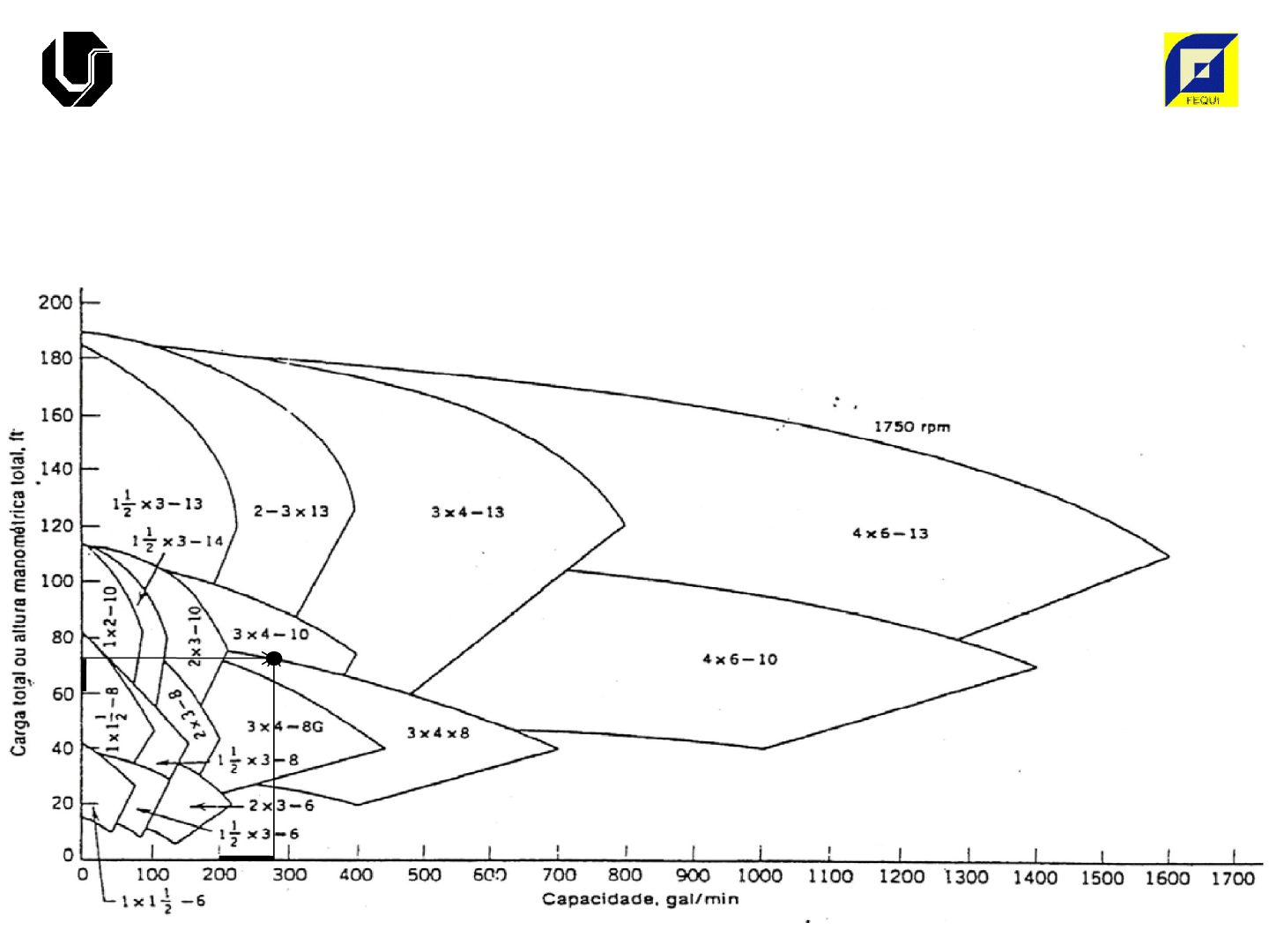 Professor Claudio Roberto Duarte 1 OPERAÇÕES UNITÁRIAS-1 BOMBAS Ex: É necessário bombear um líquido com as propriedades semelhantes ás da água, a uma vazão de 275 gal/min contra uma altura manométrica de 72 ft. Especificar a bomba. Professor Claudio Roberto Duarte 2 OPERAÇÕES UNITÁRIAS-1 Diâmetro do rotor Potência 4,7ft Professor Claudio Roberto Duarte 3 OPERAÇÕES UNITÁRIAS-1 Professor Claudio Roberto Duarte 4 OPERAÇÕES UNITÁRIAS-1 Professor Claudio Roberto Duarte 5 OPERAÇÕES UNITÁRIAS-1 BOMBAS Resposta: Modelo de bomba: 3x4 -10 O 1º número é o diâmetro da linha de descarga: 3 in O 2º número é o diâmetro da linha de sucção: 4 in O 3º número é o diâmetro máximo do rotor: 10 in Diâmetro do rotor lido na curva característica da bomba: 9 in Eficiência 66% NPSHr=4,7 ft Potência=7 ½ hp mostre que a potência vale 7,5 hp use as informações dadas para calcular. Professor Claudio Roberto Duarte 6 OPERAÇÕES UNITÁRIAS-1 BOMBAS Necessita-se de uma bomba para operar nas seguintes condições de serviços. Vazão: 300 gal/min Carga= 70ft NPSHd=7ft No almoxarifado existe uma bomba em estoque, sem uso, com os seguintes dados da placa: Modelo: 3x4-10 Vazão: 175 gal/min Drotor: 8 in Potência: 5 hp 1750 rpm Pergunta-se esta bomba poderá ser usada nesta nova condição de serviço? Professor Claudio Roberto Duarte 7 OPERAÇÕES UNITÁRIAS-1 Professor Claudio Roberto Duarte 8 OPERAÇÕES UNITÁRIAS-1 Diâmetro do rotor Potência 5,0ft Professor Claudio Roberto Duarte 9 OPERAÇÕES UNITÁRIAS-1 BOMBAS Necessita-se de uma bomba para operar nas seguintes condições de serviços. Vazão: 300 gal/min Carga= 70ft NPSHd=7ft No almoxarifado existe uma bomba em estoque, sem uso, com os seguintes dados da placa: Modelo: 3x4-10 Vazão: 175 gal/min Drotor: 8 in Potência: 5 hp 1750 rpm Pergunta-se esta bomba poderá ser usada nesta nova condição de serviço? Na curva característica para 300 gal/min e 70 ft, a bomba precisaria de um rotor de diâmetro com 9 in, um motor de 10 hp (por pouco podería-se optar pela bomba de 7 ½ hp) e um NPSHr=5ft. NPSHd=7ft> NPSHr=5ft para este requisito oK! Porém, seria necessário adquirir um novo rotor e motor. L2=2,00m 2,30m Professor Claudio Roberto Duarte 10 OPERAÇÕES UNITÁRIAS-1 Capítulo VII – Dimensionamento de Tubulações 1 - Cálculo de uma linha de sucção . Ex: Dimensionar o diâmetro da tubulação de sucção (aço-galvanizado) de uma bomba como mostra a Figura abaixo: Vazão máxima=540 L/min Bocal de sucção da bomba=2,5in Líquido bombeado: gasolina Peso específico=790 kgf/m3 Viscosidade cinemática= 6.10-6 m2/s Pressão de vapor= 3520 kgf/m2 NPSHr=1,9m (tirado da curva característica da bomba) Tubulação aço galvanizado (ε/D=0,0015) 0,30m Obs: arbitrar um diâmetro de 4 in, posteriormente avaliar a escolha e se necessário sugerir outro diâmetro. Professor Claudio Roberto Duarte 11 OPERAÇÕES UNITÁRIAS-1 Capítulo VII – Dimensionamento de Tubulações Solução – Perda nos acessórios Foust et all ; Princípios das Operações Unitárias; Guanabara Dois, 1982, 670 p. Redução de 4in para 2,5 in 2,5/4=0,625 0,625 0,26 12 Solução – Perda nos acessórios Foust et all ; Princípios das Operações Unitárias; Guanabara Dois, 1982, 670 p. 3,20ft Aprox: 1m 13 14 15 3m Professor Claudio Roberto Duarte 16 OPERAÇÕES UNITÁRIAS-1 Capítulo VII – Dimensionamento de Tubulações Solução – Primeiro passo: cálculo do comprimento equivalente Vazão máxima=540 L/min Bocal de sucção da bomba=2,5in Líquido bombeado: gasolina Peso específico=790 kgf/m3 Viscosidade cinemática= 6.10-6 m2/s Pressão de vapor= 3520 kgf/m2 NPSHr=1,9m (tirado da curva característica da bomba) Tubulação aço galvanizado (ε/D=0,0015) Arbitrar um diâmetro: 4 in o 1 redução de 4in para 2,5 in 1 ,00m 3 joelhos de 90 (L/D =30) 9 ,15m 1 válvula de retenção (pé) 7 ,60m (L/D =75) Som a dos trechos retos 4 ,10m 21,85m 2,30m 0,30m Professor Claudio Roberto Duarte 17 OPERAÇÕES UNITÁRIAS-1 Capítulo VII – Dimensionamento de Tubulações Solução – Segundo passo: cálculo do Reynolds Vazão máxima=540 L/min Bocal de sucção da bomba=2,5in Líquido bombeado: gasolina Peso específico=790 kgf/m3 Viscosidade cinemática= 6.10-6 m2/s Pressão de vapor= 3520 kgf/m2 NPSHr=1,9m (tirado da curva característica da bomba) Tubulação aço galvanizado (ε/D=0,0015) Arbitrar um diâmetro: 4 in C álculo do R eynolds: D =4 in 1m 39,37 in 0,102 540 m L Q v A m in 3 m 1 3 10 L 1 m in 2 2 60 0,102 3,1415 4 s m 2 6 6 1,10 0,102 1,10 R e 6.10 R e 18700 6.10 m s Dv m s O próximo passo é fazer a leitura no diagrama de moody. Neste encontraremos o valor de 0,029 para o fator de atrito f. 2,30m 0,30m Professor Claudio Roberto Duarte 18 OPERAÇÕES UNITÁRIAS-1 Capítulo V – Dimensionamento de Tubulações 0,0015 0,029 2 3 1 18700 Professor Claudio Roberto Duarte 19 OPERAÇÕES UNITÁRIAS-1 Capítulo V – Dimensionamento de Tubulações Vazão máxima=540 L/min Bocal de sucção da bomba=2,5in Líquido bombeado: gasolina Peso específico=790 kgf/m3 Viscosidade cinemática= 6.10-6 m2/s Pressão de vapor= 3520 kgf/m2 NPSHr=1,9m (curva característica da bomba) Tubulação aço galvanizado (ε/D=0,0015) 2 Para tubulações industriais, a equação m ais utilizada para o cálculo da perda de carga é a de D arcy (ou fórm ula universal), válida para qualquer líqui C álculo da perda de carga: 0, 029 21 2 do. eq f fL v h Dg 2 2 1 1 d 2 1 , 85 1,10 0, 383 2 0,102 9, 81 Bom ba não afogada: N PSH 2 1 v f m PP v Z h g P atm 2 10330 1 kgf m atm 2 2 1 d 10330 10330 N PSH 790 2 kgf m v g 0 d r 3520 2, 3 0, 383 5, 94 790 Portanto: N PSH N PSH O K !!!!!!!!!! - C alcular com 3in de diâm etro solução m ais econôm ica (verificar os ris cos desta escolha). m 2,30m 0,30m Professor Claudio Roberto Duarte 20 OPERAÇÕES UNITÁRIAS-1 Capítulo V – Dimensionamento de Tubulações Professor Claudio Roberto Duarte 21 OPERAÇÕES UNITÁRIAS-1 