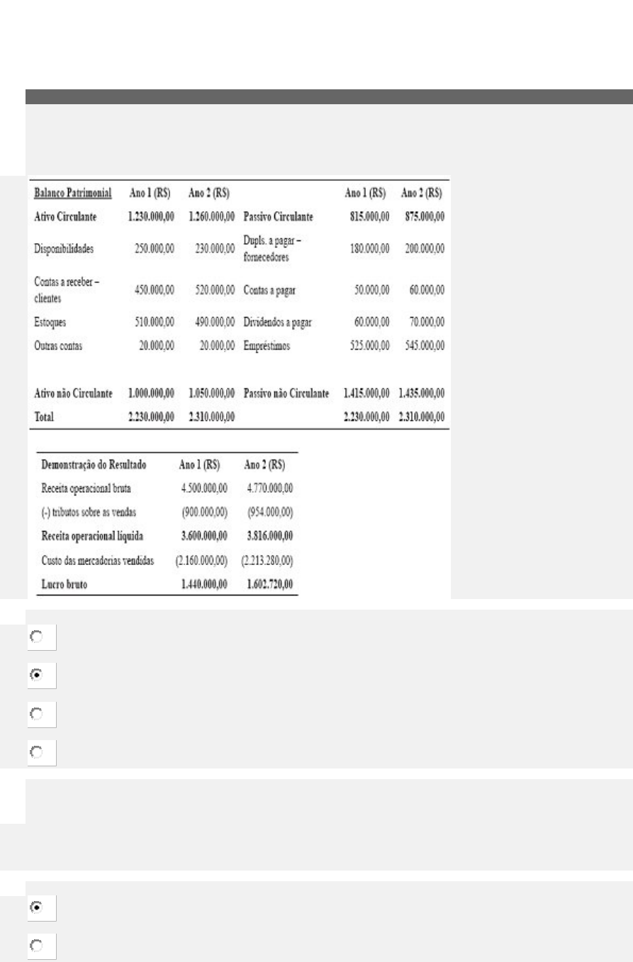 Prova concluída com sucesso!!! Resultado final : 9.0 CONTABILIDADE GERENCIAL Parte superior do formulário 1. Considerando os dados do balanço patrimonial e os dados da demonstração do resultado, o prazo médio de estocagem do Ano 1 e Ano 2 é, respectivamente, 85 e 39 dias. 85 e 80 dias. 85 e 33 dias. 80 e 39 dias. Parte inferior do formulário Parte superior do formulário 2. Leia abaixo: Um indicador do balanced scorecard que tem como referência a excelência dos processos e atividades desenvolvidos pela empresa e o padrão de qualidade desejada para seus produtos e serviços é um indicador da perspectiva dos processos internos. financeira. dos funcionários. dos clientes. Parte inferior do formulário Parte superior do formulário 3. Um objetivo do modelo de gestão balanced scorecard é elaborar indicadores na estratégia que sejam monitorados na operação. montar um sistema que não vincule o desempenho dos gestores. deixar claro que a estratégia fica com a cúpula. elaborar indicadores na estratégia desvinculados da operação. Parte inferior do formulário Parte superior do formulário 4. Leia abaixo: Uma divisão essencialmente transferidora tem um total de custos e despesas de R$20.000,00 e transfere todas as 10 000 unidades que produz para a outra divisão da empresa por R$2,10 a unidade, que as vende em seguida para terceiros por R$3,00. Sabendo que a divisão vendedora tem custos e despesas específicos totais de R$6.000,00, assinale a alternativa correta. O lucro da divisão transferidora é R$1.000,00 e o resultado total da empresa R$4.000,00. O lucro da divisão transferidora é R$3.000,00 e o resultado total da empresa R$4.000,00. O lucro total da empresa é R$4.000,00 e o resultado da divisão recebedora é R$1.000,00. O lucro da divisão recebedora é R$4.000,00 e o resultado total da empresa é R$3.000,00. Parte inferior do formulário Parte superior do formulário 5. Uma empresa tem uma política de estocar produtos acabados pelo prazo equivalente a 45 dias de vendas. O orçamento de vendas de seus produtos é de 50 000 unidades, para o próximo exercício, e o estoque inicial para o período orçamentário é de 4 000. O custo atual de materiais por unidade de produto é de R$20,00, com previsão de aumento para o período orçado em 4%. A produção a ser realizada no período orçado e o orçamento de consumo de materiais são, respectivamente, 52 250 unidades e R$1.080.000,00. 54 000 unidades e R$1.086.800,00. 52 250 unidades e R$1.086.800,00. 54 000 unidades e R$1.080.000,00. Parte inferior do formulário Parte superior do formulário 6. Leia abaixo: Considere que a receita operacional líquida para o próximo exercício orçamentário é de R$400.000,00, os tributos sobre a venda são de 20% sobre a receita bruta, o prazo médio de recebimento é de 25 dias e o saldo inicial de duplicatas a receber é de R$32.000,00. O valor do saldo final de duplicatas a receber orçado e o valor do recebimento de duplicatas no fluxo de caixa orçado são, respectivamente, R$33.333,00 e R$478.667,00. R$34.722,00 e R$502.722,00. R$34.722,00 e R$497.278,00. R$32.000,00 e R$497.278,00. Parte inferior do formulário Parte superior do formulário 7. Leia abaixo: Uma empresa com vendas anuais de R$2.400.000,00, e um custo médio de vendas de 60%, tem prazos médios de recebimento e estocagem de 30 e 60 dias, respectivamente. Considerando esses dados, os valores das contas de duplicatas a receber de clientes e dos estoques são, respectivamente, R$240.000,00 e R$200.000,00. R$200.000,00 e R$240.000,00. R$230.000,00 e R$240.000,00. R$200.000,00 e R$230.000,00. Parte inferior do formulário Parte superior do formulário 8. Uma empresa tem vendas de R$500.000,00, custos variáveis de 60% das vendas e custos fixos de R$140.000,00. O lucro operacional da empresa e o grau de alavancagem operacional são, respectivamente, R$60.000,00 e 3,33. R$190.000,00 e 3,33. R$190.000,00 e 1,73. R$60.000,00 e 1,73. Parte inferior do formulário Parte superior do formulário 9. Considere os dados das demonstrações contábeis a seguir. O valor do patrimônio líquido inicial e o valor do capital próprio final são, respectivamente R$38.000,00 e R$44.400,00. R$43.800,00 e R$38.000,00. R$38.000,00 e R$43.800,00. R$40.500,00 e R$43.800,00. Parte inferior do formulário Parte superior do formulário 10. Podemos definir KPI - Key Performance Indicators - como um modelo de gestão de recursos. retorno do investimento. indicadores que medem o nível de desempenho de um determinado processo ou atividade. um modelo de gestão de custos. Parte inferior do formulário