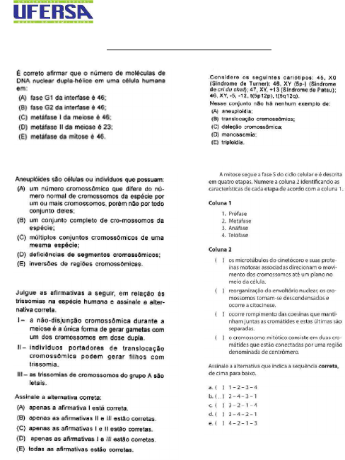 UNIVERSIDADE FEDERAL RURAL DO SEMI-ÁRIDO DEPARTAMENTO DE CIÊNCIAS ANIMAIS LISTA DE EXERCÍCIOS – 1ª AVALIAÇÃO 1 2 3 4 5 1 homólogos 6 7 8 9 10 Considere as seguintes afirmações sobre alguns conceitos fundamentais utilizados em genética. I - Alelo recessivo é aquele inibido pela ação de outro alelo, denominado dominante. II - Cromossomos homólogos são os que apresentam genes que codificam as mesmas características e que pareiam durante a meiose. I II - Genótipo é a descrição da constituição genética de um organismo; é um conceito relativo a um determinado gene ou a um conjunto de genes. Quais estão corretas? (A) Apenas I I . (B) Apenas I e I I . (C) Apenas I e I II . (D) Apenas II e I II . (E) I, II e III. GABARITO 1. A 2. A 3. B 4. E 5. B 6. E 7. D 8. C 9. C 10. B 11. A 12. C 11 12