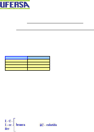 UNIVERSIDADE FEDERAL RURAL DO SEMI-ÁRIDO DEPARTAMENTO DE CIÊNCIAS ANIMAIS LISTA DE EXERCÍCIOS – 1ª UNIDADE INTERAÇÃO GÊNICA E HERANÇA QUANTITATIVA Informações para as questões 1 e 2 Em galinhas, o tipo de crista é um caso de interação gênica em que temos: GENÓTIPOS FENÓTIPOS R-ee Rosa rrE- Ervilha R-E- Noz rree Simples 01. Em 80 descendentes, qual será o esperado para o seguinte cruzamento: Rree X rrEe? 02. Um galo de crista noz, cruzado com uma galinha crista rosa, produziu a seguinte geração: 3/8 noz, 3/8 rosa, 1/ 8 ervilha e 1/8 simples. Quais os genótipos dos pais? 03. Na galinhas, um gene C produz plumagem colorida, enquanto o alelo c condiciona plumagem branca. O gene C é inibido na presença do gene I, produzindo-se então plumagem branca. Uma galinha branca, cruzada com macho colorido número 1, produz 100% de descendentes coloridos. A mesma galinha, cruzada com um macho número 2, também colorido, produz 50% de descendentes coloridos e 50% de descendentes brancos. Quais são os genótipos da galinha e dos dois galos? Informação para as questões 4 e 5 Em ratos, a coloração da pelagem é determinada por dois genes, C e A, e seus respectivos recessivos, c e a. O gene c em dose dupla tem efeito epistático, inibindo a ação dos genes produtores de pigmento e determinando a formação de albinos. Neste tipo de herança encontramos os seguintes genótipos e fenótipos, colocando-se entre parênteses o gene que pode ser indiferentemente recessivo ou dominante. Genótipos Fenótipos C(c) A(a) ................................... cinzento C(c) aa ...................................... preto Cc A(a) .................................... albino cc aa ......................................... albino 04. Um rato preto, quando cruzado com uma fêmea cinzenta, produziu uma geração na qual foram evidenciadas as seguintes proporções fenotípicas: 3/8 cinzento, 3/8 preto e 2/8 albino. Os genótipos parentais são: a) Ccaa X CcAa b) CcAA X ccAa c) Ccaa X CCAa d) CcAa X CcAa e) ccAA X ccAa 05. Um rato albino, cruzado com uma fêmea preta produziu a seguinte geração: ¼ aguti, ¼ preto e ½ albino. Os genótipos parentais são: a) ccAa X Ccaa b) ccAA X Ccaa c) ccAa X CCaa d) CcAa X CcAA e) ccAa X ccAA 06. Uma mulata, filha de pai branco e mãe negra, casa-se com um homem branco. Quanto à cor da pele, como poderão ser seus filhos? 07. Um mulato escuro casou-se com uma mulher branca. Quais as probabilidades de esse casal ter um filho mulato claro do sexo masculino? 08. Sabendo-se que do casamento entre um mulato médio e uma mulher mulata clara nasceram crianças brancas e mulatas, assinale a alternativa que apresenta a seqüência de genótipos do pai e da mãe respectivamente: a) AAbb Aabb b) aaBB aaBb c) AAbb aaBb d) AaBb Aabb e) aaBB Aabb 09. (CESGRANRIO) Supondo que a cor da pele humana seja condicionada por apenas dois pares de genes autossômicos (A e B) contribuintes, qual a probabilidade de um casal de mulatos, ambos com genótipo AaBb, ter um filho branco? a) 1/16 b) 4/16 c) 5/16 d) 6/16 e) 8/16 10. Um casal tem 12 filhos, todos mulatos médios. Provavelmente este casal será constituído por: a) dois mulatos médios b) um mulato médio e um negro c) um branco e um mulato médio d) um negro e um branco e) um mulato claro e um escuro RESOLUÇÃO: 01. 20 noz; 20 rosa; 20 ervilha; 20 simples 02. RrEe X Rree 03. Galinha iicc; macho 2 iiCc 04. A 05. A 06. Mulatos médios, mulatos claros e brancos. 07. 1/4 ou 25%. 08. D 09. A 10. D