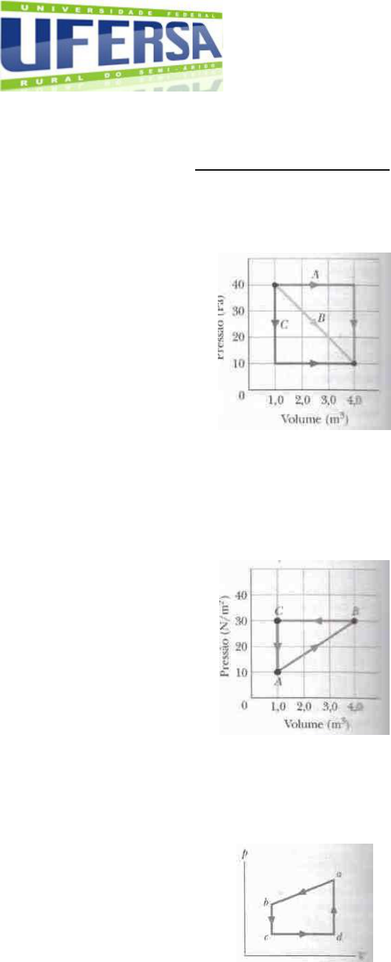 Lista para a 3ª Avaliação 1. Uma amostra de gás se expande de 1,0 m3 a 4,0 m3 enquanto sua pressão decresce de 40 Pa. Que trabalho é realizado pelo gás se sua pressão varia com o volume através (a) da trajetória A, (b) da trajetória B e (c) da trajetória C na figura abaixo. 2. Suponha que um trabalho de 200 J é realizado sobre um sistema e que uma quantidade de 70,0 cal é retirada do sistema como calor. De acordo com a primeira lei da termodinâmica, quais são os valores (incluindo os sinais) de (a) W, (b) Q e (c) Eint? 3. Um gás em uma câmara fechada passa pelo ciclo mostrado no diagrama p-V da figura abaixo. Calcule a energia líquida adicionada ao sistema sob a forma de calor durante um ciclo completo. 4. A figura abaixo mostra um ciclo fechado para um gás (a figura não é feita em escala). A variação na energia interna do gás quando ele se move de a para c ao longo da trajetória abc é -200 J. Quando ele se move de c para d, 180 J precisam ser transferidos para ele como calor. É necessária uma transferência de calor adicional de 80 J quando ele se move de d para a. Que trabalho é realizado sobre o gás quando ele se move de c para d? Universidade Federal Rural do Semi-Árido – UFERSA Pro-Reitoria de Graduação – PROGRAD Curso: Bacharelado em Ciência e Tecnologia Disciplina: Ondas e Termodinâmica Professora: Subênia Medeiros 5. Quando um sistema é levado de um estado i para um estado f ao longo da trajetória iaf na figura abaixo, Q = 50 cal e W = 20 cal. Ao longo da trajetória ibf, Q = 36 cal. (a) Quanto vale W ao longo da trajetória ibf? (b) Se W = -13 cal para a trajetória de volta fi, quanto vale Q para esta trajetória? (c) Se Eint,i = 10 cal, quanto vale a Eint,f? Se Eint,b = 22 cal, quanto vale Q para (d) a trajetória ib e (e) a trajetória bf? 6. Cinco moles de um gás ideal monoatômico com uma temperatura inicial de 127 ºC se expandem e, nesse processo, absorvem 1200 J de calor e realizam 2100 J de trabalho. Qual é a temperatura final do gás? 7. Você chuta uma bola de futebol, comprimindo-a, de repente, até 2/3 de seu volume original. Nesse processo, você realiza 410 J de trabalho sobre o ar (considerando um gás ideal) dentro da bola. (a) Qual é a variação da energia interna do ar dentro da bola devido à compressão? (b) A temperatura do ar dentro da bola aumenta ou diminui devido à compressão? Explique. 8. Um gás Ideal evolui do estado a para o estado b no diagrama PV mostrado na figura abaixo. Durante esse processo, 400 J calor são fornecidos, e a pressão dobra. (a) Quanto trabalho é realizado pelo gás, ou sobre ele? Explique. (b) Compare a temperatura do gás em a com a sua temperatura em b. Seja específico. (c) Compare a energia interna do gás em a com a energia interna em b. Novamente, seja específico, e explique. 9. Um gás ideal se expande enquanto a pressão é mantida constante. Durante esse processo, há transferência de calor para dentro do gás ou para fora do gás? Justifique sua resposta. 10. O calor Q flui para dentro de um gás monoatômico ideal, e o volume aumenta enquanto a pressão é mantida constante. Que fração da energia calorífica é usada para realizar o trabalho de expansão do gás? 11. Em um experimento, 200 g de alumínio (com calor específico de 900 J/kg. K) a 100 ºC são misturados com 50,0 g de água a 20,0 ºC, com a mistura isolada termicamente. (a) Qual é a temperatura de equilíbrio? Quais são as variações de entropia (b) do alumínio, (c) da água e (d) do sistema alumínio-água? 12. Um gás sofre uma expansão isotérmica reversível. A figura abaixo fornece a variação S na entropia do gás versus o volume final Vf do gás. Quantos moles estão presentes na amostra? 13. Para n moles de um gás diatômico ideal levado através do ciclo na figura abaixo, com suas moléculas girando, mas sem que oscilem, quais são (a) p2/p1, (b) p3/p1 e (c) T3/T1? Para a trajetória 1 2, quais são (d) W/nRT1, (e) Q/nRT1, (f) Eint/nRT1 e (g) S/nR? Para a trajetória 2 3, quais são (h) W/nRT1, (i) Q/nRT1, (j) Eint/nRT1 e (k) S/nR? Para a trajetória 3 1, quais são (l) W/nRT1, (m) Q/nRT1, (n) Eint/nRT1 e (o) S/nR? 14. Um cubo de gelo com 8,0 g a -10 ºC é colocado em uma garrafa térmica contendo 100 cm3 de água a 20 ºC. De quanto terá variado a entropia do sistema cubo-água quando o equilíbrio for alcançado? O calor específico do gelo é 2220 J/kg.K. 15. Uma máquina de Carnot de 500 W opera entre reservatórios de temperaturas constantes a 100 ºC e 60,0 ºC. Qual é a taxa na qual a energia é (a) absorvida na forma de calor pela máquina e (b) expelida sob a forma de calor pela máquina? 16. A eficiência de um motor de um carro particular é 25% quando o motor realiza 8,2 kJ de trabalho por ciclo. Suponha que o processo é reversível. Quais são (a) a energia interna que o motor ganha por ciclo na forma de calor Qganho da combustão do combustível e (b) a energia que o motor perde por ciclo sob a forma de calor Qperdido. Se um ajuste aumenta a eficiência para 31%, quais são (c) Qganho e (d) Qperdido para o mesmo valor de trabalho? 17. Um gás ideal (1,0 mol) é a substância de trabalho em uma máquina que opera através do ciclo mostrado na figura abaixo. Os processos BC e DA são reversíveis e adiabáticos. (a) O gás é monoatômico, diatômico ou poliatômico? (b) Qual é a eficiência da máquina? 18. Quando trabalho deve ser realizado sobre um refrigerador de Carnot para transferir 1,0 J sob a forma de calor (a) de um reservatório a 7,0 ºC para um a 27 ºC, (b) de um reservatório a -73 ºC para um a 27 ºC, (c) de um reservatório -173 ºC para um a 27 ºC e (d) de um reservatório a -223 ºC para um a 27 ºC? 19. Um condicionador de ar operando entre 93 ºF e 70 ºF é especificado como tendo uma capacidade de refrigeração de 4000 BTU/h. Seu coeficiente de desempenho é 27% daquele de um refrigerador de Carnot operando entre as mesmas duas temperaturas.