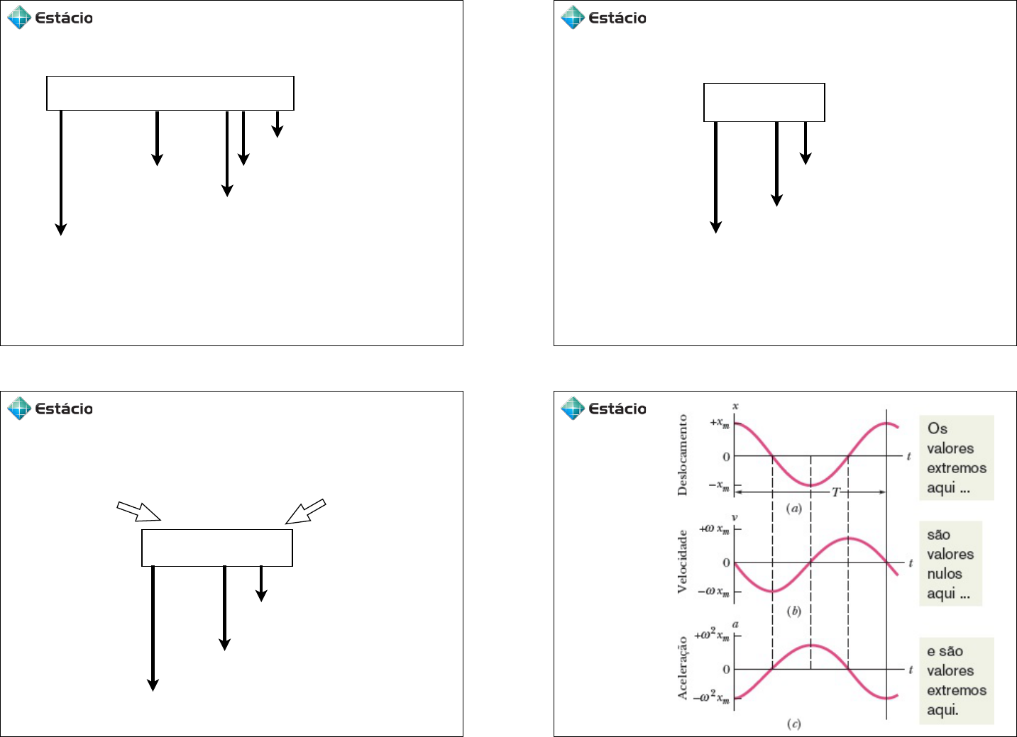 a(t) = −ω 2.xm .cos(ω .t +φ) ângulo de fase (rad) frequência angular (rad/s) tempo (s)amplitude (m) aceleração do corpo no instante t (m/s2) 120 am =ω 2.xm frequência angular (rad/s) amplitude da aceleração = aceleração máxima que o corpo alcança no MHS (m/s2) amplitude (m) 121 x(t) = xm .cos(ω .t +φ) a(t) = −ω 2.xm .cos(ω .t +φ) a(t) = −ω 2.x(t) frequência angular (rad/s) posição do corpo no instante t (m) aceleração do corpo no instante t (m/s2) 122 A Velocidade do MHS Discutimos brevemente a velocidade ao examinarmos a Fig. 15-2b e mostramos que ela varia em módulo e sentido quando a partícula descreve um movimento harmônico simples. Em particular, vimos que a velocidade é momentaneamente zero nos pontos extremos e máxima no ponto central do movimento. Para determinar a função v(t) que representa a velocidade para qualquer instante de tempo, vamos calcular a derivada da função x(t) que representa a posição em função de tempo (Eq. 15-3): A velocidade varia com o tempo, já que a função seno varia com o tempo, entre os valores +1 e –1. O fator que multiplica a função seno determina os valores extremos da variação de velocidade, –ωxm e +ωxm. Dizemos que ωxm é a amplitude vm da variação de velocidade. Quando a partícula passa pelo ponto x = 0 e está se movendo da esquerda para a direita, a velocidade é positiva e o módulo da velocidade tem o maior valor possível. Quando a partícula passa pelo ponto x = 0 e está se movendo da direita para a esquerda, a velocidade é negativa e o módulo da velocidade tem, novamente, o maior valor possível. O gráfico da Fig. 15-6b mostra a variação da velocidade com o tempo dada pela Eq. 15-b com uma constante de fase ϕ = 0, que corresponde à variação da posição da partícula com o tempo mostrada na Fig. 15-6a. Lembre-se de que usamos uma função cosseno para representar x(t), independentemente da posição da partícula no instante t = 0, escolhendo o valor apropriado de ϕ para que a Eq. 15-3 nos dê a posição correta da partícula no instante t = 0. Essa escolha da função cosseno para representar x(t) faz com que a velocidade seja representada por uma função seno com o mesmo valor de ϕ. Fonte: Halliday 123 Exemplo - página 93 do Halliday 124 Exemplo - página 94 do Halliday 125 Energia mecânica no MHS é constante e independente do tempo E = Ep + Ec energia potencial (J) energia cinética (J) energia mecânica (J) 126 Ep = 1 2 K .x 2 (t) energia potencial (J) posição do corpo no instante t (m) constante elástica da mola (N/m) Ep = 1 2 K .x 2 m .cos2(ω .t +φ) 127 Ec = 1 2m.v 2 (t) energia cinética (J) velocidade do corpo no instante t (m) massa do corpo(N/m) Ec = 1 2m. −ω .xm .sen(ω .t +φ)[ ] 2 ⇒ Ec = 1 2 K .x 2 m .sen2 (ω .t +φ) 128 E = Ep + Ec E = 12 K .x 2 m .cos2(ω .t +φ)+ 1 2 K .x 2 m .sen2 (ω .t +φ) E = 12 K .x 2 m 129 capítulo 2�q 57 Logo, E KAM = 1 2 2 A Energia cinética nessas posições é zero é onde o bloco pára (velocidade zero) para inverter seu movimento. Observe o gráfico figura 2.7, abaixo, ele apresenta a Energia Mecânica em função da posição do bloco. –A 0 A Ep Em Ec x Energia Figura 2.6 – Gráfico da Energia do oscilador massa-mola em função da posição. A curva tracejada é a variação da Energia Cinética, a rosa representa a variação da energia potencial elástica e a preta, a energia mecânica. EXERCÍCIO RESOLVIDO O gráfico energia cinética x posição, abaixo, é de um oscilador massa-mola de massa m =0,20 kg. EC (J) –0,12cm 0,12cm Fonte: Material didático 130 capítulo 2�q 57 Logo, E KAM = 1 2 2 A Energia cinética nessas posições é zero é onde o bloco pára (velocidade zero) para inverter seu movimento. Observe o gráfico figura 2.7, abaixo, ele apresenta a Energia Mecânica em função da posição do bloco. –A 0 A Ep Em Ec x Energia Figura 2.6 – Gráfico da Energia do oscilador massa-mola em função da posição. A curva tracejada é a variação da Energia Cinética, a rosa representa a variação da energia potencial elástica e a preta, a energia mecânica. EXERCÍCIO RESOLVIDO O gráfico energia cinética x posição, abaixo, é de um oscilador massa-mola de massa m =0,20 kg. EC (J) –0,12cm 0,12cm Exemplo - página 57 do Material Didático 58 q capítulo 2 Determine: a) a amplitude e a constante elástica; b) o módulo e sinais das velocidades máximas do bloco; Resolução: a) Deslocando 0,12 cm de sua posição de equilíbrio, o bloco vai se movimentar com essa amplitude, portanto A = 0,12cm = 1,2 x10-3 m. Pelo gráfico quando o oscilador passa pela origem temos Ec máxima que é a EM do sis- tema, então: E KA K K M = = × = × = × − − 1 2 2 1 2 4 12 10 2 3 2 3 6 (1,2 10 2,7 10 N/M ) ( , ) b) A velocidade máxima corresponde a energia cinética máxima, que é igual à energia mecânica, sendo a massa 0,20kg, temos: E = mv 2 v = 2E m = 2× 2 0,20 = ±4,47 m / s cmáx máx 2 máx cmáx ATIVIDADES 01. A corda de um piano emite um dó médio vibrando com uma frequência primária igual a 220 Hz. a) Calcule o período e a frequência angular. b) frequência angular de um soprano emitindo um ‘’dó alto’’, duas oitavas acima, que é igual a quatro vezes a frequência da corda do piano. 02. A extremidade de um diapasão executa 440 vibrações completas em 0,500 s. Calcule a frequência angular e o período do movimento. Ec = 2 J 131 132 ·1 Um objeto que executa um movimento harmônico simples leva 0,25 s para se deslocar de um ponto de velocidade nula para o ponto seguinte do mesmo tipo. A distância entre os pontos é 36 cm. Calcule (a) o período, (b) a frequência e (c) a amplitude do movimento. ·2 Um corpo de 0,12 kg executa um movimento harmônico simples de amplitude 8,5 cm e período 0,20 s. (a) Qual é o módulo da força máxima que age sobre o corpo? (b) Se as oscilações são produzidas por uma mola, qual é a constante elástica da mola? ·3 Qual é a a