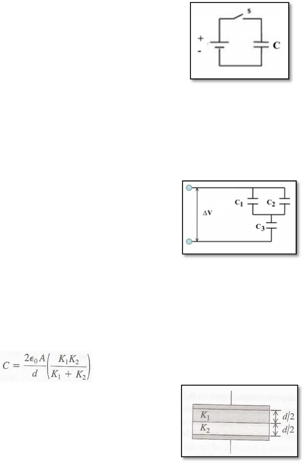 Universidade Federal de Sergipe Física III Lista II Prof: Marco Mello 1) Uma nuvem típica de chuva se encontra a uma altura de 4.000 m do solo, com uma DDP de 8 milhões de volts em relação ao solo. Qual é o valor do campo elétrico entre a nuvem e o solo? 2) O capacitor da figura abaixo possui uma capacitância de 25μF e está inicialmente descarregado. A bateria produz uma diferencial de potencial de 120V. Quando a chave S é Fechada, qual é a carga total que passa por ela? 3) Um capacitor de placas paralelas possui placas circulares de raio 8,22cm separadas por uma distancia de 1,31 mm. a) Calcule a capacitância? b) Qual é a cargas das placas se uma diferença de potencial de 116V é aplicada ao capacitor? 4) Na figura abaixo, determine a capacitância da combinação de capacitores. Adote C1=10,3μF, C2=4,8μF e C3=3,9μF 5) Um cabo coaxial usado numa linha de transmissão tem um raio interno de 0,10mm e um raio externo de 0,60 mm. Calcular a capacitância por metro de cabo, supondo que o espaço entre os condutores seja preenchido com poliestireno. Dado: para o poliestireno k=2,6 6) Um capacitor com placas paralelas possui o espaço entre as placas preenchido com duas camadas de dielétricas, uma com uma constante dielétrica K1 e a outra com a constante K2 (veja a figura). Cada camada possui espessura d/2, em que d é a distância entre as placas. Mostre que a capacitância é dada por: 7) Um capacitor de placas paralelas de 10 cm de lado e separação d=4mm, e preenchido com um material de k=2, de mesma área a) Qual é a capacitância sem o dielétrico? b) Qual é a capacitância com o dielétrico? c) Qual é a capacitância se o dielétrico tem apenas 3mm de espessuras? 8) Dois capacitores, com 2,12μF e 3,88μF, estão ligados em serie sob uma DDP de 328V. Calcular a energia total armazenada nos capacitores. 9) Um capacitor com placas paralelas possui capacitância igual a 920 pF. A carga em cada placa é de 2,55μC. (a) Qual é a diferença de potencial entre as placas? (b) Caso a carga fosse mantida constante, qual seria a diferença de potencial entre as placas se a distância entre elas dobrasse? (c) Qual é o trabalho necessário para duplicar essa distância? 10) Um capacitor com placas paralelas no vácuo, área A e distância x entre as placas, possui cargas +Q e – Q em suas placas. O capacitor é desconectado da fonte de carga, de modo que a carga de cada placa permanece fixa. (a) Qual é a energia total armazenada no capacitor? (b) As placas são afastadas até atingirem uma distância adicional dx. Qual é a variação da energia acumulada? (c) Se F for módulo da força de atração entre as placas, então a variação de energia acumulada deve ser igual ao trabalho dW=Fdx realizado para afastar as placas (d) Explique por que F não é igual a QE, em que E é o módulo do campo elétrico entre as placas. 11) Quando falamos em energia elétrica logo ficamos com um pouco de receio, pois logo nos vem à cabeça o choque elétrico. Mas se pararmos para pensar como a energia elétrica chega até nossas casas. Ela chega através das linhas de transmissão de energia elétrica. Transmissão de energia elétrica é o processo de transportar energia entre dois pontos. O transporte é realizado por linhas de transmissão de alta tensão e geralmente usando corrente alternada. Explique por que a transmissão é realizada em alta tensão e normalmente com a corrente alternada. 12) Uma corrente de 5,0 A passa por um fio de cobre com calibre 12 (diâmetro 2,05mm) e por uma lâmpada. O cobre possui 8,5x 1028 elétrons livres por metro cúbico. (a) Quantos elétrons passam pela lâmpada por segundo (b) Qual é a densidade de corrente no fio? (c) Qual é a velocidade escalar com que um elétron típico passa por qualquer dado ponto do fio (d) Suponha que o fio tivesse o dobro de diâmetro, qual das respostas anteriores mudaria? Elas diminuiriam ou aumentariam? 13) A corrente elétrica que passa em um fio varia com o tempo de acordo com a seguinte equação: I= 55A– (0,65 A/s2) t2. (a) Quantos coulombs passam através da seção reta do fio no intervalo de tempo entre t=0 e t=8s? (b) Qual é o valor da corrente constante que poderia transportar a mesma quantidade de carga no mesmo intervalo? 14) Um bastão cilíndrico, de 1,50m e diâmetro de 0,500cm está conectado a uma fonte de energia que mantém uma diferença de potencial constante de 15,0V através das suas extremidades enquanto um amperímetro mede a corrente que passa por ele. Você observa que, na temperatura ambiente (20,0ºC), a leitura do amperímetro é de 18,5 A, enquanto a 92,0ºC, a leitura é de 17,2 A. Despreze qualquer expansão térmica do bastão. Calcule (a) a resistividade (b) o coeficiente de temperatura da resistividade a 20ºC para o material do bastão. 15) Um fio de cobre possui uma seção reta quadrada de lado igual a 2,3mm. O fio possui comprimento de 4,0m e transporta uma corrente elétrica de 3,6 A. A densidade dos elétrons livres é igual a 8,5 x 1028/m3. Calcule o módulo (a) da densidade de corrente no fio; (b) do campo elétrico no fio. (c) Qual é o tempo necessário para um elétron percorrer o comprimento do fio? Dado:ρ=1,72x10-8Ωm 16) Uma mola firmemente comprimida é composta por 75espirais, cada qual medindo 3,50cm de diâmetro, e é feita de um fio metálico isolante com 3,25mm de diâmetro. Um ohmímetro conectado através das suas extremidades opostas registra 1,74Ω. Qual é a resistividade do metal? 17) Um cabo de transmissão de cobre, que possui 100km de comprimento e 10,0cm de diâmetro, carrega uma corrente de 125A. (a) Qual é a queda potencial através do cabo? (b) Quanta energia elétrica é dissipada como energia elétrica por hora? 18) Considere o circuito elétrico indicado na Figura. A tensão entre os terminais da bateria de 24,0V é igual a 21,2V durante a passagem da corrente. Calcule (a) a resistência interna r da bateria; (b) a resistência R do resisto