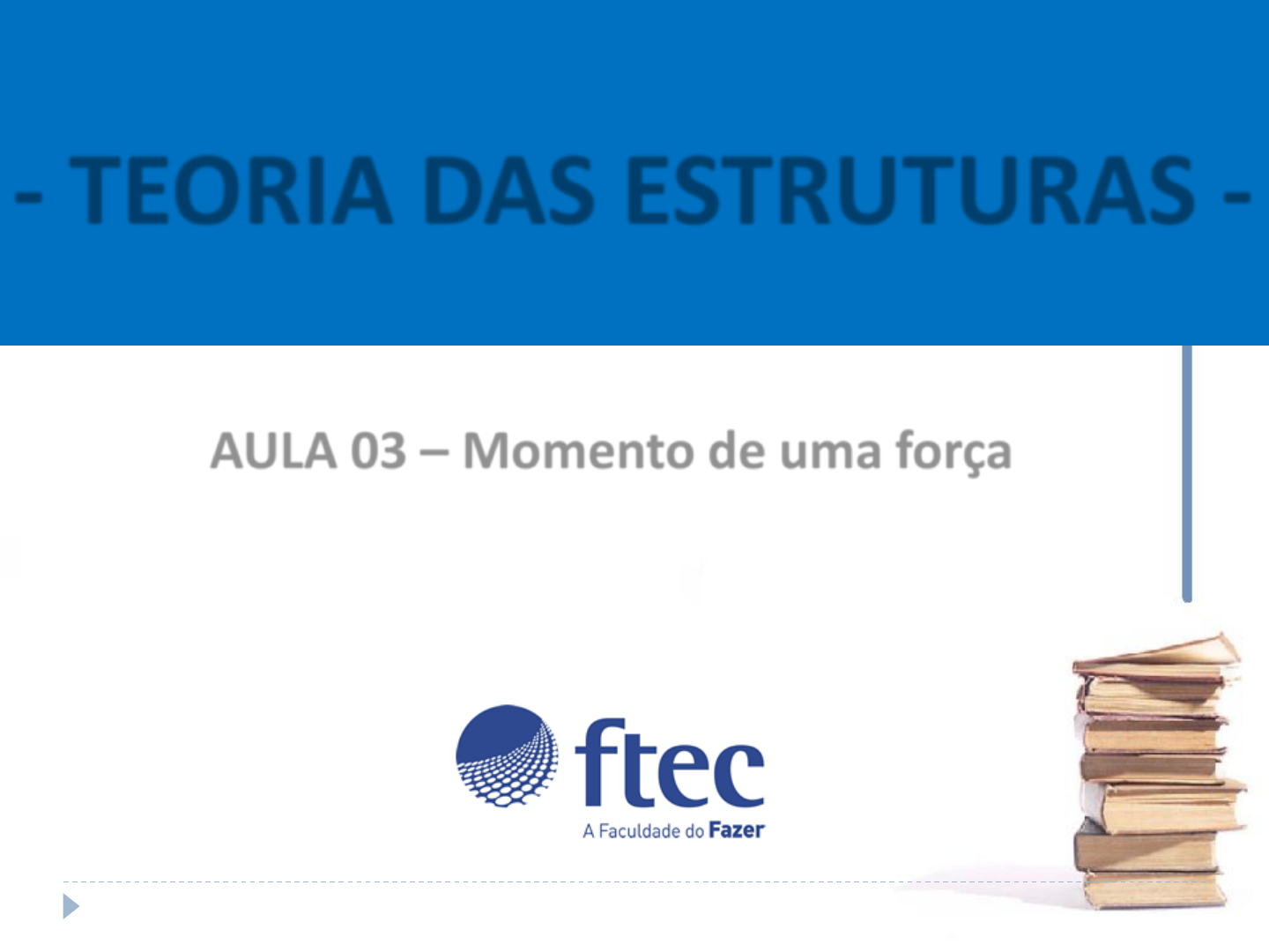 Prof. MSc. Bárbara Jordani - TEORIA DAS ESTRUTURAS - AULA 03 – Momento de uma força MOMENTO DE UMA FORÇA É uma grandeza vetorial que exprime a tendência de giro de corpo em relação a um ponto ou um eixo, decorrente da aplicação de uma força. MOMENTO DE UMA FORÇA θ M = r.F.sen θ (módulo) MOMENTO DE UMA FORÇA Unidades de medidas F = N, kN, Kgf,... d = m, cm,... M = kN.m, N.m, kN.cm,... Rotação no sentido horário Momento negativo Rotação no sentido anti-horário Momento positivo CONVENÇÃO DE SINAIS: SEGUE A REGRA DA MÃO DIREITA M+ M- • Para existir momento, deve existir uma força (F) e um braço de alavanca (d). MOMENTO DE UMA FORÇA CONVENÇÃO DE SINAIS: SEGUE A REGRA DA MÃO DIREITA M+M- MOMENTO DE UMA FORÇA MOMENTO DE UMA FORÇA TEOREMA DE VARIGNON O momento gerado por um sistema de forças concorrentes pode ser calculado somando-se os momentos de cada força ou avaliando-se o momento da força resultante equivalente. TEOREMA DE VARIGNON EXEMPLO 01 Determine o momento da força em relação ao ponto O em cada uma das barras mostradas: EXEMPLO 02 Determine o momento da força aplicada em A de 40 N relativamente ao ponto B. Condição Geral: no espaço, o momento pode ser definido através do produto vetorial de r x F, considerando as suas componentes: MOMENTO DE UMA FORÇA -Já vimos que: r = (rx, ry, rz) e F = (Fx, Fy, Fz); -Vetor direção: x = i; y=j, z=k; -Então: (rx x Fx) = (ry x Fy) = (rz x Fz) = 0 - Observar que a direção e sentido do produto vetorial apontam na direção perpendicular ao plano segundo a regra da mão-direita, ou seja: a componente rx.Fy é uma componente que aponta na direção do eixo Z. MOMENTO DE UMA FORÇA Relembrando: Componentes Retangulares do Momento de uma força - TEORIA DAS ESTRUTURAS - REDUÇÃO DE SISTEMAS DE FORÇAS MOMENTO BINÁRIO Um binário é definido como duas forças paralelas que têm a mesma intensidade, mas direções opostas, e são separadas por uma distância perpendicular d. O momento resultante de dois binários é obtido pela soma destes. EXEMPLO 01 Um binário atua nos dentes da engrenagem mostrada na figura. Substitua este binário por um equivalente, composto por um para de forças que atuam nos pontos A e B. Determine: a) Para a viga abaixo, reduza o sistema de forças dado a um sistema força-binário equivalente em A; EXEMPLO 02 b) Um sistema força binário equivalente em B. ATIVIDADE 01 Determine os momentos da força de 800N em relação aos pontos A, B, C e D. ATIVIDADE 02 Uma força vertical de 450 N é aplicada na extremidade de uma alavanca que está ligada ao eixo em O. Determine: a) o momento da força em relação a O; ATIVIDADE 03 Uma força de 35 N é aplicada em uma alavanca de câmbio, determine o momento de P sobre B quando α=25°. ATIVIDADE 04 Uma Força de 300N é aplicada no Ponto A. Determinar o momento resultante sobre o Ponto D.