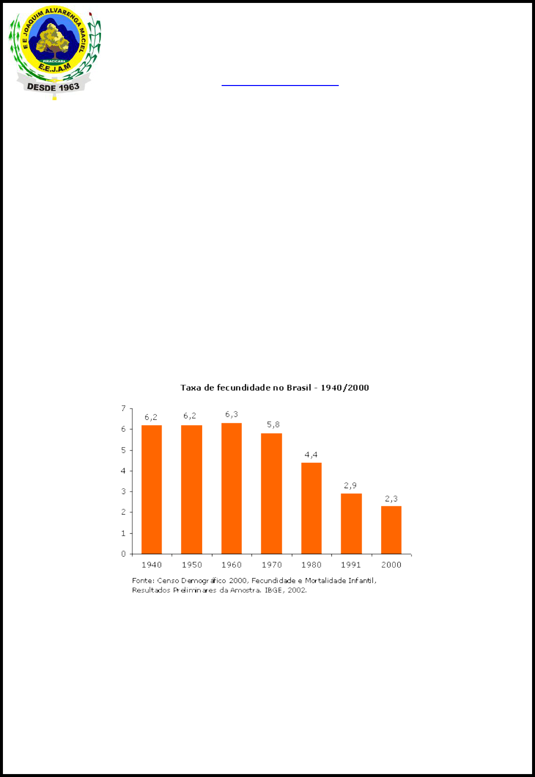 ESCOLA ESTADUAL JOAQUIM ALVARENGA MACIEL DECRETO DE CRIAÇÃO N° 6932 DE 16/04/1963 EXTENSÃO DE SÉRIE RESOLUÇÃO N° 7657/95 ENSINO MÉDIO PORTARIA 1574MG 20/12/2014 POVOADO DE PIRACICABA – BAEPENDI-MG TEL : 35 3343-5500 RAMAL 110/260 EMAIL: escola.170984@educacao.mg.gov.br Nome:_________________________________________________________ EJA 2º período Professora:CláudiaOlson Avaliação Bimestral de Geografia 1)Explique a diferença entre: a)país populoso e país povoado ________________________________________________________________________________________________________________________________________________________________________________________________________________________________________________________________________________________________________________________________________________________________________________________________________________________________________________ 2)Observe o gráfico abaixo e descreva o que esta ocorrendo com a taxa de natalidade do Brasil. - _______________________________________________________________________ b)Por que isto esta ocorrendo? ________________________________________________________________________________________________________________________________________________________________________________________________________________________ 3) Se a taxa de mortalidade cai e a taxa de natalidade se mantém, a população vai aumentar ou diminuir? Por que? ________________________________________________________________________________________________________________________________________________________________________________________________________________________________________________________________________________________________________________________________________________________________________ 4) Como podemos definir a pirâmide etária do Brasil hoje? ________________________________________________________________________________________________________________________________________________________________________________________________________________________________________________________________________________________________________________________________________________________________________ 5) Taxa de mortalidade é: * (marque somente uma alternativa) a) é um coeficiente que calcula o número de obtidos entre crianças. b) é a quantidade de pessoas que morre por hora no mundo. c) é um coeficiente utilizado na medição do número de mortes em determinada população. d) é a estimativa de quantos anos uma pessoa ira viver. 6)Explique a charge a seguir; _______________________________________________________________________________________________________________________________________________________________________________________________________________________________________________________________________________________________________________________________________________________________________________________________________________________________________________ 7) Dados os dados construa um gráfico de acordo com que foi estudado em aula. Taxa de Natalidade Período Número de filhos 1960 7,0 1980 4,0 1991 1,0 2000 3,0 2010 2,0