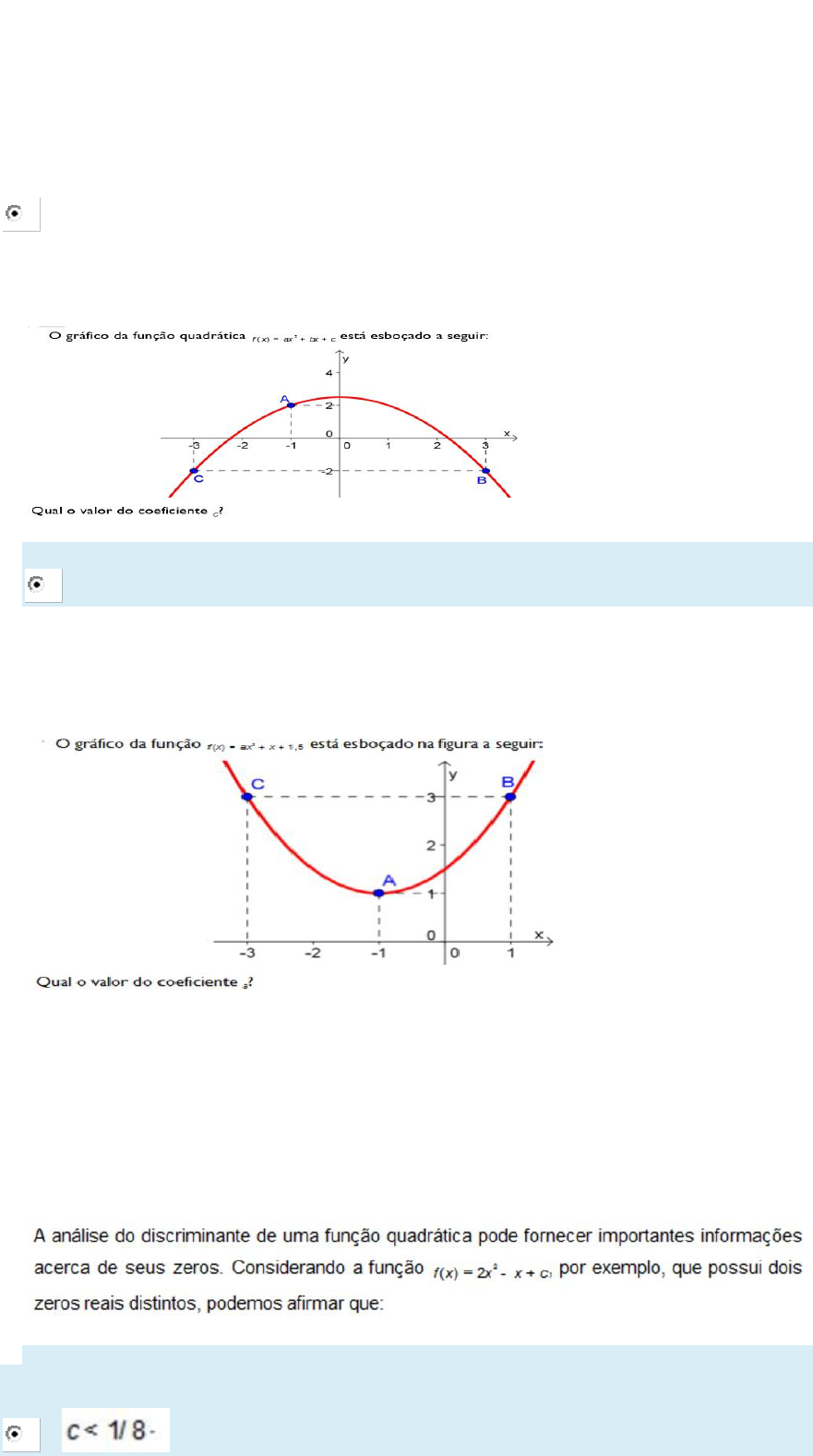 Métodos Quantitativos U1S3 - Atividade Diagnóstica Questão 1 A função quadrática f(x) = ax2 + bx + c tem como gráfico uma parábola. Sendo a = 1, b = -1 e c = 5 , a ordenada do ponto P=(0,y) pertencente ao gráfico dessa função é: Escolha uma: a. 5 Questão 2 Escolha uma: d. 2,5 Questão 3 U1S3 - Atividade de Aprendizagem Questão 1 Escolha uma: c. Questão 2 Escolha uma: a. Questão 3 Escolha uma: a. 5 cm.