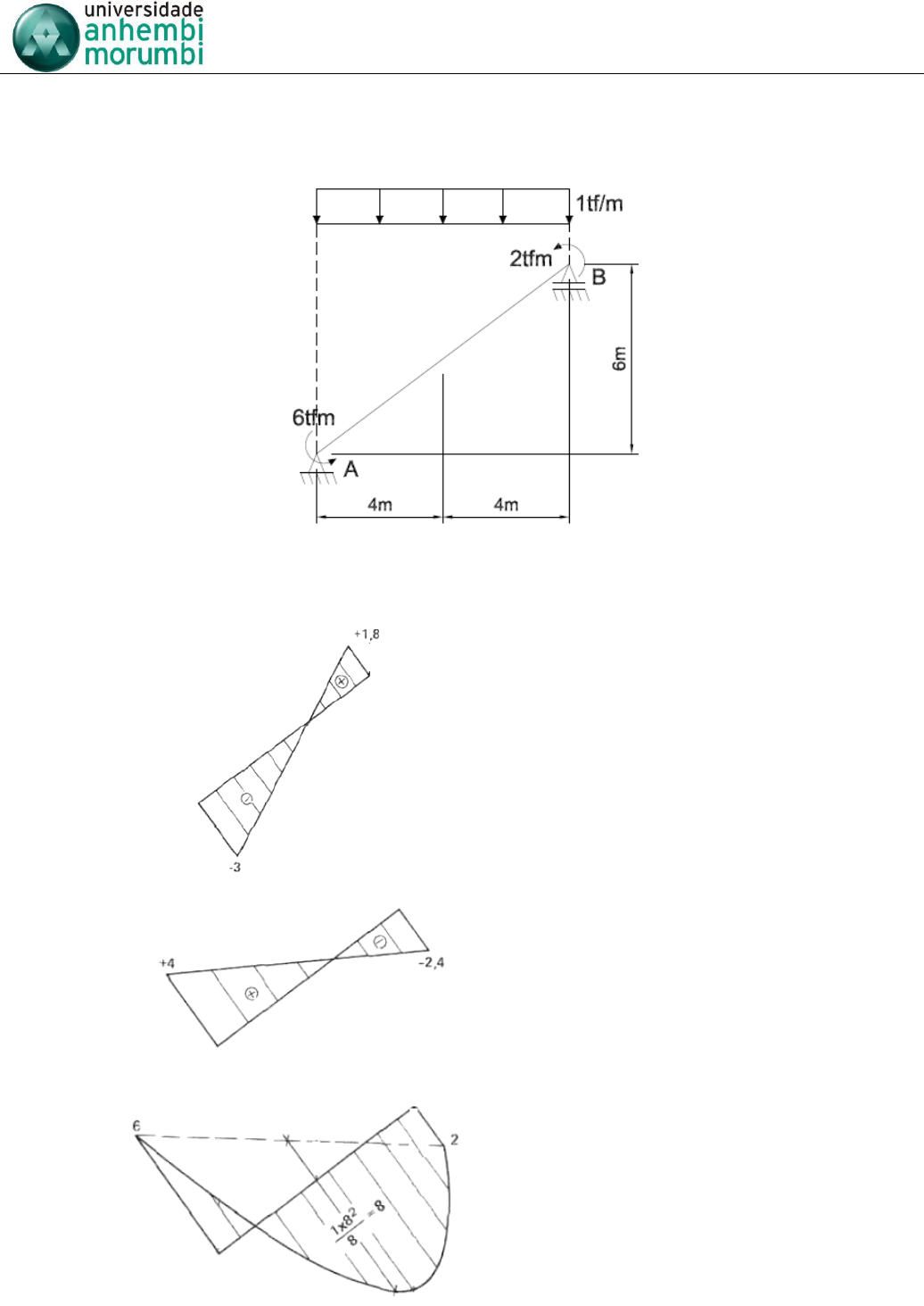 Disciplina: Análise Estrutural I Professor: Paulo Vitor Calmon N. da Gama Lista 3 – Viga Inclinada Para as vigas abaixo, desenhe os diagramas de esforços internos (M, V e N). EXERCÍCIO 1 Resposta: VA = 5 tf (para cima) VB = 3 tf (para cima) Diagrama de Força Normal (tf) Diagrama de Força Cortante (tf) Diagrama de Momento Fletor (tfm) Disciplina: Análise Estrutural I Professor: Paulo Vitor Calmon N. da Gama Lista 3 – Viga Inclinada EXERCÍCIO 2 Resposta: VA = 5 tf (para cima) VB = 2 tf (para cima) EXERCÍCIO 3 Resposta: VA = 4 tf (para cima) MA = 6 tfm (anti horário) Disciplina: Análise Estrutural I Professor: Paulo Vitor Calmon N. da Gama Lista 3 – Viga Inclinada EXERCÍCIO 4 Resposta: HA = 4 tf (para esquerda) VA = 0,8 tf (para baixo) VB = 0,8 tf (para cima) 2,26 Disciplina: Análise Estrutural I Professor: Paulo Vitor Calmon N. da Gama Lista 3 – Viga Inclinada EXERCÍCIO 5 Resposta: VA = 5 kN (para cima) MA = 1 kNm (anti horário) EXERCÍCIO 6 Resposta: VA = 1 kN (para cima) MA = 3,5 kNm (anti horário)