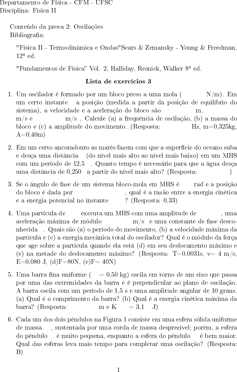 Departamento de Física - CFM - UFSC Disciplina: Física II Conteúdo da prova 2: Oscilações Bibliografia: • "Física II - Termodinâmica e Ondas"Sears & Zemansky - Young & Freedman, 12 a ed. • "Fundamentos de Física� Vol. 2, Halliday, Resnick, Walker 8a ed. Lista de exercícios 3 1. Um oscilador é formado por um bloco preso a uma mola (k = 400 N/m). Em um certo instante t a posição (medida a partir da posição de equilíbrio do sistema), a velocidade e a aceleração do bloco são x = 0, 100 m, v = −13, 6 m/s e a = −123 m/s2. Calcule (a) a frequência de oscilação, (b) a massa do bloco e (c) a amplitude do movimento. (Resposta: f = 5, 58 Hz, m=0,325kg, A=0,40m) 2. Em um certo ancoradouro as marés fazem com que a superfície do oceano suba e desça uma distância d (do nível mais alto ao nível mais baixo) em um MHS com um período de 12,5 h. Quanto tempo é necessário para que a água desça uma distância de 0,250d a partir do nível mais alto? (Resposta: t = 2, 08 h) 3. Se o ângulo de fase de um sistema bloco-mola em MHS é pi/6 rad e a posição do bloco é dada por x = Acos(ωt+ φ), qual é a razão entre a energia cinética e a energia potencial no instante t = 0? (Resposta: 0,33) 4. Uma partícula de 10 g executa um MHS com uma amplitude de 2, 0 mm, uma aceleração máxima de módulo 8, 0× 103 m/s2 e uma constante de fase desco- nhecida φ. Quais são (a) o período do movimento, (b) a velocidade máxima da partícula e (c) a energia mecânica total do oscilador? Qual é o módulo da força que age sobre a partícula quando ela está (d) em seu deslocamento máximo e (e) na metade do deslocamento máximo? (Resposta: T=0,0031s, v= 4 m/s, E=0,080 J, (d)F=80N, (e)F= 40N) 5. Uma barra fina uniforme (m = 0,50 kg) oscila em torno de um eixo que passa por uma das extremidades da barra e é perpendicular ao plano de oscilação. A barra oscila com um período de 1,5 s e uma amplitude angular de 10 graus. (a) Qual é o comprimento da barra? (b) Qual é a energia cinética máxima da barra? (Resposta: l = 0, 084 m e Kmax = 3,1 mJ) 6. Cada um dos dois pêndulos na Figura 1 consiste em uma esfera sólida uniforme de massa M , sustentada por uma corda de massa desprezível; porém, a esfera do pêndulo A é muito pequena, enquanto a esfera do pêndulo B é bem maior. Qual das esferas leva mais tempo para completar uma oscilação? (Resposta: B) 1 Figura 1: Figura do exercício 6. 7. O sistema de suspensão de um automóvel de 2000 kg "cede"10 cm quando o chassis é colocado no lugar. Além disso, a amplitude das oscilações diminui de 50 % a cada ciclo. Estime os valores (a) da constante elástica k e (b) da constante de amortecimento b do sistema mola-amortecedor de uma das rodas, supondo que cada roda sustente 500 kg. (Dica: visto que o problema pede uma estimativa, aproxime ω′ ≈ ω). (Resposta: k = 490 N/cm e b = 1092 kg/s.) 8. Um carro de 1000 kg com quatro ocupantes de 82 kg viaja em uma estrada de terra com "valetas"(buracos) separadas por uma distância média de 4,0 m. O carro trepida com amplitude máxima quando está a 16 km/h. Quando o carro pára e os ocupantes saltam, qual é a variação de altura do carro? (Resposta: 0,050 m) 9. Um oscilador harmônico amortecido é formado por um bloco (m = 2, 00 kg), uma mola (k = 10, 0 N/m) e uma força de amortecimento (F = −bv). Inicial- mente o bloco oscila com uma amplitude de 25,0 cm; devido ao amortecimento a amplitude cai a três quartos do valor inicial após quatro oscilações completas. (a) Qual é o valor de b? (b) Qual é a energia "perdida"durante as quatro oscila- ções? (Dica: utilize novamente a aproximação ω′ ≈ ω). (Resposta: b = 0, 102 kg/s, energia perdida = 0,137 J.) 2
