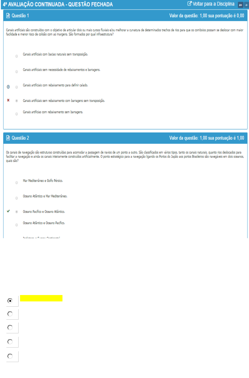 Existem navios para suportar diferentes tipos de cargas e demandas. Cada navio é diferenciado pela capacidade de carga e tipos de carga. Qual navio possibilita embarques diretos, sem a necessidade de estruturas para carga e descarga? Navio bulk carrier. Navio Roll-on Roll-off. Navio porta barcaça. Navio-tanque ou tanker ship. Navio multicargas ou multi purpose ship. Segundo a ANTAQ (2014), a navegação proporciona elevados índices de eficiência energética, deslocamento de grandes volumes em longas distâncias e proporciona mudar configurações regionais de um território. Como é classificado a navegação doméstica marítima? Navegação em rios e lagos. Navegação de longa distância. Navegação terrestre. Navegação de cabotagem. Navegação de hidrovia. Questão 1 Valor da questão: 1,00 sua pontuação é 1,00 O sistema de navegação, dinâmica fluvial, canais de navegação têm que ser redefinidos e, por conseguinte, balizados e sinalizados. A figura a seguir apresenta a sinalização de uma hidrovia de acordo com o Sistema de Balizamento Marítimo – Região “B” – da IALA. Assinale a opção que define corretamente a simbologia de sinalização utilizada em locais de travessia com edificações: Boia de luz indicativa de águas seguras. Boia de sinal cardinal leste. Boia sinalizando entrada a boroeste de luz e cor amarela. Boia de luz de sinal cardinal oeste Baliza sinalizando canal preferencial a bombordo. Que navegação comercial ocorre dentro do limite da parte marítima de um porto ou terminal portuário, exclusivamente para atender às necessidades dos navios, outras embarcações e instalações portuárias Navegação de travessia. Navegação de apoio marítimo. Navegação de apoio portuário. Navegação de cabotagem. Navegação de interior. Existem navios para suportar diferentes tipos de cargas e demandas. Cada navio é diferenciado pela capacidade de carga e tipos de carga. Qual navio possibilita embarques diretos, sem a necessidade de estruturas para carga e descarga? Navio porta barcaça. Navio-tanque ou tanker ship. Navio multicargas ou multi purpose ship. Navio Roll-on Roll-off. Navio bulk carrier. Segunda a ANTAQ (2014), todo transporte marítimo se define pelo volume transportado, para cada tipo de carga existe um veículo específico. Qual tipo de navio é mais apropriado para o transporte de veículos? Roll on Roll of Sea Barge Bulk Carrier Multicarga Crude carrier Canais artificiais são construídos com o objetivo de articular dois ou mais cursos fluviais e/ou melhorar a curvatura de determinados trechos de rios para que os comboios possam se deslocar com maior facilidade e menor risco de colisão com as margens. Portanto nestes canais tem-se a velocidade limitada. Qual a velocidade máxima permitida para um navio contra o fluxo d'água? 15 m/s 12 m/s 14,6 m/s 4,5 m/s 10,5 m/s O sistema de navegação, dinâmica fluvial, canais de navegação têm que ser redefinidos e, por conseguinte, balizados e sinalizados. A figura apresenta a sinalização de uma hidrovia de acordo com o Sistema de Balizamento Marítimo – Região “B” – da IALA. Assinale a opção que define corretamente a simbologia de sinalização utilizada em locais de travessia com edificações: Placa com cor marrom define manutenção na via. Placa de fundo laranja e sinalização em vermelho indica veículo a estibordo. Placa de cor branca indica contorno forçado. Boia de luz de sinal cardinal oeste Placa de fundo branco e sinalização em vermelho indica veículo a bombordo. Os primeiros canais de navegação foram construídos antes da invenção das estradas de ferro, propulsor para o desenvolvimento dos modais de transportes. Iniciou no século VI, a navegação no primeiro canal da China, na Europa, Mar Adriático no século XI e na França, no canal de Briere em 1642. Como é classificado os tipos de navegação nacional por hidrovia? Canais artificiais e eclusagem. Canais naturais e rio de grandes volumes. Canais artificiais e canais naturais. Canais artificiais e barragens. Canais naturais e rios, lagos do interior.