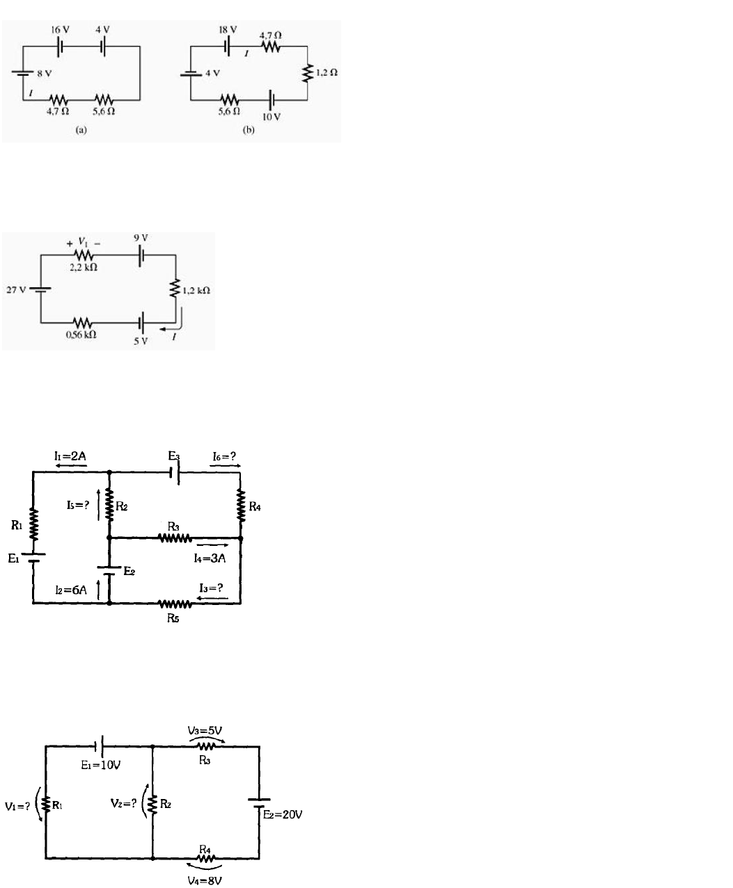 Circuitos Elétricos I - Lista de Exercícios N° 1 Professor: Jonathan Aguiar Esperidon 1) Determine a corrente I e o seu sentido para cada circuito mostrado. Resp. a) 0,388 A – sentido horário b) 2,078 – sentido anti-horário. 2) Determine a corrente I e a tensão V1 para o circuito mostrado abaixo. Resp. I = 3,28 mA, V1 = 7,22 V 3) No circuito abaixo são conhecidos os valores de I1, I2 e I4. Determine I3, I5 e I6 por maio da Lei de Kirchhoff para as correntes. Resp. I3= 4A, I5 = 3A e I6 = 1A 4) No circuito abaixo, são conhecidos os valores de E1, E2, V3 e V4. Determine V1 e V2 por meio da Lei de Kirchhoff para as tensões. Resp. V1 = 3V e V2 = 7V. 5) Tendo como referência a figura abaixo: a) determine V2 levando em conta que R2 = 3R1; b) calcule V3; c) comparando o módulo de V3 com V2 ou V1, determine R3 por inspeção; d) calcule a corrente I da fonte; e) calcule a resistência R3 usando a lei de Ohm e a compare com o resultado da parte (c). Resp. a) V2 = 12V, b) V3 = 24V, c) R3 = 60 Ω, d) I = 0,4A, e) R3 = 60 Ω. 6) Um rádio AM/FM portátil funciona, em condições normais de operação, com as seguintes especificações: 3V/450mW. Qual deve ser o valor do resistor R2 para que esse rádio operar a partir de uma fonte de 12V, conforme montagem abaixo? Obs: o divisor de tensão é formado por R1 e R2 // Rrádio. Resp. R2 = 72Ω 7) Usando a lei de Kirchhoff para as correntes, determine os valores desconhecidos das correntes para o circuito abaixo. Resp. I1 = 3mA, I2 = 1mA, I3 = 1,5mA 8) Determine os valores desconhecidos para os circuitos mostrados abaixo usando as informações fornecidas. Resp: E = 12V, I = 4,333A, R3 = 12 Ω, I2 = 1,333A, I3 = 1A. Resp: E = 30V, R2 = 60Ω, R3 = 60Ω, I1 = 1A, I3 = 0,5A, PR2 = 15 W. 9) Usando a regra do divisor de corrente, determine os valores desconhecidos das correntes nos circuitos abaixo. Resp: I1 = 4A, I2 = 8A. Resp: I1 = 2A, I2 = 4A, I3 = 1A, I4 =1,333A. 10) Considerando fontes idênticas, determine a corrente I e a resistência R para o circuito em paralelo abaixo. Resp: I = 3A, R = 2Ω.