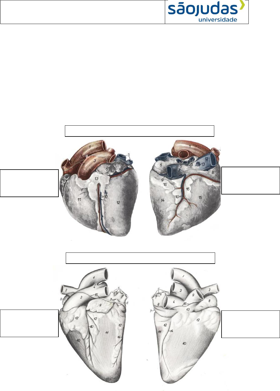 CURSO DE MEDICINA VETERINÁRIA UNIVERSIDADE SÃO JUDAS TADEU CURSO DE MEDICINA VETERINÁRIA DISCIPLINA: ESTRUTURA DOS SISTEMAS VITAIS E REPRODUTOR Identificar a qual espécie cada coração pertence e a face: atrial ou auricular. * Antes de identificar, tente entender o que significa atrial e auricular discutindo com os colegas. ** Os “lados” do coração dos animais não são denominados direito e esquerdo, assim como no ser humano, por que? Discuta com os colegas. *** De maneira geral, o coração dos animais domésticos ocupa quais espaços intercostais? Isso é importante para o conhecimento de disciplinas específicas onde aprenderão, por exemplo, sobre ausculta do coração e quais outras habilidades? Espécie: Espécie: Face: Face: Face: Face: O desenho a seguir foi retirado do livro do Konig. Identifique as partes com a legenda numérica que segue: 1 Ventrículo direito 9 Músculo pectiniforme 2 Ventrículo esquerdo 10 Miocárdio 3 Cordas tendíneas 11 Ápice cardíaco 4 Músculo papilar 12 Trabécula septo marginal 5 Valva átrio-ventricular direita 13 Margem cardíaca esquerda 6 Valva átrio-ventricular esquerda 14 Margem cardíaca direita 7 Valva semi-lunar aóstica 15 Átrio esquerdo 8 Aorta 16 Átrio direito ** Antes de iniciar a identificação das partes anatômicas, discuta com os colegas qual face do coração que foi aberta para a visualização que segue. Justifique. Identifique a espécie e os números do desenho abaixo, retirado do livro do Dyce. Espécie: 1 2 3 4 5 6 7 8 9 10 O desenho abaixo, retirado do livro escrito por Dyce, pode demostrar como funciona o ritmo cardíaco. Demonstre todas as estruturas e fases do ritmo cardíaco, colorindo essas partes no desenho que segue.