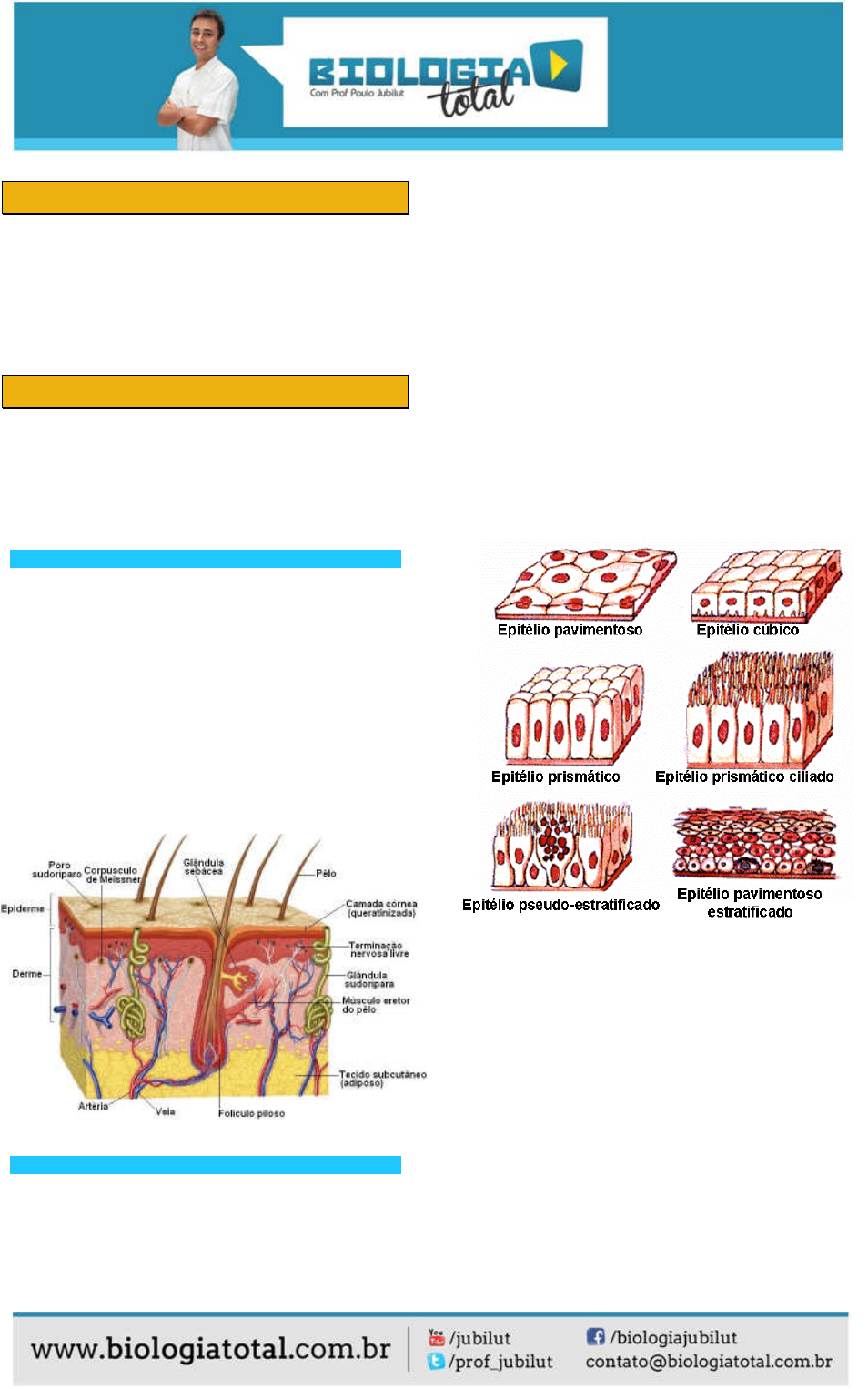 Histologia Animal É o ramo da Biologia que estuda os tecidos animais. Tecidos são grupos de células especializadas, separadas ou não por líquidos e substâncias intercelulares, adaptadas a funções determinadas. Podem ser de quatro tipos: epitelial, conjuntivo, muscular e nervoso. Tecido Epitelial É um tecido formado por células justapostas, com pouca ou nenhuma substância intercelular, com uma camada de glicocálix desenvolvida. O tecido epitelial pode ser encontrado revestindo o corpo humano e formando as glândulas. Suas principais funções são: proteção, secreção, absorção e sensorial. a) Tecido Epitelial de Revestimento Esse revestimento pode ser externo (epiderme) ou interno (forra as cavidades que se comunicam com o exterior) protegendo o organismo contra atritos, invasão de microorganismos ou evaporação e atuando também na absorção de alimentos e oxigênio. Destina-se a duas funções principais: proteção e absorção. Pode se originar de qualquer um dos três folhetos embrionários. O tecido epitelial de revestimento é avascular e sua nutrição é feita pelo tecido conjuntivo adjacente. Está apoiado numa lâmina basal que se encarrega de manter a integridade do epitélio, promovendo a constante renovação das suas células, que apresentam um caráter lábil. Estrutura da pele humana Classificação do Tecido Epitelial de Revestimento 1 - Quanto ao número de camadas celulares: − Simples - quando formado por apenas uma camada de células. − Estratificado - quando formado por várias camadas de células. − Pseudo-estratificado - quando formado por apenas uma camada de células de tamanhos diferentes, que apresentam o núcleo em posições variadas, conferindo ao epitélio uma aparente estratificação. 2 - Quanto à forma das células: − Pavimentoso ou plano - quando as células são achatadas em forma de ladrilhos. − Prismático ou colunar - quando as células têm a forma de prismas (células alongadas). − Cúbico - quando as células têm a forma de um cubo. − Transição - quando constituído por várias camadas de células dotadas de grande flexibilidade e cujo formato varia conforme a distensão ou contração dos órgãos onde ocorre. Exemplos de epitélios 3 - Quanto às especializações da superfície: - Epitélio ciliado – apresenta cílios na superfície livre que se encarregam de eliminar ou reter impurezas. Pode ser encontrado nas vias aéreas superiores e no trato genital feminino. - Epitélio de absorção: neste caso, as células superficiais são dotadas de microvilosidades, como ocorre, por exemplo, no tubo intestinal. - Neuroepitélio – apresenta terminações nervosas sensoriais, como por exemplo na mucosa nasal olfativa. - Epitélio pigmentoso: contém células produtoras de melanina. b) Tecido Epitelial Glandular ou secretor O tecido epitelial secretor é constituído por células especializadas na função de produzir e eliminar substâncias nas superfícies do epitélio ou então na corrente sanguínea. Na maioria dos casos, estas células se agrupam no tecido conjuntivo subjacente formando estruturas chamadas glândulas. Exemplos de estruturas glandulares Classificação das Glândulas 1 - Quanto ao local de eliminação das secreções: Exócrinas - eliminam o produto elaborado na superfície do organismo ou órgão onde se localizam. São dotadas de ductos ou canais de secreção que se comunicam com a superfície. A produção dessas glândulas, geralmente é volumosa e constante. EXEMPLOS: Glândulas mamárias, sudoríparas, salivares, lacrimais, sebáceas, etc. Detalhe do seio e glândulas mamárias Endócrinas - não possuem ductos ou canais de secreção, sendo seus produtos coletadas por vasos sanguíneos. A secreção dessas glândulas recebe o nome genérico de hormônio. São produzidos em pequenas quantidades e atuam em órgãos-alvo. EXEMPLOS: Glândulas hipófise, tireóide, adrenais e paratireóides. Anfícrinas ou Mistas - apresentam duplo comportamento, isto é, são ao mesmo tempo exócrinas e endócrinas. EXEMPLO: Pâncreas Principais glândulas endócrinas e mistas 2 - Quanto ao modo de eliminação das secreções exócrinas: Apócrinas ou Holomerócrinas - as células eliminam a secreção juntamente com parte de seu conteúdo protoplasmático (citoplasma apical onde a secreção fica armazenada). EXEMPLOS: Glândulas mamárias. Holócrinas – o citoplasma celular é eliminado juntamente com o produto de secreção. Neste caso, a atividade da glândula é mantida por um contínuo processo de renovação celular. EXEMPLO: Glândulas sebáceas. Merócrinas - as células eliminam exclusivamente os produtos de secreção, sem prejuízo das células. EXEMPLOS: Glândulas sudoríparas, salivares e lacrimais. Glândula apócrina Glândula holócrina Glândula meródrina 3. Quanto ao número de células: Tecidos Conjuntivos A característica marcante do tecido conjuntivo é que vários tipos de células, além de mostrarem-se com formas e funções diferentes, estão separados por quantidades variáveis de material intercelular. Apesar de existirem algumas variedades deste tecido, todos se estruturam de tal forma que células estão embebidas numa substância fundamental amorfa, de consistência semifluida, na qual se verifica a presença da proteína colágeno, na forma de fibra. A substância fundamental do tecido conjuntivo permite o transporte de células, pequenas partículas, oxigênio e gás carbônico em solução, conferindo-lhe uma função transportadora. Este tecido, além do transporte de substâncias e células, tem a capacidade de reagir a agressões, dar sustentação e de proporcionar reparo estrutural do organismo após vários tipos de traumas. TIPOS CELULARES DO TECIDO CONJUNTIVO 1. Fibroblasto – é a principal célula do tecido conjuntivo. Apresenta núcleo oval, grande e o citoplasma é ramificado. Sua função é produzir e renovar a substância intercelular (proteínas