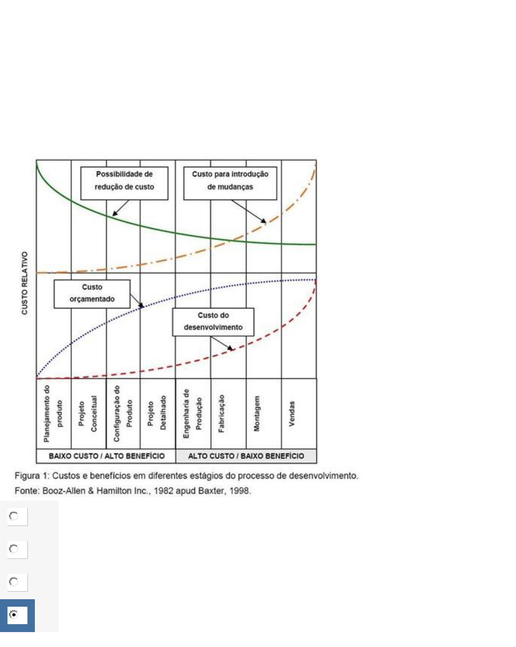 Apol 01 Projeto e Desenvolvimento de Produto Questão 1/5 - Projeto e Desenvolvimento de Produto PROJETO E DESENVOLVIMENTO DE PRODUTO Assinale a alternativa correta. Em relação as características Custo/ Beneficio, apresentadas por Baxter, em qual das fases do projeto poderemos ter a melhor relação custo benefício, ou seja maximizando o beneficio e diminuído os custos? A Projeto detalhado B Montagem C Vendas D Planejamento do produto Questão 2/5 - Projeto e Desenvolvimento de Produto PROJETO E DESENVOLVIMENTO DE PRODUTO Quando trabalhamos a percepção dos clientes para um projeto temos que chamar a atenção para deixar o produto atrativo, segundo o gráfico abaixo temos inúmeras interpretações, segundo a teoria devemos buscar a melhor relação entre complexidade e atenção do cliente, marque a alternativa que representa este ponto ideal. Adaptado: Modelo de Berlyne; Fonte: Baxter (2000, p. 35) A item A B item B C item C D item D Questão 3/5 - Projeto e Desenvolvimento de Produto PROJETO E DESENVOLVIMENTO DE PRODUTO Assinale a alternativa correta. Quando se tem uma marca forte por trás de um produto ou serviço, isso permite que as organizações utilizem formas estratégicas para desenvolver novos produtos e/ou serviços. Normalmente, como se cria uma marca? A Por meio da pesquisa de mercado. B Por meio de um brainstorming na empresa. C Por meio de um produto que teve sucesso no mercado. D Por meio de solicitação de clientes potenciais. Questão 4/5 - Projeto e Desenvolvimento de Produto PROJETO E DESENVOLVIMENTO DE PRODUTO Assinale a alternativa correta. Quando falamos sobre projetos logo vem em mente uma complicação generalizada para estruturarmos um projeto de produto, que pode ser um “Bem” ou um “serviço”, assinale a alternativa onde citamos somente “Bens”. A carro, consultoria, imóvel, máquina de produção; B bicicleta, cadeira, serviços jurídicos, computador; C contabilidade, desenvolvimento de programas computacionais, consultoria, serviços jurídicos; D imóvel, máquina de produção, computador, cadeira; Questão 5/5 - Projeto e Desenvolvimento de Produto PROJETO E DESENVOLVIMENTO DE PRODUTO Quando se fala em produto, o mesmo pode ser um bem ou um serviço fornecido por uma empresa. Existem características distintas que definem a natureza do fornecimento de cada um. Relacione a coluna A (bens puros e/ou serviços puros) com a coluna B (características distintas) e, a seguir, escolha a alternativa que apresenta a sequência correta. COLUNA A COLUNA B 1 – Bens puros ( ) Intangível. ( ) Alto nível de contato com o consumidor. 2 – Serviços puros ( ) A produção precede o consumo. ( ) A qualidade é evidente. A 1 – 2 – 1 – 1 B 2 – 1 – 2 – 2 C 2 – 2 – 1 – 1 D 1 – 2 – 2 – 1