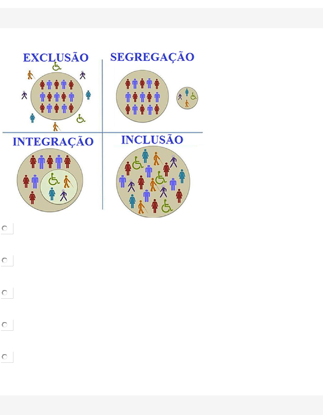 IncorretoPergunta 1 0 / 2 pts Com base na figura abaixo e nos fundamentos de educação inclusiva, os principais agentes responsáveis da inclusão na escola são: os colaboradores da escola e comunidade. a direção escolar e a família. todos os acima. o professor e os alunos. somente o professor e a direção. Pergunta 2 2 / 2 pts Um sistema educacional mais inclusivo apresenta ganhos para a escola, a comunidade, os colaboradores da escola, os alunos, professores e a sociedade como um todo. São razões para um sistema educacional mais inclusivo: I ) Educacional: educar todas as crianças juntas significa que as escolas terão que desenvolver formas de ensino que respondam as diferenças individuais, beneficiando todas as crianças. II) Social: as escolas inclusivas podem mudar atitudes para com aqueles que de alguma forma são “diferentes”. Isso colaborará na criação de uma sociedade justa sem discriminação. III) Econômica: estabelecer e manter escolas que educam todas as crianças juntas será mais barato do que criar um sistema complexo de diferentes tipos de escolas especializadas em diferentes grupos de crianças. Pode-se afirmar que: todas as alternativas são falsas. todas as alternativas são verdadeiras. I e II são verdadeiras. II e III são falsas. Pergunta 3 2 / 2 pts Com relação à definição de deficiência, pode-se afirmar que pessoas com deficiência são aquelas que têm impedimentos de longo prazo de natureza física, mental, intelectual ou sensorial, os quais: em interação com diversas barreiras, podem obstruir sua participação plena e efetiva na sociedade em igualdades de condições com as demais pessoas. podem obstruir sua participação afetiva e cognitiva na sociedade em igualdades de condições com as demais pessoas. em interação com diversas barreiras afetivas e sociais, podem obstruir sua participação educacional na sociedade em igualdades de condições com as demais pessoas. em interação com diversas barreiras, podem obstruir sua participação temporariamente na sociedade. Pergunta 4 2 / 2 pts Para se explicar o homem em sua totalidade, o ser humano biopsicossocial, podem-se utilizar três vias e grandes sínteses. São estas as vias e grandes sínteses: vias: emotiva, afetiva e reativa; sínteses: emoção, consciência, linguagem, pensamento, julgamento, raciocínio, inteligência, personalidade. vias: ativa, afetiva e reativa; sínteses: atenção, consciência, linguagem, pensamento, julgamento, raciocínio, inteligência, personalidade. vias: ativa, afetiva e cognitiva. Sínteses: reação, consciência, linguagem, pensamento, julgamento, patrocínio , inteligência, personalidade. vias: emotiva, afetiva e cognitiva; sínteses: emoção, consciência, linguagem, pensamento, julgamento, raciocínio , inteligência, personalidade. vias: ativa, afetiva e cognitiva; sínteses: atenção, consciência, linguagem, pensamento, julgamento, raciocínio , inteligência, personalidade. Pergunta 5 2 / 2 pts Na psicanálise, Freud distinguiu três níveis de consciência em sua inicial divisão topográfica da mente. Nesse sentido, é incorreto afirmar que: o consciente diz respeito à capacidade de ter percepção dos sentimentos, pensamentos, lembranças e fantasias do momento. o pré-consciente relaciona-se aos conteúdos que podem facilmente chegar à consciência. o inconsciente refere-se ao material não disponível à consciência ou ao escrutínio do indivíduo. a psicanalise é composta pelo consciente, pré-consciente e inconsciente, estudo da hipnose e comportamento. Pergunta 6 2 / 2 pts Analise as afirmativas: I) Psicologia é o estudo científico dos processos mentais e do comportamento do ser humano e as suas interações com o ambiente físico e social. Outros afirmam que a psicologia é o estudo do comportamento. II) O objetivo da psicologia é exclusivamente diagnosticar, prevenir e tratar distúrbios emocionais e doenças mentais. III) A palavra psicologia provém dos termos gregos psico (alma ou atividade mental) e logía (estudo). IV) Algumas áreas da atuação da Psicologia no cotidiano: psicologia clínica, psicologia organizacional, psicologia escolar, psicologia do esporte. Estão corretas as afirmativas: I, II e III. Todas as alternativas estão erradas. I, II e IV. II, III e IV. I, III e IV. Todas as alternativas estão corretas. Pergunta 7 2 / 2 pts Da teoria das inteligências múltiplas de Gardner estão a inteligência_________, que expressa a capacidade de se conhecer, é a mais rara inteligência sob domínio do ser humano, pois está ligada à capacidade de neutralização dos vícios, entendimento de crenças, limites, preocupações, estilo de vida profissional, autocontrole e domínio dos causadores de estresse, e a inteligência_________, que é expressa pela habilidade de entender as intenções, motivações e desejos dos outros. Encontra-se mais desenvolvida em políticos, religiosos e professores. O trecho apresenta as seguintes inteligências, segundo Gardner: naturalista e existencial. musical e linguística intrapessoal e interpessoal. espacial e corporal. IncorretoPergunta 8 0 / 2 pts O senso comum gera confusão e mal-entendidos quando se trata de definir e diferenciar a psicologia da psiquiatria. A definição de Psicologia é a ciência que trata dos estados e processos mentais, do comportamento do ser humano e de suas interações com um ambiente físico e social. Sobre o assunto, aponte a alternativa correta. Todas as alternativas estão erradas. A psiquiatria inclui subespecialidades, como a psicopatologia (que estuda os processos que podem levar à insanidade mental), a psicofarmacologia (dedicada à análise dos efeitos dos fármacos nos tratamentos comportamentais, emocionais ou cognitivos) e a sexologia (o estudo esquemático da sexualidade humana). Todas as alternativas estão corretas. Uma pergunta não invasiva para um aluno, quando ele informa que irá a um psiquiatra, é que tipo