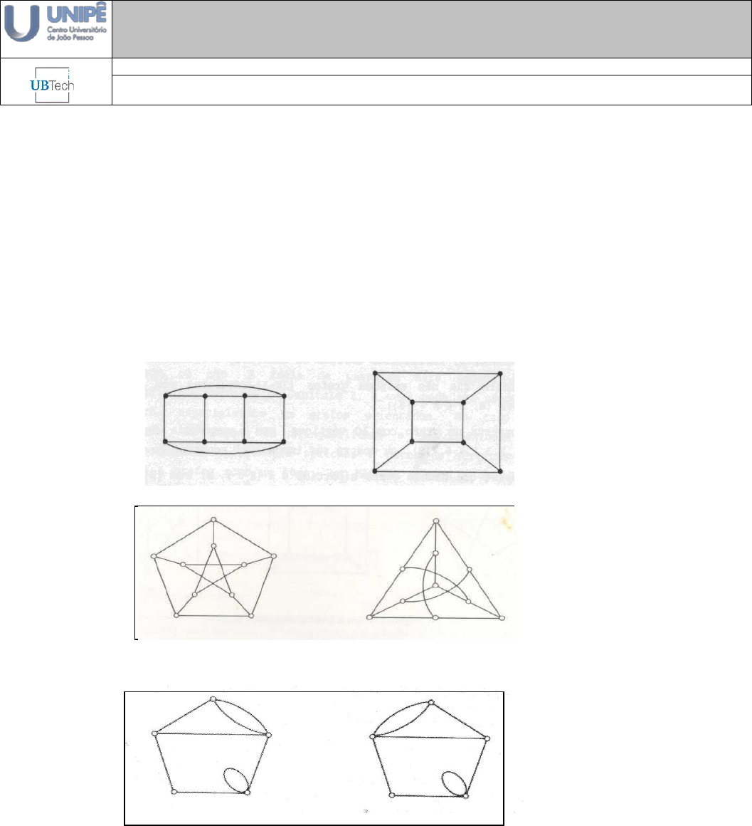 CENTRO UNIVERSITÁRIO DE JOÃO PESSOA PRÓ-REITORIA DE ENSINO DE GRADUAÇÃO – PR-EG CURSO: REDES DE COMPUTADORES LISTA DE EXERCÍCIOS: TERORIA DOS GRAFOS PROFESSOR SALATIEL DIAS 1. Construir uma representação geométrica do grafo G = (V,E), onde: V = {1,2,3,4,5,6} E = {(1,3), (1,4), (1,5), (2,3),(2,4),(2,5),(3,5),(4,5)} 2. Represente o grafo da questão anterior através de suas matrizes de adjacência e de incidência. 3. Identifique se os grafos a seguir são isomorfos: a) b) c) 4. Sobre o problema das pontes de Königsberg: a) ele tem solução? b) Qual o teorema que se reporta a esse problema? c) O que teria de ser alterado no cenário de Königsberg para resolver esse problema. Apresente sugestões. 5. Seja I a matriz de Incidência e seja A a matriz de Adjacência de um grafo G. a) Mostre que a soma de toda coluna de I é 2 b) O que representa a soma de todas as colunas de A? c) As matrizes I e A caracterizam univocamente um grafo? 6. Prove o seguinte teorema: grau (v) = 2 n, onde n = número de arestas, vV 7. Prove o seguinte corolário Em qualquer grafo, o número de vértices de grau ímpar é sempre par. 8. Existe um grafo simples com cinco vértices dos seguintes graus? Se existir, desenhe um possível grafo. a) 3, 3, 3, 3, 2 b) 1, 2, 3, 4, 5 c) 1, 2, 3, 4, 4 d) 3, 4, 3, 4, 3 e) 0,1, 2, 2, 3 f) 1, 1, 1, 1, 1 9. Represente através das matrizes de incidência e de adjacência os grafos da questão 8. 10. Em relação ao grafo a seguir. a) Qual a ordem do grafo? b) Quantas arestas o grafo possui?