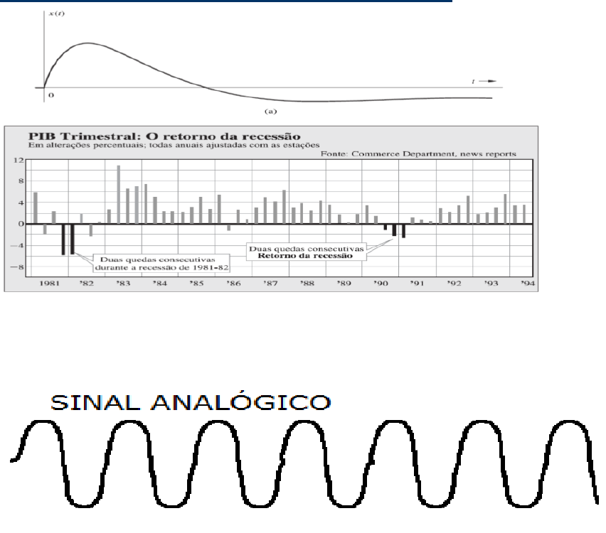 Um sinal geralmente contém informação sobre algum fenômeno ou acontecimento. Sinais é um conjunto de dados ou informações. Temos como exemplos de sinais: um sinal de telefone ou de televisão, o registro de venda de uma corporação. Esses exemplos apresentam sinais como funções independentes do tempo, mas nem todos os casos são iguais a esses. No caso de uma descarga elétrica em um corpo qualquer, o sinal é a densidade da carga. Nessa circunstância, que é uma função do espaço em vez do tempo. Quando falamos ao telefone, o sinal acústico é convertido em sinais elétricos pelo microfone. Por exemplo, um outro sinal é transmitido por um sistema de satélites e recebido do outro lado da terra e convertido novamente num sinal de voz. Os sinais se classificam em: Sinais Contínuos. É um sinal especificado para valores contínuos no tempo (t). Amplitude pode assumir qualquer valor real ou complexo em um instante de tempo ou para cada amostra. Ex: Saída de um telefone, câmara de vídeo, etc. Sinais Discretos: Sinais definidos apenas em determinados instantes de tempo. Amplitude pode assumir qualquer valor real ou complexo pertencente a um conjunto discreto. Ex: PIB trimestral. Sinais Analógicos: É um sinal cuja amplitude pode assumir infinitos valores. Ex: Telefonia fixa, celulares, televisão, etc. Sinais Digitais: É um sinal cuja amplitude pode assumir apenas alguns números finitos de valores; Ex: Sinais associados a um computador digital, pois podem assumir dois valores (0 ou 1) - sinais binários. Sinais Periódicos: Apresentam uma repetição de seus valores de amplitude a intervalos regulares de tempo. Um sinal é dito periódico se x (t) = x (t+T0) para todo t e de duração infinita. Sinais Aperiódicos: Sinais limitados no tempo são sinais não periódicos e concentrados em intervalos de tempo com duração bem definida. Não existe T0 que satisfaça a condição de periodicidade – Não apresentam uma repetição de seus valores de amplitude a intervalos regulares de tempo. É um sinal que não possui um período. Sinais Determinísticos: São aqueles que podem ser descritos sem nenhuma incerteza, pode ser reproduzido de maneira exata e repetida, seja através de um gráfico ou expressão matemática. É possível determinar precisamente o valor do sinal em um dado instante de tempo. Ex: f (t) =Acos (ωot), onde Ae ωo são constantes. Sinais Aleatórios: É um sinal que não pode ser descrito com certeza antes de ocorrer. Ex: Exame ECG, ruído, etc. Além desses, existem os sinais fisicamente realizáveis, que são sinais práticos que podem ser medidos num laboratório. Basicamente, estes sinais satisfazem às seguintes condições: São sinais limitados no tempo; São sinais limitados em amplitude; Suas componentes espectrais significativas concentram-se num intervalo de frequências finito; Sua forma de onda é uma função temporal contínua; Sua forma de onda assume apenas valores reais. Por sua vez, um sinal é considerado par se é simétrico em relação à origem: x (t) =x (-t). Um sinal é ímpar se é antissimétrico em relação à origem: x (t) =-x (-t). Sinal par e (b) Sinal ímpar Um sinal senoidal é representado por , onde A é a amplitude; Ꞷ0 é a frequência angular, medida em radianos por segundo; f0=2π/Ꞷ0 é a frequência medida em ciclos por segundo ou Hertz; Ф é a fase, medida em radianos. O sinal x (t) é periódico com período: O processo que tem à sua entrada um ou mais sinais, resultando em um outro conjunto de sinais é denominado “sistemas”. Estes podem modificá-los ou extrair informações adicionais. Podem ser construídos com componente físicos, elétricos, mecânicos ou sistemas hidráulicos. Entre os sistemas mais comuns está o rádio, que converte ondas eletromagnéticas captadas por sua antena em sinais sonoros audíveis. Dentro deste sistema rádio, existem subsistemas responsáveis por determinadas tarefas específicas, como por exemplo os alto-falantes, que convertem sinais elétricos em variações de pressão, que é o som. Este sistema é chamado de transdutor. Um outro sistema envolvido na recepção de ondas de rádio é um filtro que reduz ruídos e interferências que tendem a prejudicar a recepção. Representação de um sistema. Outro sistema comum ao nosso dia a dia são os amplificadores de áudio, que eleva/atenua o nível do sinal. Portanto, um sistema pode ser visto como um processo que tem à sua entrada um ou mais sinais, e que produz um outro (s) sinal (is) na sua saída, ou, em outras palavras, produz uma transformação nos sinais de entrada. Um sistema é chamado sem memória ou estático se a saída y (t), num determinado instante, depende da entrada x (t) apenas naquele instante, não depende de entradas anteriores nem posteriores. No caso contrário, o sistema é dito com memória ou dinâmico.