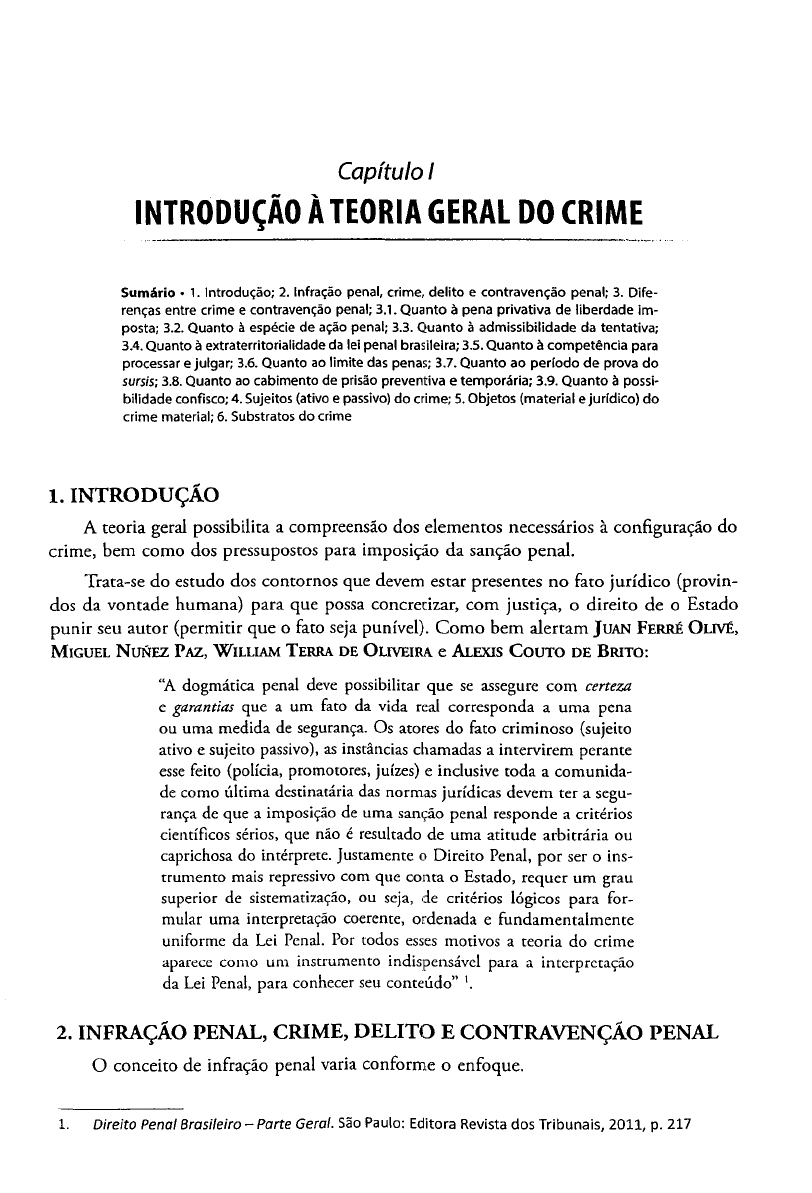 Sumário • 1. Introdução; 2. Infração penal, crime, delito e contravenção penal; 3. Dife-